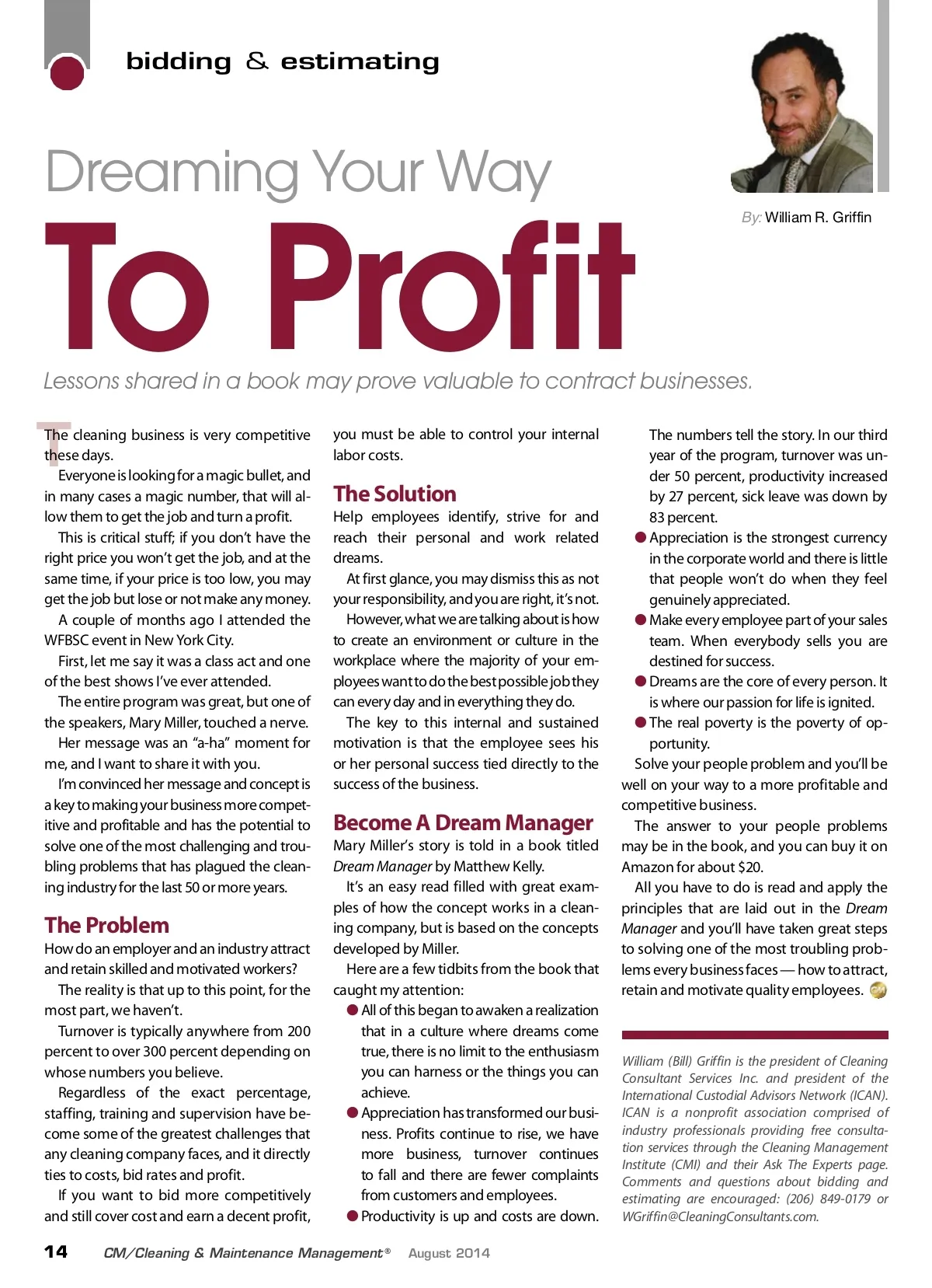 bidding & estimating Dreaming Your Way Lessons shared in a book may prove valuable to contract businesses. To Profit you must be able to control your internal labor costs. By: William R. Griffin T The cleaning business is very competitive these days. Everyone is looking for a magic bullet, and in many cases a magic number, that will al-low them to get the job and turn a profit. This is critical stuff; if you don’t have the right price you won’t get the job, and at the same time, if your price is too low, you may get the job but lose or not make any money. A couple of months ago I attended the WFBSC event in New York City. First, let me say it was a class act and one of the best shows I’ve ever attended. The entire program was great, but one of the speakers, Mary Miller, touched a nerve. Her message was an “a-ha” moment for me, and I want to share it with you. I’m convinced her message and concept is a key to making your business more compet-itive and profitable and has the potential to solve one of the most challenging and trou-bling problems that has plagued the clean-ing industry for the last 50 or more years. The Solution Help employees identify, strive for and reach their personal and work related dreams. At first glance, you may dismiss this as not your responsibility, and you are right, it’s not. However, what we are talking about is how to create an environment or culture in the workplace where the majority of your em-ployees want to do the best possible job they can every day and in everything they do. The key to this internal and sustained motivation is that the employee sees his or her personal success tied directly to the success of the business. Become A Dream Manager Mary Miller’s story is told in a book titled Dream Manager by Matthew Kelly. It’s an easy read filled with great exam-ples of how the concept works in a clean-ing company, but is based on the concepts developed by Miller. Here are a few tidbits from the book that caught my attention: ● All of this began to awaken a realization that in a culture where dreams come true, there is no limit to the enthusiasm you can harness or the things you can achieve. ● Appreciation has transformed our busi-ness. Profits continue to rise, we have more business, turnover continues to fall and there are fewer complaints from customers and employees. ● Productivity is up and costs are down. August 2014 The Problem How do an employer and an industry attract and retain skilled and motivated workers? The reality is that up to this point, for the most part, we haven’t. Turnover is typically anywhere from 200 percent to over 300 percent depending on whose numbers you believe. Regardless of the exact percentage, staffing, training and supervision have be-come some of the greatest challenges that any cleaning company faces, and it directly ties to costs, bid rates and profit. If you want to bid more competitively and still cover cost and earn a decent profit, The numbers tell the story. In our third year of the program, turnover was un-der 50 percent, productivity increased by 27 percent, sick leave was down by 83 percent. ● Appreciation is the strongest currency in the corporate world and there is little that people won’t do when they feel genuinely appreciated. ● Make every employee part of your sales team. When everybody sells you are destined for success. ● Dreams are the core of every person. It is where our passion for life is ignited. ● The real poverty is the poverty of op-portunity. Solve your people problem and you’ll be well on your way to a more profitable and competitive business. The answer to your people problems may be in the book, and you can buy it on Amazon for about $20. All you have to do is read and apply the principles that are laid out in the Dream Manager and you’ll have taken great steps to solving one of the most troubling prob-lems every business faces — how to attract, retain and motivate quality employees. William (Bill) Griffin is the president of Cleaning Consultant Services Inc. and president of the International Custodial Advisors Network (ICAN). ICAN is a nonprofit association comprised of industry professionals providing free consulta-tion services through the Cleaning Management Institute (CMI) and their Ask The Experts page. Comments and questions about bidding and estimating are encouraged: (206) 849-0179 or [email protected]. 14 CM/Cleaning & Maintenance Management ®