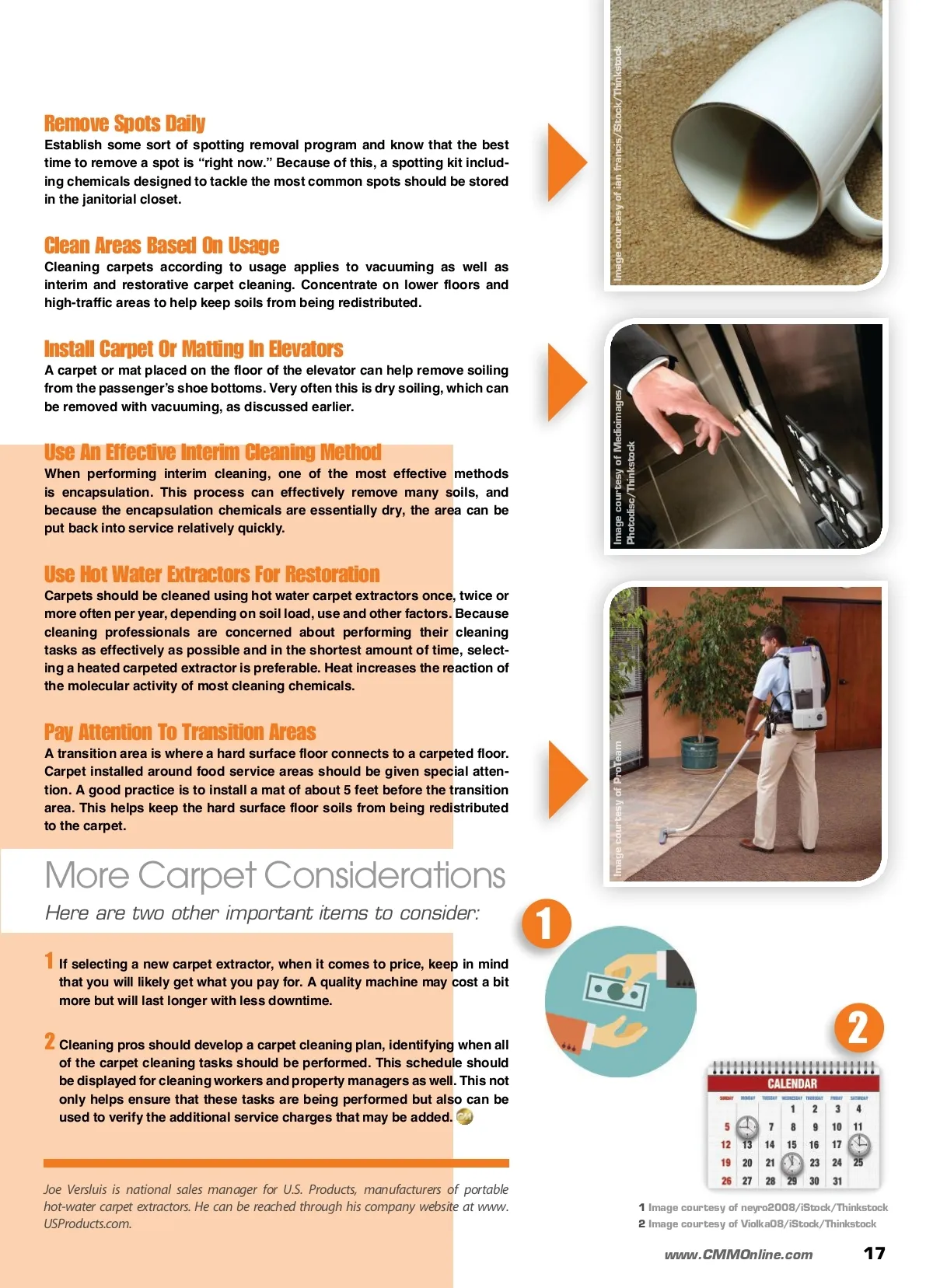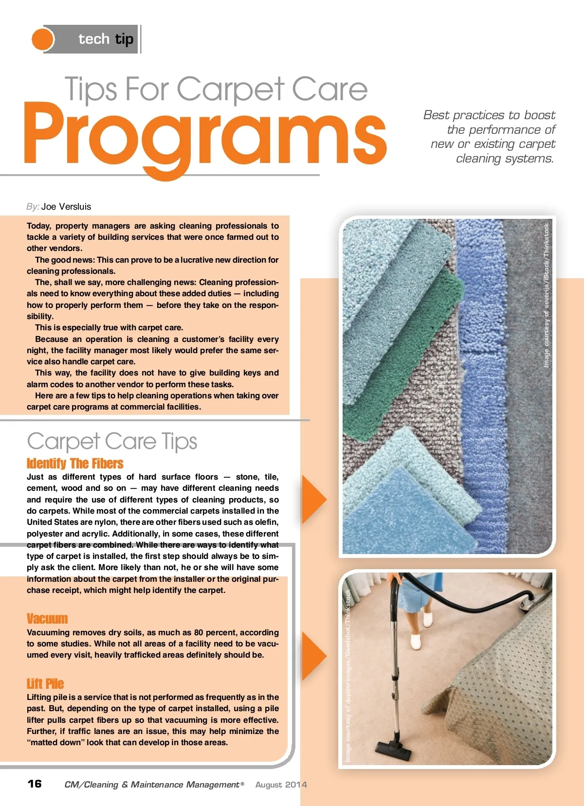 tech tip Programs By: Joe Versluis Today, property managers are asking cleaning professionals to tackle a variety of building services that were once farmed out to other vendors. The good news: This can prove to be a lucrative new direction for cleaning professionals. The, shall we say, more challenging news: Cleaning profession-als need to know everything about these added duties — including how to properly perform them — before they take on the respon-sibility. This is especially true with carpet care. Because an operation is cleaning a customer’s facility every night, the facility manager most likely would prefer the same ser-vice also handle carpet care. This way, the facility does not have to give building keys and alarm codes to another vendor to perform these tasks. Here are a few tips to help cleaning operations when taking over carpet care programs at commercial facilities. Tips For Carpet Care Best practices to boost the performance of new or existing carpet cleaning systems. Carpet Care Tips Identify The Fibers Vacuum Vacuuming removes dry soils, as much as 80 percent, according to some studies. While not all areas of a facility need to be vacu-umed every visit, heavily trafficked areas definitely should be. Lift Pile Lifting pile is a service that is not performed as frequently as in the past. But, depending on the type of carpet installed, using a pile lifter pulls carpet fibers up so that vacuuming is more effective. Further, if traffic lanes are an issue, this may help minimize the “matted down” look that can develop in those areas. 16 CM/Cleaning & Maintenance Management ® August 2014 Image courtesy of Jupiterimages/Goodshot/Thinkstock Just as different types of hard surface floors — stone, tile, cement, wood and so on — may have different cleaning needs and require the use of different types of cleaning products, so do carpets. While most of the commercial carpets installed in the United States are nylon, there are other fibers used such as olefin, polyester and acrylic. Additionally, in some cases, these different carpet fibers are combined. While there are ways to identify what type of carpet is installed, the first step should always be to sim-ply ask the client. More likely than not, he or she will have some information about the carpet from the installer or the original pur-chase receipt, which might help identify the carpet. Image courtesy of severija/iStock/Thinkstock