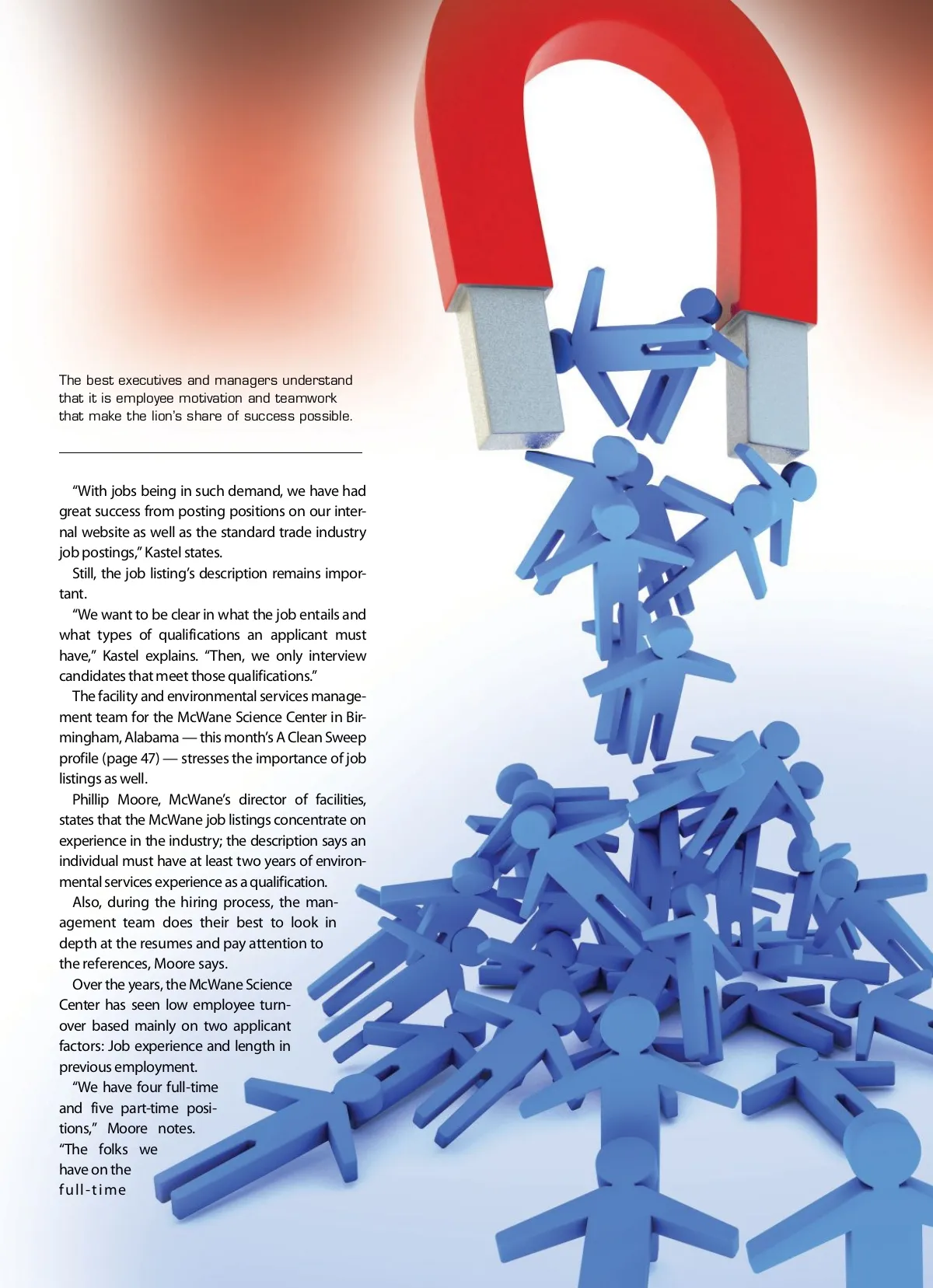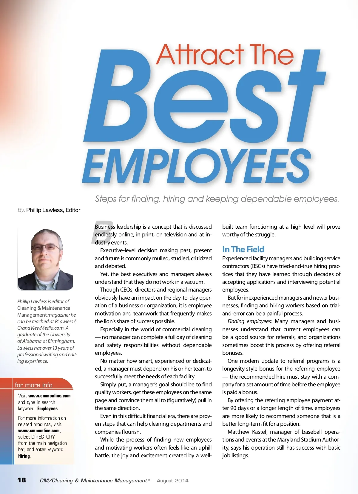 Best EMPLOYEES Steps for finding, hiring and keeping dependable employees. By: Phillip Lawless, Editor Attract The B Phillip Lawless is editor of Cleaning & Maintenance Management magazine; he can be reached at PLawless@ GrandViewMedia.com. A graduate of the University of Alabama at Birmingham, Lawless has over 13 years of professional writing and edit-ing experience. for more info Visit www.cmmonline.com and type in search keyword: Employees . For more information on related products, visit www.cmmonline.com , select DIRECTORY from the main navigation bar, and enter keyword: Hiring . Business leadership is a concept that is discussed endlessly online, in print, on television and at in-dustry events. Executive-level decision making past, present and future is commonly mulled, studied, criticized and debated. Yet, the best executives and managers always understand that they do not work in a vacuum. Though CEOs, directors and regional managers obviously have an impact on the day-to-day oper-ation of a business or organization, it is employee motivation and teamwork that frequently makes the lion’s share of success possible. Especially in the world of commercial cleaning — no manager can complete a full day of cleaning and safety responsibilities without dependable employees. No matter how smart, experienced or dedicat-ed, a manager must depend on his or her team to successfully meet the needs of each facility. Simply put, a manager’s goal should be to find quality workers, get these employees on the same page and convince them all to (figuratively) pull in the same direction. Even in this difficult financial era, there are prov-en steps that can help cleaning departments and companies flourish. While the process of finding new employees and motivating workers often feels like an uphill battle, the joy and excitement created by a well-built team functioning at a high level will prove worthy of the struggle. In The Field Experienced facility managers and building service contractors (BSCs) have tried-and-true hiring prac-tices that they have learned through decades of accepting applications and interviewing potential employees. But for inexperienced managers and newer busi-nesses, finding and hiring workers based on trial-and-error can be a painful process. Finding employees: Many managers and busi-nesses understand that current employees can be a good source for referrals, and organizations sometimes boost this process by offering referral bonuses. One modern update to referral programs is a longevity-style bonus for the referring employee — the recommended hire must stay with a com-pany for a set amount of time before the employee is paid a bonus. By offering the referring employee payment af-ter 90 days or a longer length of time, employees are more likely to recommend someone that is a better long-term fit for a position. Matthew Kastel, manager of baseball opera-tions and events at the Maryland Stadium Author-ity, says his operation still has success with basic job listings. 18 CM/Cleaning & Maintenance Management ® August 2014