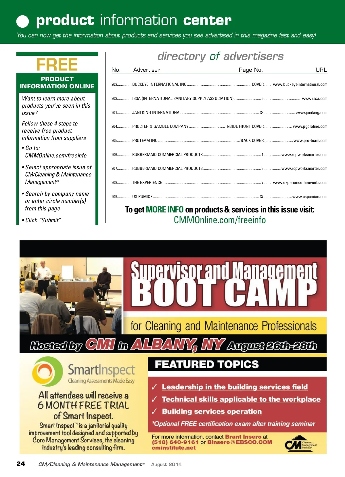 product information center You can now get the information about products and services you see advertised in this magazine fast and easy! FREE PRODUCT INFORMATION ONLINE Want to learn more about products you’ve seen in this issue? Follow these 4 steps to receive free product information from suppliers • Go to: CMMOnline.com/freeinfo • Select appropriate issue of CM/Cleaning & Maintenance Management ® • Search by company name or enter circle number(s) from this page • Click “Submit” directory of advertisers No. Advertiser Page No. URL 202............... BUCKEYE INTERNATIONAL INC ....................................................................COVER ......... www.buckeyeinternational.com 203............... ISSA (INTERNATIONAL SANITARY SUPPLY ASSOCIATION) ............................. 5 ........................................ www.issa.com 201............... JANI KING INTERNATIONAL .................................................................................. 33 ................................. www.janiking.com 204............... PROCTER & GAMBLE COMPANY ...................................... INSIDE FRONT COVER .............................. www.pgproline.com 205............... PROTEAM INC ....................................................................................... BACK COVER ...............................www.pro-team.com 206............... RUBBERMAID COMMERCIAL PRODUCTS ............................................................. 1 .................. www.rcpworksmarter.com 207............... RUBBERMAID COMMERCIAL PRODUCTS ............................................................. 3 .................. www.rcpworksmarter.com 208............... THE EXPERIENCE ........................................................................................................ 7 ......... www.experiencetheevents.com 209............... US PUMICE ................................................................................................................ 37 ..............................www.uspumice.com To get MORE INFO on products & services in this issue visit: CMMOnline.com/freeinfo 24 CM/Cleaning & Maintenance Management ® August 2014