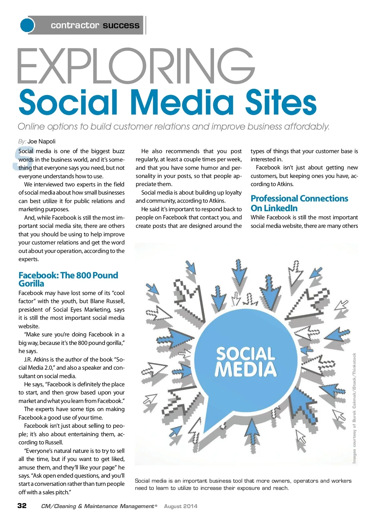 contractor success EXPLORING Social Media Sites Online options to build customer relations and improve business affordably. By: Joe Napoli S Social media is one of the biggest buzz words in the business world, and it’s some-thing that everyone says you need, but not everyone understands how to use. We interviewed two experts in the field of social media about how small businesses can best utilize it for public relations and marketing purposes. And, while Facebook is still the most im-portant social media site, there are others that you should be using to help improve your customer relations and get the word out about your operation, according to the experts. He also recommends that you post regularly, at least a couple times per week, and that you have some humor and per-sonality in your posts, so that people ap-preciate them. Social media is about building up loyalty and community, according to Atkins. He said it’s important to respond back to people on Facebook that contact you, and create posts that are designed around the types of things that your customer base is interested in. Facebook isn’t just about getting new customers, but keeping ones you have, ac-cording to Atkins. Professional Connections On LinkedIn While Facebook is still the most important social media website, there are many others Facebook: The 800 Pound Gorilla Facebook may have lost some of its “cool factor” with the youth, but Blane Russell, president of Social Eyes Marketing, says it is still the most important social media website. “Make sure you’re doing Facebook in a big way, because it’s the 800 pound gorilla,” he says. J.R. Atkins is the author of the book “So-cial Media 2.0,” and also a speaker and con-sultant on social media. He says, “Facebook is definitely the place to start, and then grow based upon your market and what you learn from Facebook.” The experts have some tips on making Facebook a good use of your time. Facebook isn’t just about selling to peo-ple; it’s also about entertaining them, ac-cording to Russell. “Everyone’s natural nature is to try to sell all the time, but if you want to get liked, amuse them, and they’ll like your page” he says. “Ask open ended questions, and you’ll start a conversation rather than turn people off with a sales pitch.” Social media is an important business tool that more owners, operators and workers need to learn to utilize to increase their exposure and reach. August 2014 32 CM/Cleaning & Maintenance Management ® Images courtesy of Burak Cakmak/iStock/Thinkstock
