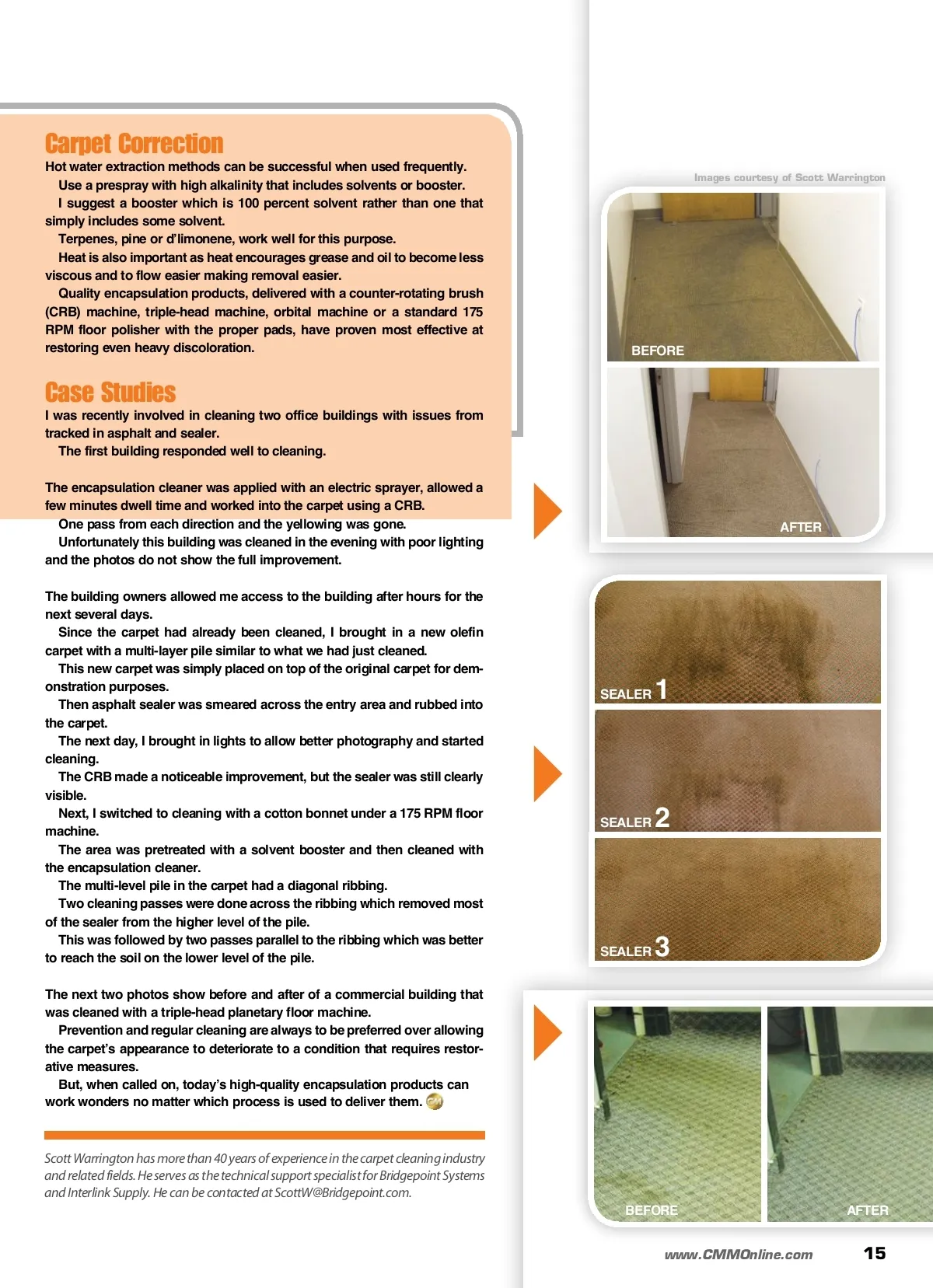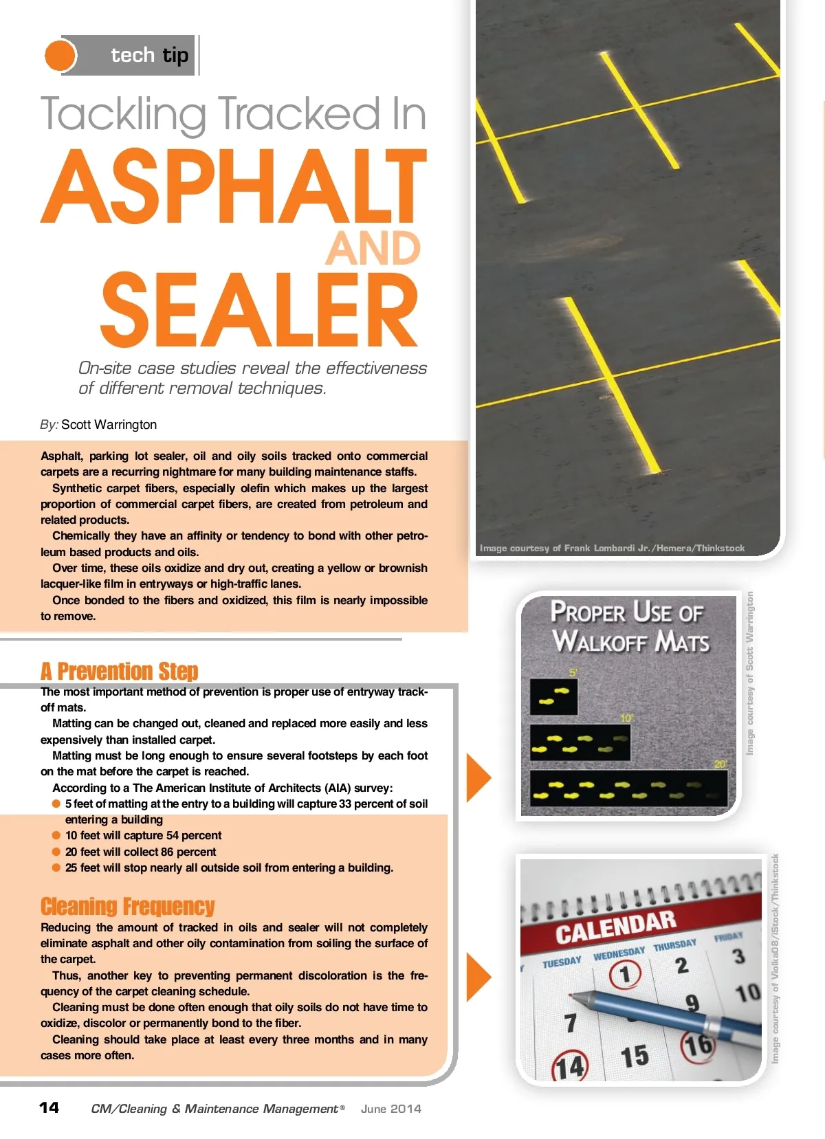 tech tip Tackling Tracked In ASPHALT AND SEALER On-site case studies reveal the effectiveness of different removal techniques. By: Scott Warrington Asphalt, parking lot sealer, oil and oily soils tracked onto commercial carpets are a recurring nightmare for many building maintenance staffs. Synthetic carpet fibers, especially olefin which makes up the largest proportion of commercial carpet fibers, are created from petroleum and related products. Chemically they have an affinity or tendency to bond with other petro-leum based products and oils. Over time, these oils oxidize and dry out, creating a yellow or brownish lacquer-like film in entryways or high-traffic lanes. Once bonded to the fibers and oxidized, this film is nearly impossible to remove. Image courtesy of Frank Lombardi Jr./Hemera/Thinkstock A Prevention Step The most important method of prevention is proper use of entryway track-off mats. Matting can be changed out, cleaned and replaced more easily and less expensively than installed carpet. Matting must be long enough to ensure several footsteps by each foot on the mat before the carpet is reached. According to a The American Institute of Architects (AIA) survey: ● 5 feet of matting at the entry to a building will capture 33 percent of soil entering a building ● 10 feet will capture 54 percent ● 20 feet will collect 86 percent ● 25 feet will stop nearly all outside soil from entering a building. Image courtesy of Scott Warrington Image courtesy of Violka08/iStock/Thinkstock Cleaning Frequency Reducing the amount of tracked in oils and sealer will not completely eliminate asphalt and other oily contamination from soiling the surface of the carpet. Thus, another key to preventing permanent discoloration is the fre-quency of the carpet cleaning schedule. Cleaning must be done often enough that oily soils do not have time to oxidize, discolor or permanently bond to the fiber. Cleaning should take place at least every three months and in many cases more often. 14 CM/Cleaning & Maintenance Management ® June 2014