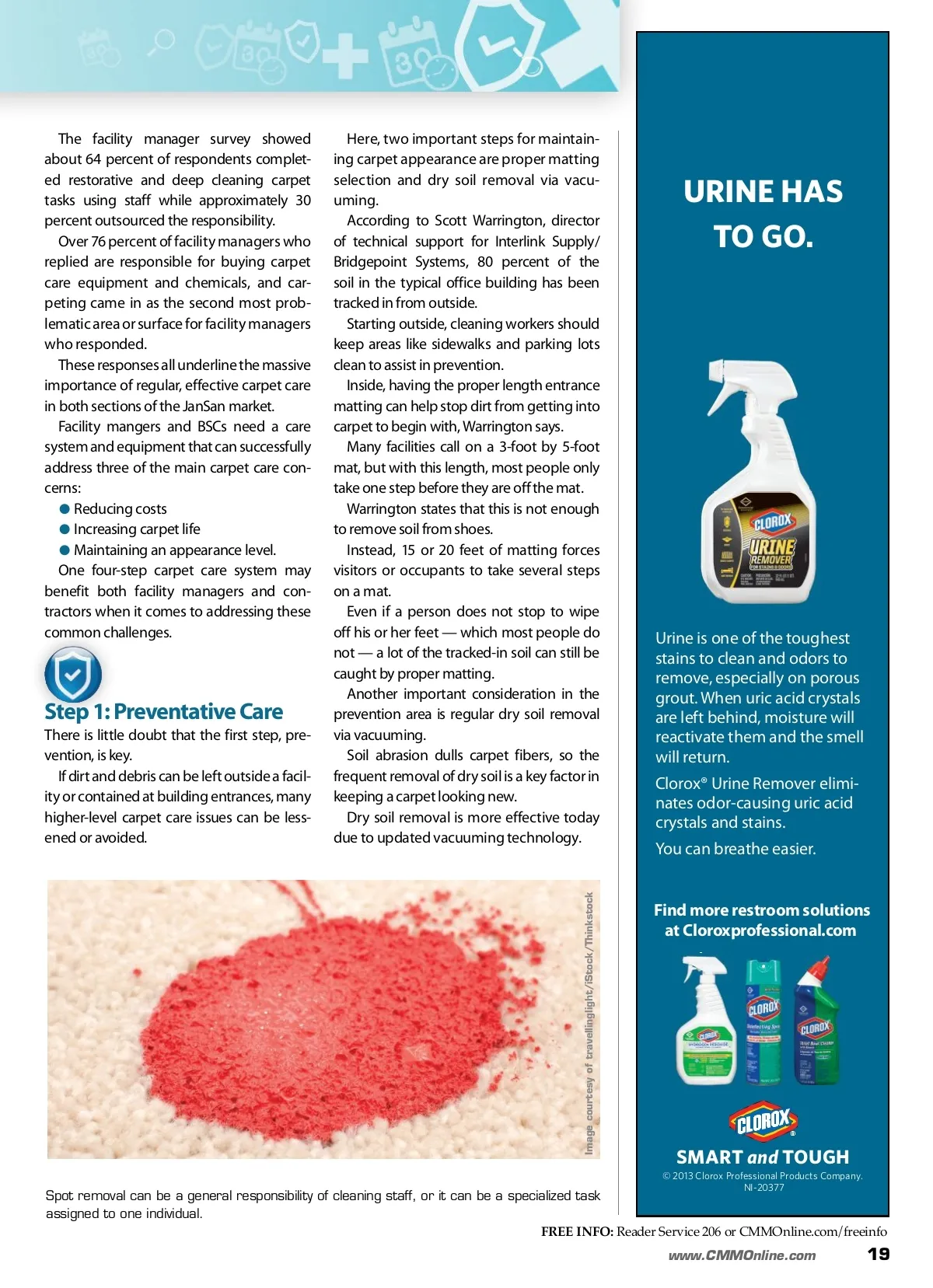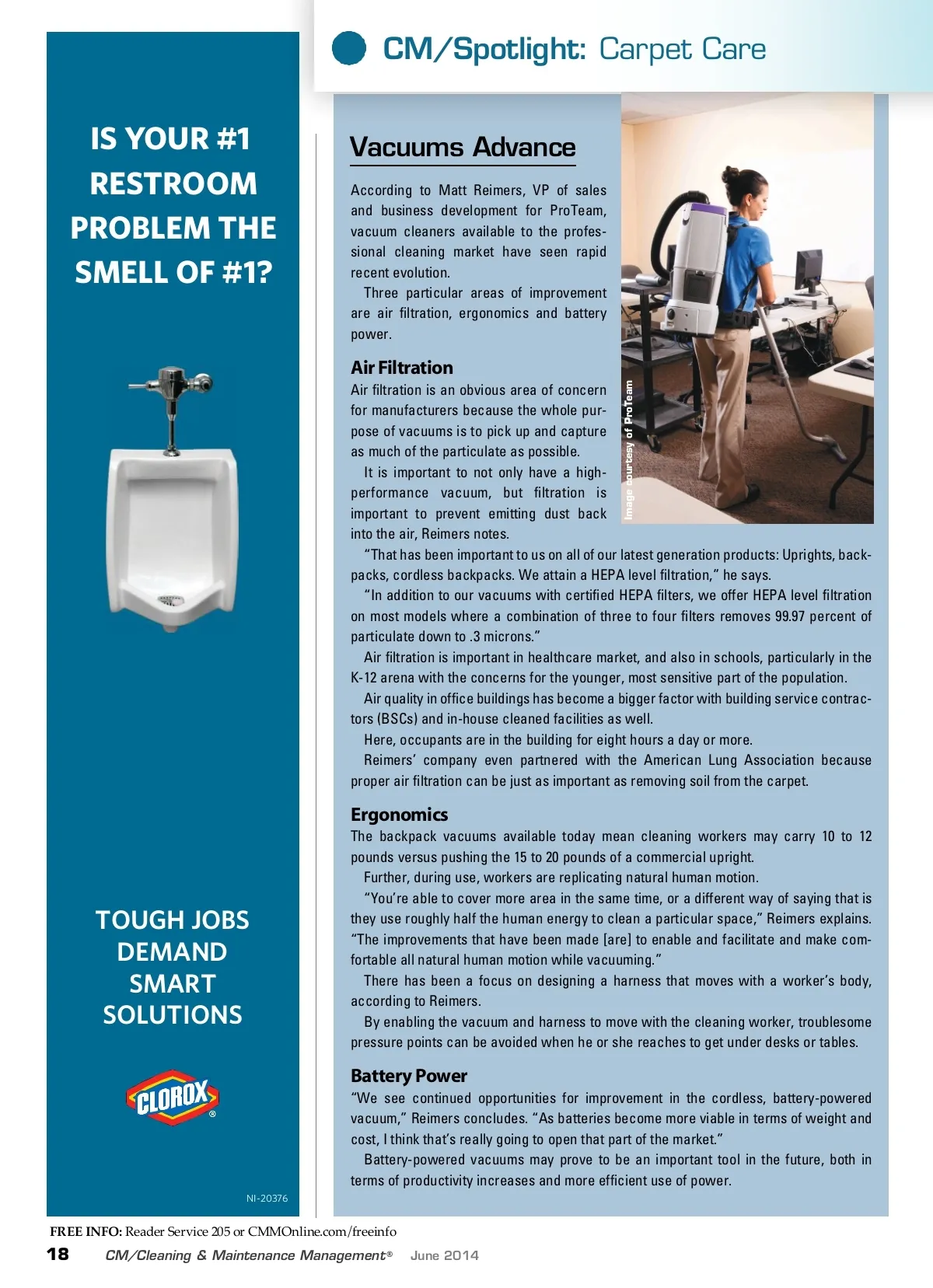 CM/Spotlight: Carpet Care IS YOUR #1 RESTROOM PROBLEM THE SMELL OF #1? Vacuums Advance According to Matt Reimers, VP of sales and business development for ProTeam, vacuum cleaners available to the profes-sional cleaning market have seen rapid recent evolution. Three particular areas of improvement are air filtration, ergonomics and battery power. Air Filtration Air filtration is an obvious area of concern for manufacturers because the whole pur-pose of vacuums is to pick up and capture as much of the particulate as possible. It is important to not only have a high-performance vacuum, but filtration is important to prevent emitting dust back into the air, Reimers notes. “That has been important to us on all of our latest generation products: Uprights, back-packs, cordless backpacks. We attain a HEPA level filtration,” he says. “In addition to our vacuums with certified HEPA filters, we offer HEPA level filtration on most models where a combination of three to four filters removes 99.97 percent of particulate down to .3 microns.” Air filtration is important in healthcare market, and also in schools, particularly in the K-12 arena with the concerns for the younger, most sensitive part of the population. Air quality in office buildings has become a bigger factor with building service contrac-tors (BSCs) and in-house cleaned facilities as well. Here, occupants are in the building for eight hours a day or more. Reimers’ company even partnered with the American Lung Association because proper air filtration can be just as important as removing soil from the carpet. Image courtesy of ProTeam Ergonomics The backpack vacuums available today mean cleaning workers may carry 10 to 12 pounds versus pushing the 15 to 20 pounds of a commercial upright. Further, during use, workers are replicating natural human motion. “You’re able to cover more area in the same time, or a different way of saying that is they use roughly half the human energy to clean a particular space,” Reimers explains. “The improvements that have been made [are] to enable and facilitate and make com-fortable all natural human motion while vacuuming.” There has been a focus on designing a harness that moves with a worker’s body, according to Reimers. By enabling the vacuum and harness to move with the cleaning worker, troublesome pressure points can be avoided when he or she reaches to get under desks or tables. TOUGH JOBS DEMAND SMART SOLUTIONS Battery Power “We see continued opportunities for improvement in the cordless, battery-powered vacuum,” Reimers concludes. “As batteries become more viable in terms of weight and cost, I think that’s really going to open that part of the market.” Battery-powered vacuums may prove to be an important tool in the future, both in terms of productivity increases and more efficient use of power. NI-20376 FREE INFO: Reader Service 205 or CMMOnline.com/freeinfo 18 CM/Cleaning & Maintenance Management ® June 2014