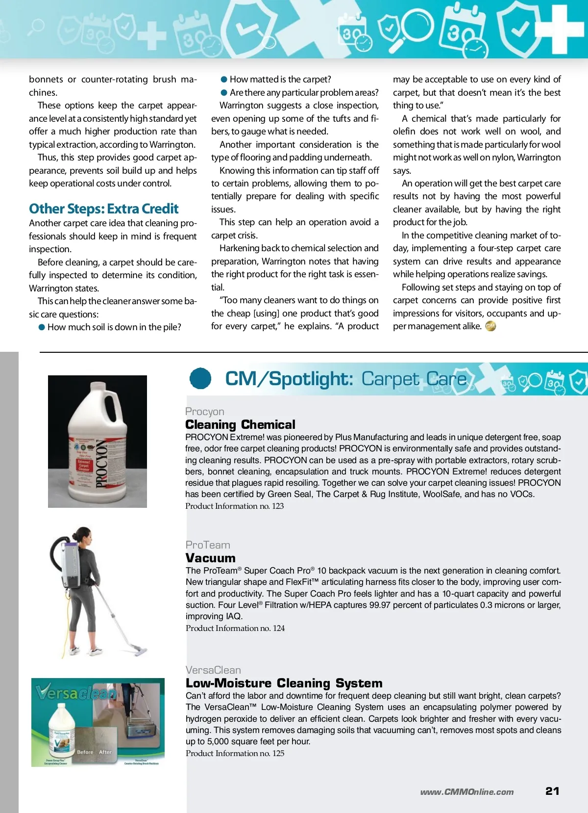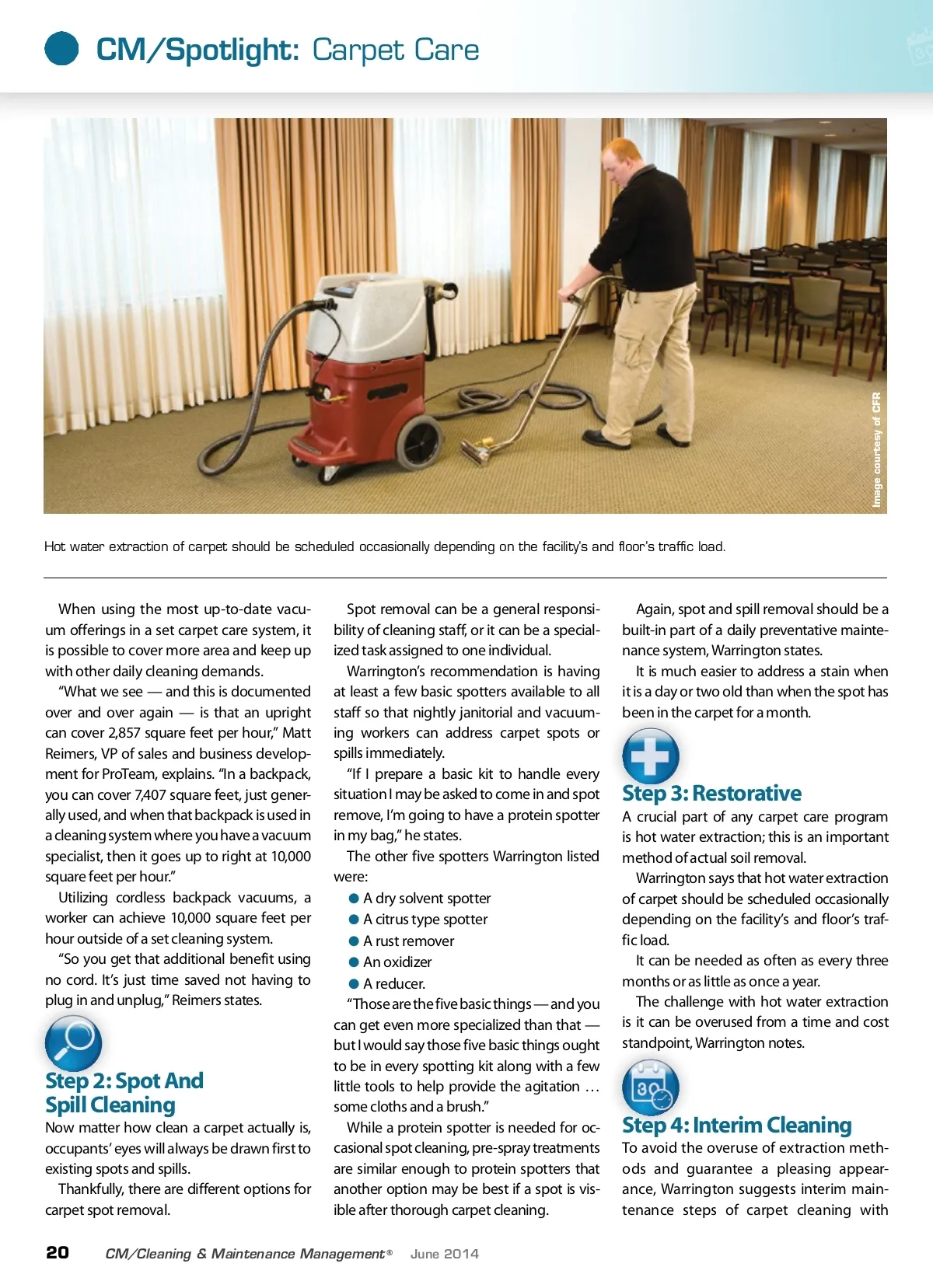 CM/Spotlight: Carpet Care Hot water extraction of carpet should be scheduled occasionally depending on the facility’s and floor’s traffic load. When using the most up-to-date vacu-um offerings in a set carpet care system, it is possible to cover more area and keep up with other daily cleaning demands. “What we see — and this is documented over and over again — is that an upright can cover 2,857 square feet per hour,” Matt Reimers, VP of sales and business develop-ment for ProTeam, explains. “In a backpack, you can cover 7,407 square feet, just gener-ally used, and when that backpack is used in a cleaning system where you have a vacuum specialist, then it goes up to right at 10,000 square feet per hour.” Utilizing cordless backpack vacuums, a worker can achieve 10,000 square feet per hour outside of a set cleaning system. “So you get that additional benefit using no cord. It’s just time saved not having to plug in and unplug,” Reimers states. Step 2: Spot And Spill Cleaning Now matter how clean a carpet actually is, occupants’ eyes will always be drawn first to existing spots and spills. Thankfully, there are different options for carpet spot removal. Spot removal can be a general responsi-bility of cleaning staff, or it can be a special-ized task assigned to one individual. Warrington’s recommendation is having at least a few basic spotters available to all staff so that nightly janitorial and vacuum-ing workers can address carpet spots or spills immediately. “If I prepare a basic kit to handle every situation I may be asked to come in and spot remove, I’m going to have a protein spotter in my bag,” he states. The other five spotters Warrington listed were: ● A dry solvent spotter ● A citrus type spotter ● A rust remover ● An oxidizer ● A reducer. “Those are the five basic things — and you can get even more specialized than that — but I would say those five basic things ought to be in every spotting kit along with a few little tools to help provide the agitation … some cloths and a brush.” While a protein spotter is needed for oc-casional spot cleaning, pre-spray treatments are similar enough to protein spotters that another option may be best if a spot is vis-ible after thorough carpet cleaning. June 2014 Again, spot and spill removal should be a built-in part of a daily preventative mainte-nance system, Warrington states. It is much easier to address a stain when it is a day or two old than when the spot has been in the carpet for a month. Step 3: Restorative A crucial part of any carpet care program is hot water extraction; this is an important method of actual soil removal. Warrington says that hot water extraction of carpet should be scheduled occasionally depending on the facility’s and floor’s traf-fic load. It can be needed as often as every three months or as little as once a year. The challenge with hot water extraction is it can be overused from a time and cost standpoint, Warrington notes. Step 4: Interim Cleaning To avoid the overuse of extraction meth-ods and guarantee a pleasing appear-ance, Warrington suggests interim main-tenance steps of carpet cleaning with 20 CM/Cleaning & Maintenance Management ® Image courtesy of CFR