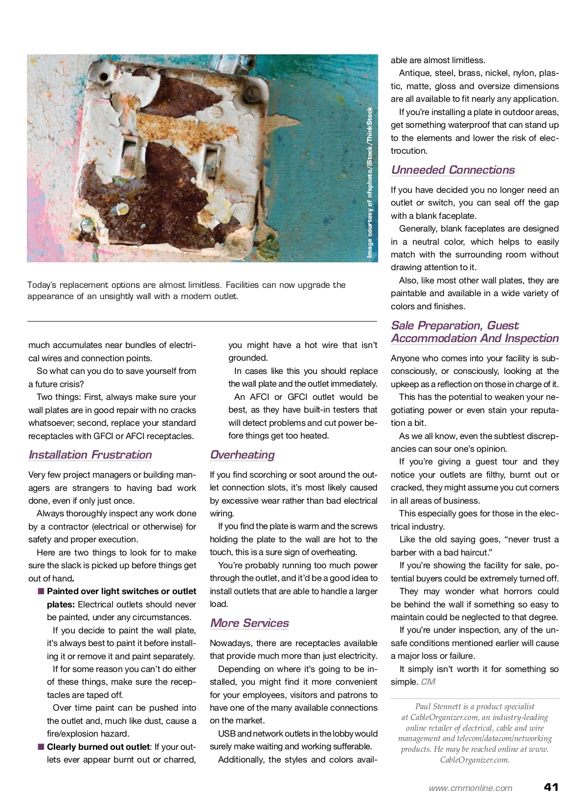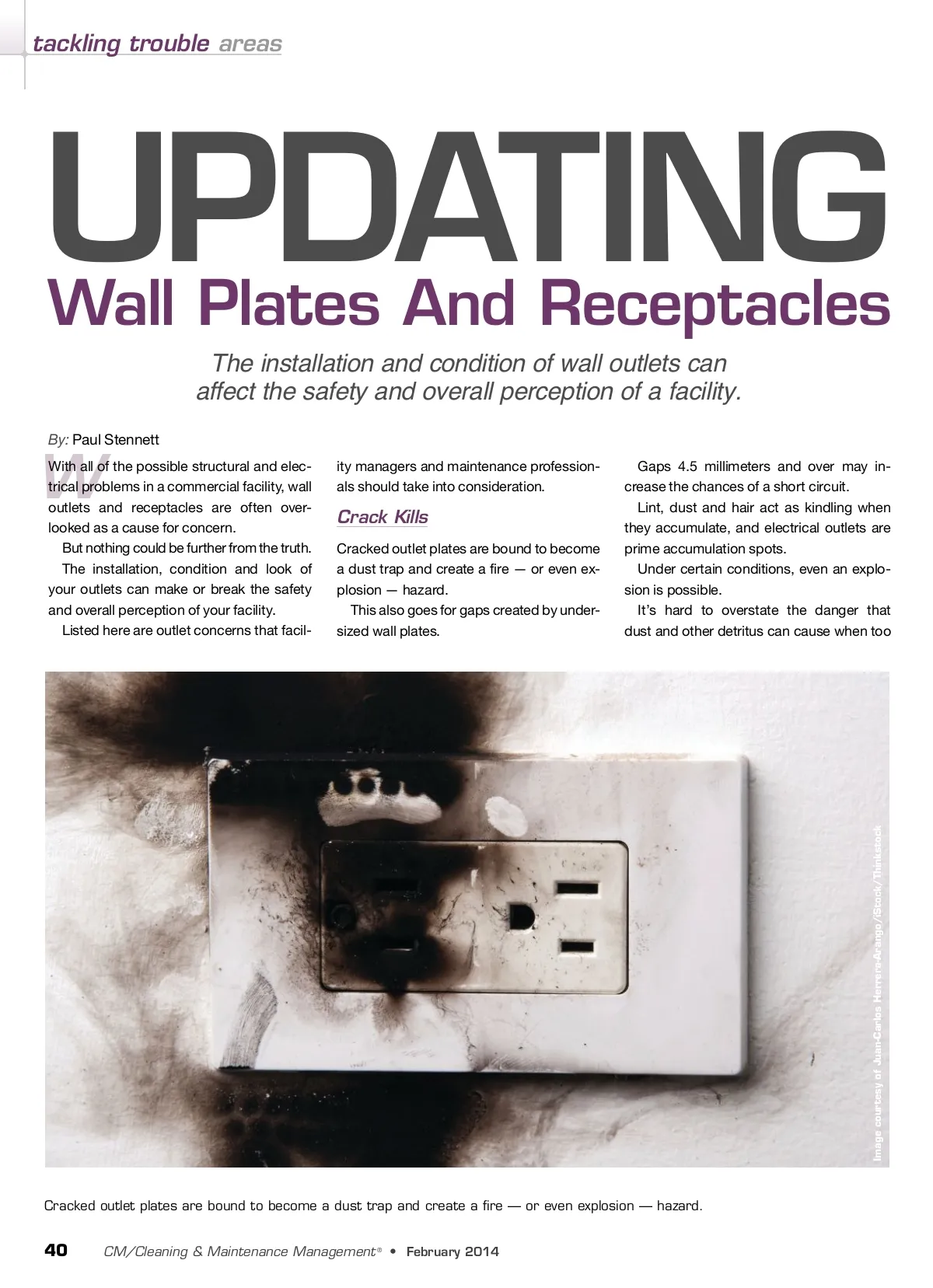 tackling trouble areas UPDATING Wall Plates And Receptacles The installation and condition of wall outlets can affect the safety and overall perception of a facility. By: Paul Stennett With all of the possible structural and elec-trical problems in a commercial facility, wall outlets and receptacles are often over-looked as a cause for concern. But nothing could be further from the truth. The installation, condition and look of your outlets can make or break the safety and overall perception of your facility. Listed here are outlet concerns that facil-ity managers and maintenance profession-als should take into consideration. Gaps 4.5 millimeters and over may in-crease the chances of a short circuit. Lint, dust and hair act as kindling when they accumulate, and electrical outlets are prime accumulation spots. Under certain conditions, even an explo-sion is possible. It’s hard to overstate the danger that dust and other detritus can cause when too W Crack Kills Cracked outlet plates are bound to become a dust trap and create a fire — or even ex-plosion — hazard. This also goes for gaps created by under-sized wall plates. Cracked outlet plates are bound to become a dust trap and create a fire — or even explosion — hazard. 40 CM/Cleaning & Maintenance Management ® • February 2014 Image courtesy of Juan-Carlos Herrera-Arango/iStock/Thinkstock