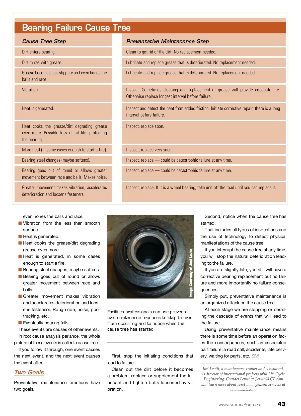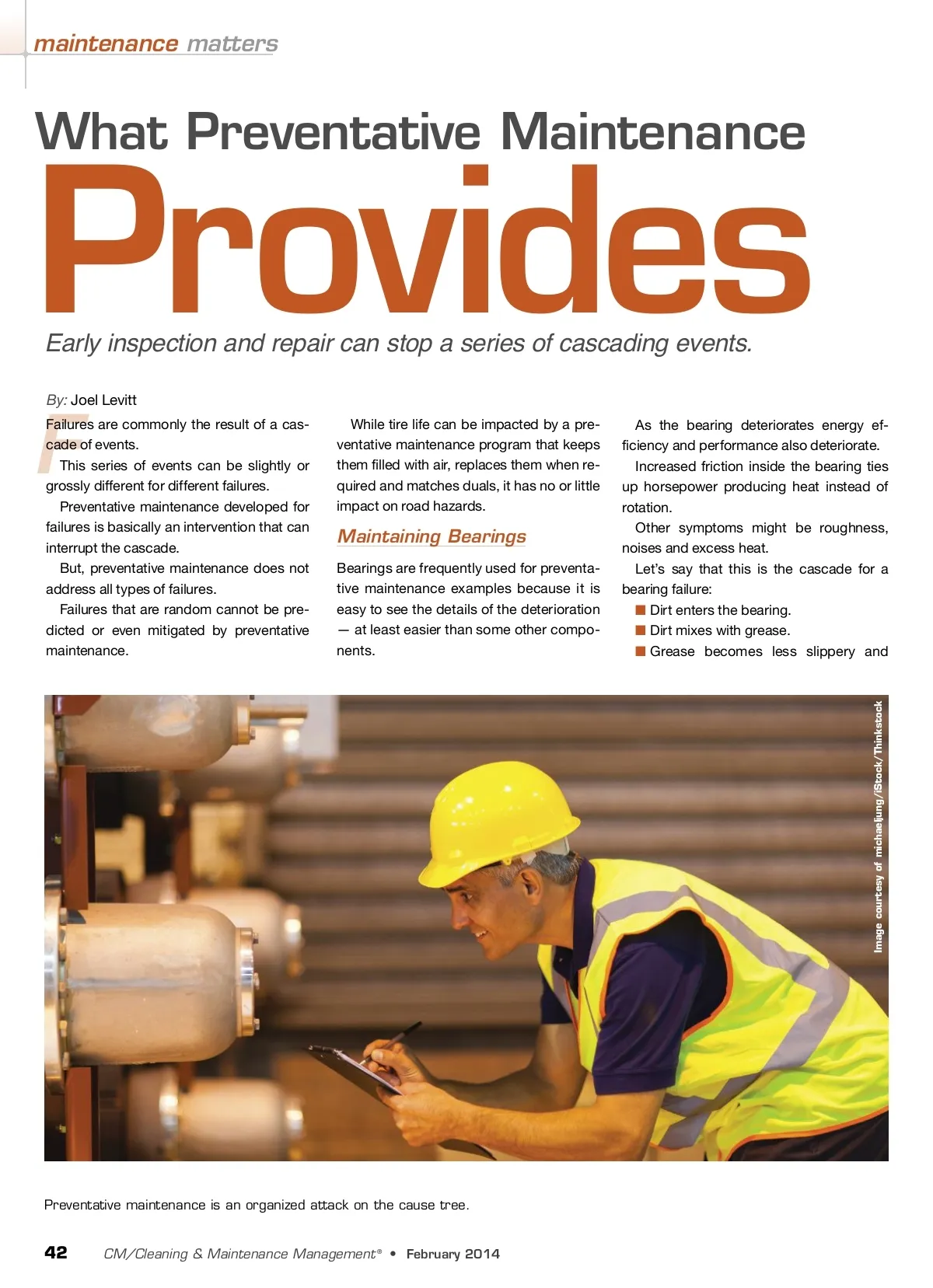 maintenance matters What Preventative Maintenance Provides Early inspection and repair can stop a series of cascading events. By: Joel Levitt F Failures are commonly the result of a cas-cade of events. This series of events can be slightly or grossly different for different failures. Preventative maintenance developed for failures is basically an intervention that can interrupt the cascade. But, preventative maintenance does not address all types of failures. Failures that are random cannot be pre-dicted or even mitigated by preventative maintenance. While tire life can be impacted by a pre-ventative maintenance program that keeps them filled with air, replaces them when re-quired and matches duals, it has no or little impact on road hazards. Maintaining Bearings Bearings are frequently used for preventa-tive maintenance examples because it is easy to see the details of the deterioration — at least easier than some other compo-nents. As the bearing deteriorates energy ef-ficiency and performance also deteriorate. Increased friction inside the bearing ties up horsepower producing heat instead of rotation. Other symptoms might be roughness, noises and excess heat. Let’s say that this is the cascade for a bearing failure: ■ Dirt enters the bearing. ■ Dirt mixes with grease. ■ Grease becomes less slippery and Preventative maintenance is an organized attack on the cause tree. CM/Cleaning & Maintenance Management ® • February 2014 42 Image courtesy of michaeljung/iStock/Thinkstock