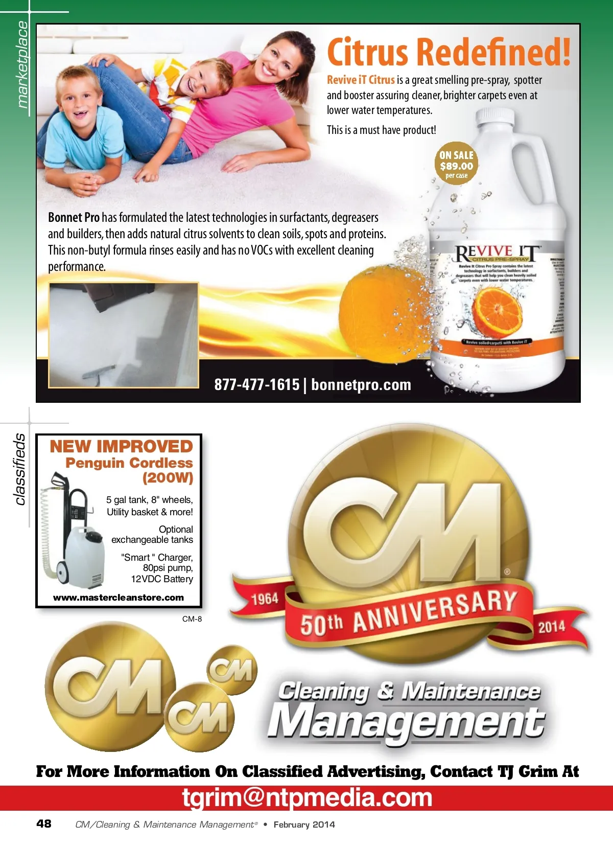 marketplace Revive iT Citrus is a great smelling pre-spray, spotter and booster assuring cleaner, brighter carpets even at lower water temperatures. This is a must have product! Citrus Redefined! AM Page 1 Bonnet Pro has formulated the latest technologies in surfactants, degreasers and builders, then adds natural citrus solvents to clean soils, spots and proteins. This non-butyl formula rinses easily and has no VOCs with excellent cleaning performance. 877-477-1615 | bonnetpro.com n netpro.com classifieds NEW IMPROVED Penguin Cordless (200W) 5 gal tank, 8" wheels, Utility basket & more! Optional exchangeable tanks "Smart " Charger, 80psi pump, 12VDC Battery www.mastercleanstore.com CM-8 For More Information On Classified Advertising, Contact TJ Grim At [email protected] 48 CM/Cleaning & Maintenance Management ® • February 2014