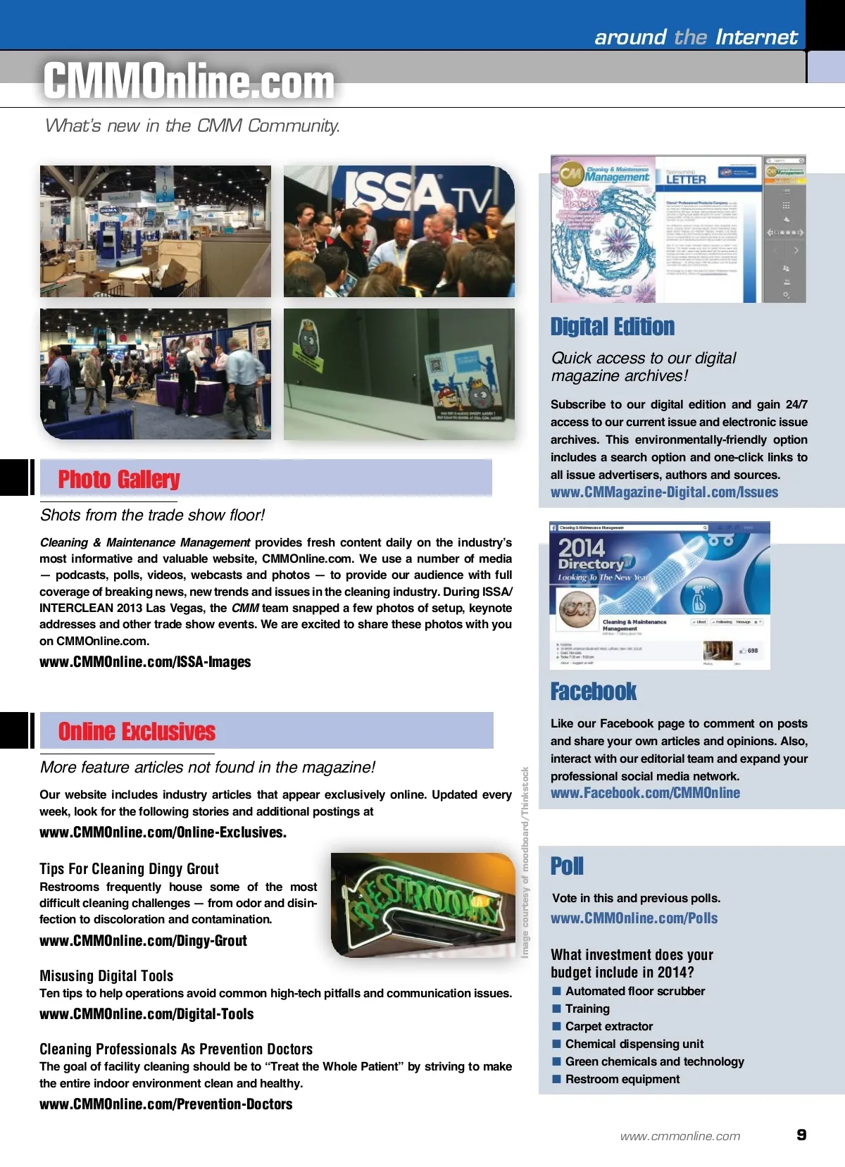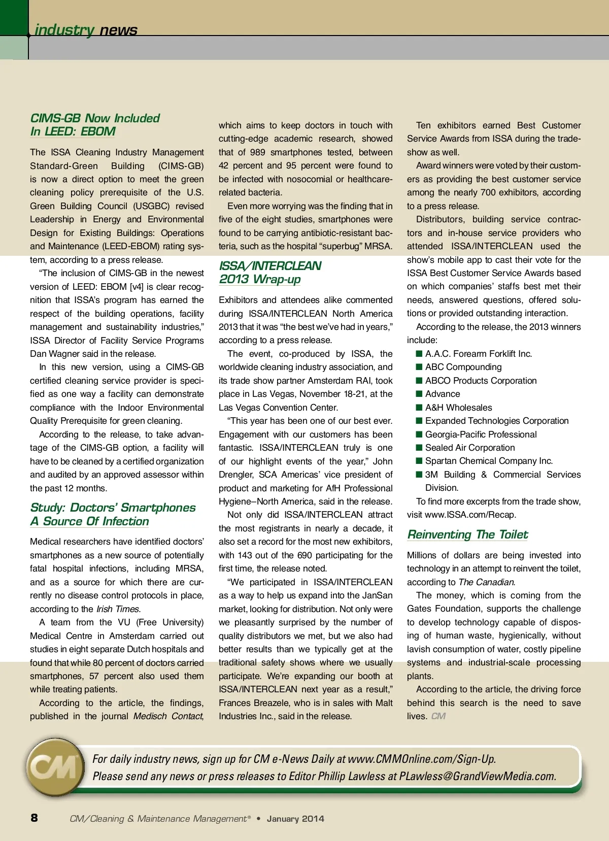industry news CIMS-GB Now Included In LEED: EBOM The ISSA Cleaning Industry Management Standard-Green Building (CIMS-GB) is now a direct option to meet the green cleaning policy prerequisite of the U.S. Green Building Council (USGBC) revised Leadership in Energy and Environmental Design for Existing Buildings: Operations and Maintenance (LEED-EBOM) rating sys-tem, according to a press release. “The inclusion of CIMS-GB in the newest version of LEED: EBOM [v4] is clear recog-nition that ISSA’s program has earned the respect of the building operations, facility management and sustainability industries,” ISSA Director of Facility Service Programs Dan Wagner said in the release. In this new version, using a CIMS-GB certified cleaning service provider is speci-fied as one way a facility can demonstrate compliance with the Indoor Environmental Quality Prerequisite for green cleaning. According to the release, to take advan-tage of the CIMS-GB option, a facility will have to be cleaned by a certified organization and audited by an approved assessor within the past 12 months. which aims to keep doctors in touch with cutting-edge academic research, showed that of 989 smartphones tested, between 42 percent and 95 percent were found to be infected with nosocomial or healthcare-related bacteria. Even more worrying was the finding that in five of the eight studies, smartphones were found to be carrying antibiotic-resistant bac-teria, such as the hospital “superbug” MRSA. ISSA/INTERCLEAN 2013 Wrap-up Exhibitors and attendees alike commented during ISSA/INTERCLEAN North America 2013 that it was “the best we’ve had in years,” according to a press release. The event, co-produced by ISSA, the worldwide cleaning industry association, and its trade show partner Amsterdam RAI, took place in Las Vegas, November 18-21, at the Las Vegas Convention Center. “This year has been one of our best ever. Engagement with our customers has been fantastic. ISSA/INTERCLEAN truly is one of our highlight events of the year,” John Drengler, SCA Americas’ vice president of product and marketing for AfH Professional Hygiene–North America, said in the release. Not only did ISSA/INTERCLEAN attract the most registrants in nearly a decade, it also set a record for the most new exhibitors, with 143 out of the 690 participating for the first time, the release noted. “We participated in ISSA/INTERCLEAN as a way to help us expand into the JanSan market, looking for distribution. Not only were we pleasantly surprised by the number of quality distributors we met, but we also had better results than we typically get at the traditional safety shows where we usually participate. We’re expanding our booth at ISSA/INTERCLEAN next year as a result,” Frances Breazele, who is in sales with Malt Industries Inc., said in the release. Study: Doctors’ Smartphones A Source Of Infection Medical researchers have identified doctors’ smartphones as a new source of potentially fatal hospital infections, including MRSA, and as a source for which there are cur-rently no disease control protocols in place, according to the Irish Times . A team from the VU (Free University) Medical Centre in Amsterdam carried out studies in eight separate Dutch hospitals and found that while 80 percent of doctors carried smartphones, 57 percent also used them while treating patients. According to the article, the findings, published in the journal Medisch Contact , Ten exhibitors earned Best Customer Service Awards from ISSA during the trade-show as well. Award winners were voted by their custom-ers as providing the best customer service among the nearly 700 exhibitors, according to a press release. Distributors, building service contrac-tors and in-house service providers who attended ISSA/INTERCLEAN used the show’s mobile app to cast their vote for the ISSA Best Customer Service Awards based on which companies’ staffs best met their needs, answered questions, offered solu-tions or provided outstanding interaction. According to the release, the 2013 winners include: ■ A.A.C. Forearm Forklift Inc. ■ ABC Compounding ■ ABCO Products Corporation ■ Advance ■ A&H Wholesales ■ Expanded Technologies Corporation ■ Georgia-Pacific Professional ■ Sealed Air Corporation ■ Spartan Chemical Company Inc. ■ 3M Building & Commercial Services Division. To find more excerpts from the trade show, visit www.ISSA.com/Recap. Reinventing The Toilet Millions of dollars are being invested into technology in an attempt to reinvent the toilet, according to The Canadian . The money, which is coming from the Gates Foundation, supports the challenge to develop technology capable of dispos-ing of human waste, hygienically, without lavish consumption of water, costly pipeline systems and industrial-scale processing plants. According to the article, the driving force behind this search is the need to save lives. CM For daily industry news, sign up for CM e-News Daily at www.CMMOnline.com/Sign-Up. Please send any news or press releases to Editor Phillip Lawless at [email protected]. 8 CM/Cleaning & Maintenance Management ® • January 2014