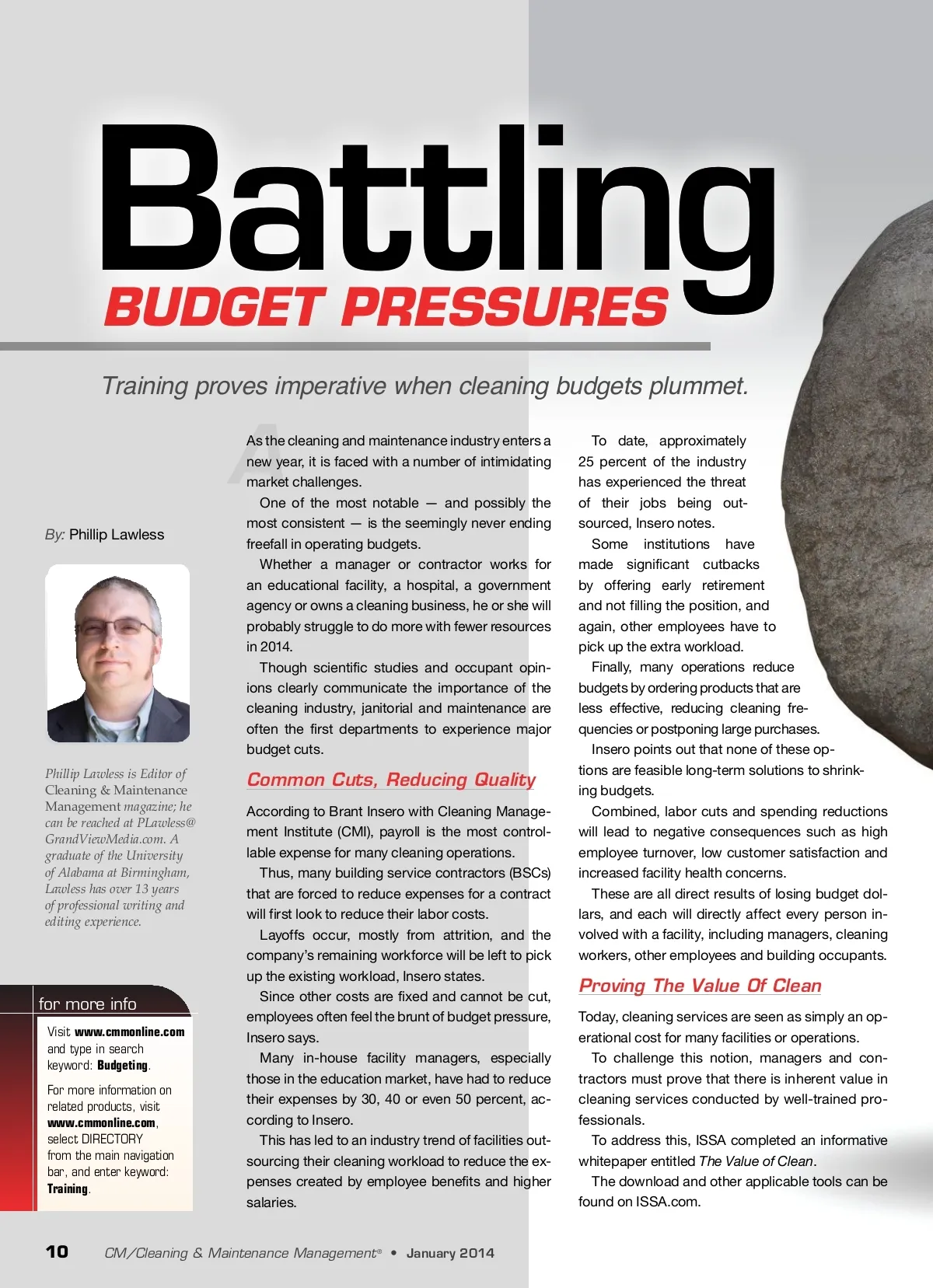 Battling BUDGET PRESSURES Training proves imperative when cleaning budgets plummet. A By: Phillip Lawless As the cleaning and maintenance industry enters a new year, it is faced with a number of intimidating market challenges. One of the most notable — and possibly the most consistent — is the seemingly never ending freefall in operating budgets. Whether a manager or contractor works for an educational facility, a hospital, a government agency or owns a cleaning business, he or she will probably struggle to do more with fewer resources in 2014. Though scientific studies and occupant opin-ions clearly communicate the importance of the cleaning industry, janitorial and maintenance are often the first departments to experience major budget cuts. Phillip Lawless is Editor of Cleaning & Maintenance Management magazine; he can be reached at PLawless@ GrandViewMedia.com. A graduate of the University of Alabama at Birmingham, Lawless has over 13 years of professional writing and editing experience. Common Cuts, Reducing Quality According to Brant Insero with Cleaning Manage-ment Institute (CMI), payroll is the most control-lable expense for many cleaning operations. Thus, many building service contractors (BSCs) that are forced to reduce expenses for a contract will first look to reduce their labor costs. Layoffs occur, mostly from attrition, and the company’s remaining workforce will be left to pick up the existing workload, Insero states. Since other costs are fixed and cannot be cut, employees often feel the brunt of budget pressure, Insero says. Many in-house facility managers, especially those in the education market, have had to reduce their expenses by 30, 40 or even 50 percent, ac-cording to Insero. This has led to an industry trend of facilities out-sourcing their cleaning workload to reduce the ex-penses created by employee benefits and higher salaries. To date, approximately 25 percent of the industry has experienced the threat of their jobs being out-sourced, Insero notes. Some institutions have made significant cutbacks by offering early retirement and not filling the position, and again, other employees have to pick up the extra workload. Finally, many operations reduce budgets by ordering products that are less effective, reducing cleaning fre-quencies or postponing large purchases. Insero points out that none of these op-tions are feasible long-term solutions to shrink-ing budgets. Combined, labor cuts and spending reductions will lead to negative consequences such as high employee turnover, low customer satisfaction and increased facility health concerns. These are all direct results of losing budget dol-lars, and each will directly affect every person in-volved with a facility, including managers, cleaning workers, other employees and building occupants. Proving The Value Of Clean Today, cleaning services are seen as simply an op-erational cost for many facilities or operations. To challenge this notion, managers and con-tractors must prove that there is inherent value in cleaning services conducted by well-trained pro-fessionals. To address this, ISSA completed an informative whitepaper entitled The Value of Clean . The download and other applicable tools can be found on ISSA.com. for more info Visit www.cmmonline.com and type in search keyword: Budgeting . For more information on related products, visit www.cmmonline.com , select DIRECTORY from the main navigation bar, and enter keyword: Training . 10 CM/Cleaning & Maintenance Management ® • January 2014