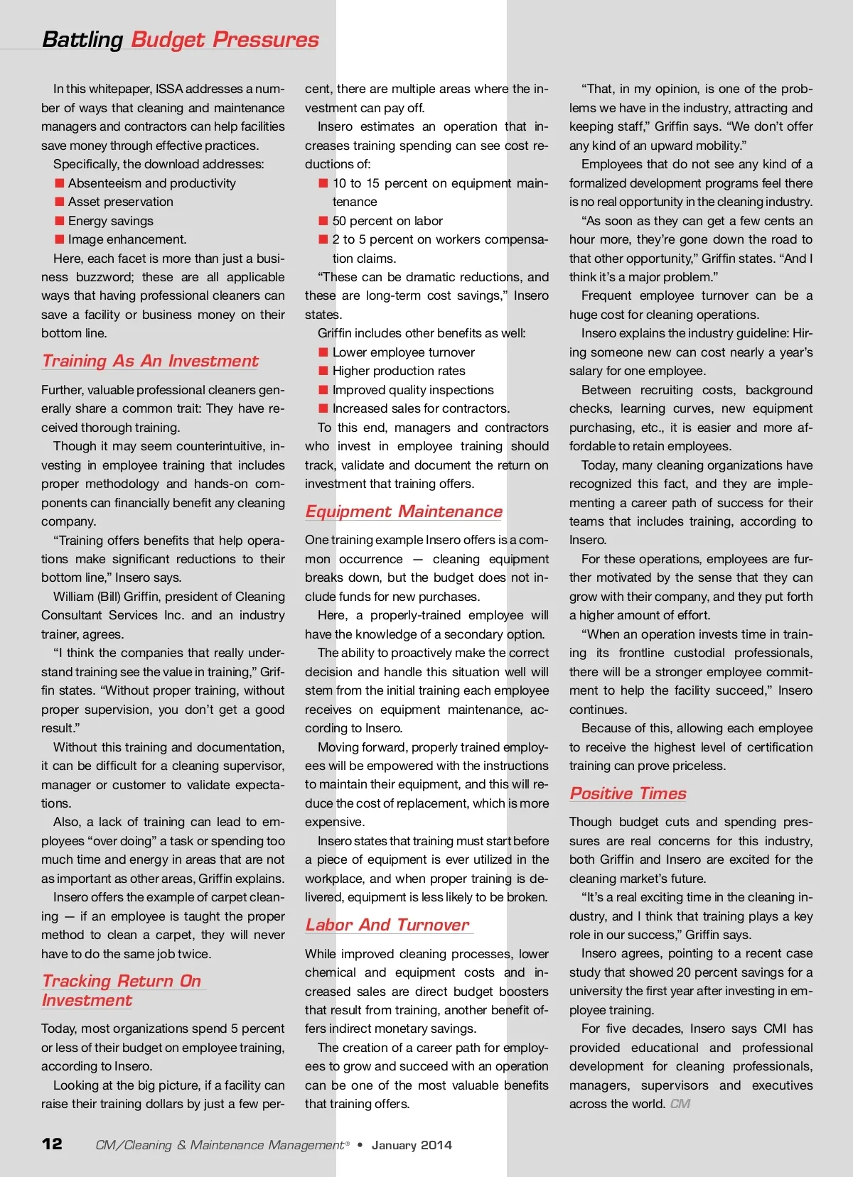 Battling Budget Pressures In this whitepaper, ISSA addresses a num-ber of ways that cleaning and maintenance managers and contractors can help facilities save money through effective practices. Specifically, the download addresses: ■ Absenteeism and productivity ■ Asset preservation ■ Energy savings ■ Image enhancement. Here, each facet is more than just a busi-ness buzzword; these are all applicable ways that having professional cleaners can save a facility or business money on their bottom line. cent, there are multiple areas where the in-vestment can pay off. Insero estimates an operation that in-creases training spending can see cost re-ductions of: ■ 10 to 15 percent on equipment main-tenance ■ 50 percent on labor ■ 2 to 5 percent on workers compensa-tion claims. “These can be dramatic reductions, and these are long-term cost savings,” Insero states. Griffin includes other benefits as well: ■ Lower employee turnover ■ Higher production rates ■ Improved quality inspections ■ Increased sales for contractors. To this end, managers and contractors who invest in employee training should track, validate and document the return on investment that training offers. “That, in my opinion, is one of the prob-lems we have in the industry, attracting and keeping staff,” Griffin says. “We don’t offer any kind of an upward mobility.” Employees that do not see any kind of a formalized development programs feel there is no real opportunity in the cleaning industry. “As soon as they can get a few cents an hour more, they’re gone down the road to that other opportunity,” Griffin states. “And I think it’s a major problem.” Frequent employee turnover can be a huge cost for cleaning operations. Insero explains the industry guideline: Hir-ing someone new can cost nearly a year’s salary for one employee. Between recruiting costs, background checks, learning curves, new equipment purchasing, etc., it is easier and more af-fordable to retain employees. Today, many cleaning organizations have recognized this fact, and they are imple-menting a career path of success for their teams that includes training, according to Insero. For these operations, employees are fur-ther motivated by the sense that they can grow with their company, and they put forth a higher amount of effort. “When an operation invests time in train-ing its frontline custodial professionals, there will be a stronger employee commit-ment to help the facility succeed,” Insero continues. Because of this, allowing each employee to receive the highest level of certification training can prove priceless. Training As An Investment Further, valuable professional cleaners gen-erally share a common trait: They have re-ceived thorough training. Though it may seem counterintuitive, in-vesting in employee training that includes proper methodology and hands-on com-ponents can financially benefit any cleaning company. “Training offers benefits that help opera-tions make significant reductions to their bottom line,” Insero says. William (Bill) Griffin, president of Cleaning Consultant Services Inc. and an industry trainer, agrees. “I think the companies that really under-stand training see the value in training,” Grif-fin states. “Without proper training, without proper supervision, you don’t get a good result.” Without this training and documentation, it can be difficult for a cleaning supervisor, manager or customer to validate expecta-tions. Also, a lack of training can lead to em-ployees “over doing” a task or spending too much time and energy in areas that are not as important as other areas, Griffin explains. Insero offers the example of carpet clean-ing — if an employee is taught the proper method to clean a carpet, they will never have to do the same job twice. Equipment Maintenance One training example Insero offers is a com-mon occurrence — cleaning equipment breaks down, but the budget does not in-clude funds for new purchases. Here, a properly-trained employee will have the knowledge of a secondary option. The ability to proactively make the correct decision and handle this situation well will stem from the initial training each employee receives on equipment maintenance, ac-cording to Insero. Moving forward, properly trained employ-ees will be empowered with the instructions to maintain their equipment, and this will re-duce the cost of replacement, which is more expensive. Insero states that training must start before a piece of equipment is ever utilized in the workplace, and when proper training is de-livered, equipment is less likely to be broken. Positive Times Though budget cuts and spending pres-sures are real concerns for this industry, both Griffin and Insero are excited for the cleaning market’s future. “It’s a real exciting time in the cleaning in-dustry, and I think that training plays a key role in our success,” Griffin says. Insero agrees, pointing to a recent case study that showed 20 percent savings for a university the first year after investing in em-ployee training. For five decades, Insero says CMI has provided educational and professional development for cleaning professionals, managers, supervisors and executives across the world. CM Labor And Turnover While improved cleaning processes, lower chemical and equipment costs and in-creased sales are direct budget boosters that result from training, another benefit of-fers indirect monetary savings. The creation of a career path for employ-ees to grow and succeed with an operation can be one of the most valuable benefits that training offers. Tracking Return On Investment Today, most organizations spend 5 percent or less of their budget on employee training, according to Insero. Looking at the big picture, if a facility can raise their training dollars by just a few per-12 CM/Cleaning & Maintenance Management ® • January 2014