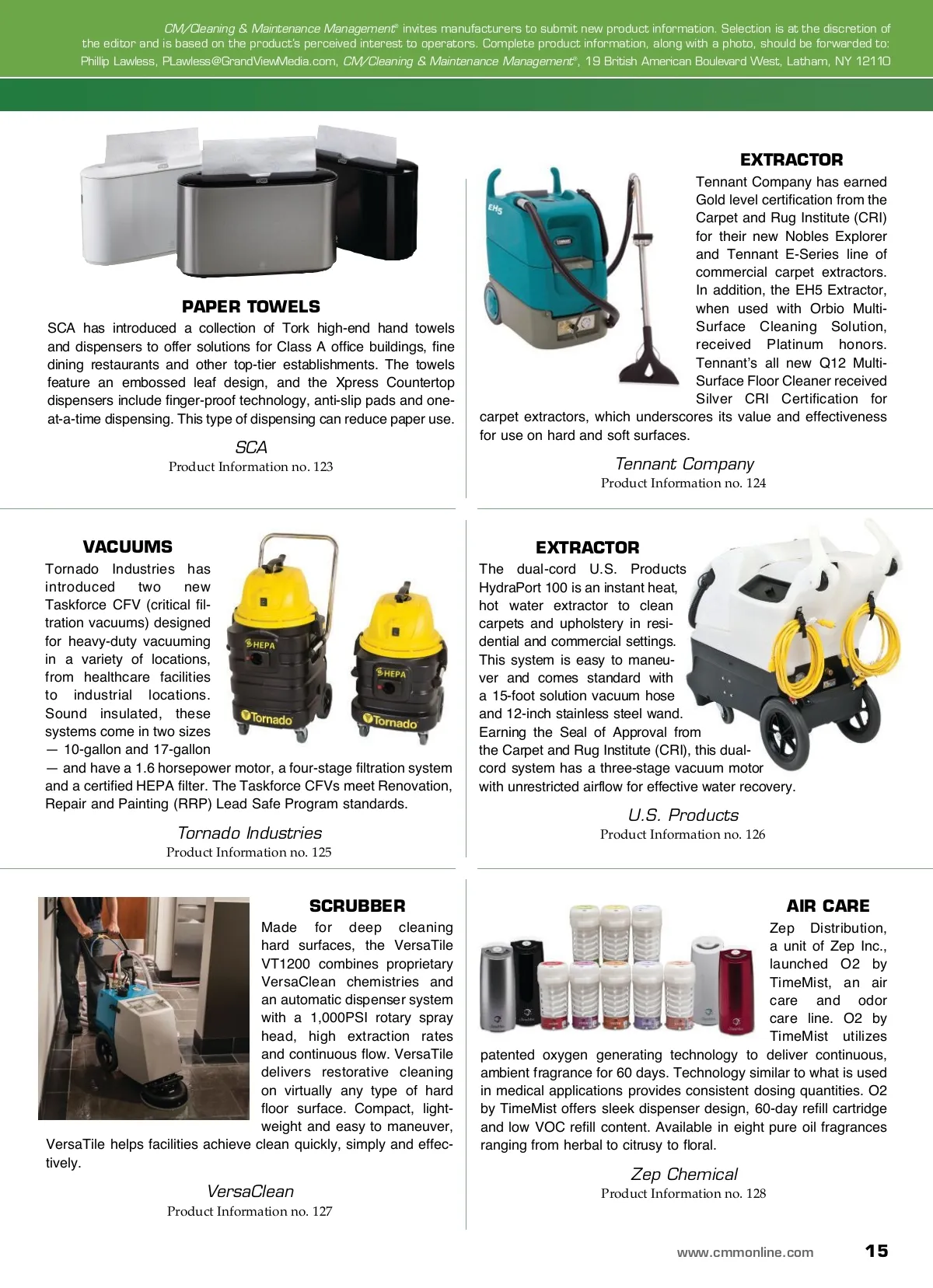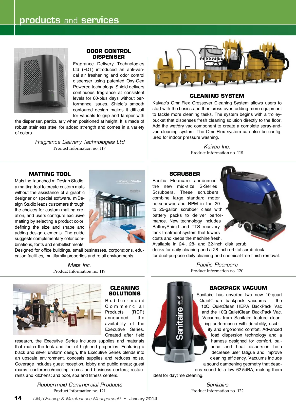 products and services ODOR CONTROL DISPENSER Fragrance Delivery Technologies Ltd (FDT) introduced an anti-van -dal air freshening and odor control dispenser using patented Oxy-Gen Powered technology. Shield delivers continuous fragrance at consistent levels for 60-plus days without per-formance issues. Shield’s smooth contoured design makes it difficult for vandals to grip and tamper with the dispenser, particularly when positioned at height. It is made of robust stainless steel for added strength and comes in a variety of colors. CLEANING SYSTEM Kaivac’s OmniFlex Crossover Cleaning System allows users to start with the basics and then cross over, adding more equipment to tackle more cleaning tasks. The system begins with a trolley-bucket that dispenses fresh cleaning solution directly to the floor. Add the wet/dry vac component to create a complete spray-and-vac cleaning system. The OmniFlex system can also be config -ured for indoor pressure washing. Fragrance Delivery Technologies Ltd Product Information no. 117 Kaivac Inc. Product Information no. 118 MATTING TOOL Mats Inc. launched miDesign Studio, a matting tool to create custom mats without the assistance of a graphic designer or special software. miDe-sign Studio leads customers through the choices for custom matting cre-ation, and users configure exclusive matting by selecting a product color, defining the size and shape and adding design elements. The guide suggests complementary color com-binations, fonts and embellishments. Designed for office buildings, small businesses, corporations, edu-cation facilities, multifamily properties and retail environments. SCRUBBER Pacific Floorcare announced the new mid-size S-Series Scrubbers. These scrubbers combine large standard motor horsepower and RPM in the 20-to 25-gallon scrubber class with battery packs to deliver perfor-mance. New technology includes BatteryShield and TTS recovery tank treatment system that lowers costs and keeps the machine fresh. Available in 24-, 28-and 32-inch disk scrub decks for daily cleaning and a 28-inch orbital scrub deck for dual-purpose daily cleaning and chemical-free finish removal. Mats Inc. Product Information no. 119 Pacific Floorcare Product Information no. 120 CLEANING SOLUTIONS Rubbermaid Commercial Products (RCP) announced the availability of the Executive Series. Created after field research, the Executive Series includes supplies and materials that match the look and feel of high-end properties. Featuring a black and silver uniform design, the Executive Series blends into an upscale environment, conceals supplies and reduces noise. Coverage includes guest reception, lobby and public areas; guest rooms; conference/meeting rooms and business centers; restau -rants and kitchens; and pool, spa and fitness centers. BACKPACK VACUUM Sanitaire has unveiled two new 10-quart QuietClean backpack vacuums – the 10Q QuietClean HEPA BackPack Vac and the 10Q QuietClean BackPack Vac. Vacuums from Sanitaire feature clean -ing performance with durability, usabil-ity and ergonomic comfort. Advanced load dispersion technology and a harness designed for comfort, bal-ance and heat dispersion help decrease user fatigue and improve cleaning efficiency. Vacuums include a sound dampening geometry that dead-ens sound to a low 62.5dBA, making them ideal for daytime cleaning. Rubbermaid Commercial Products Product Information no. 121 Sanitaire Product Information no. 122 14 CM/Cleaning & Maintenance Management ® • January 2014