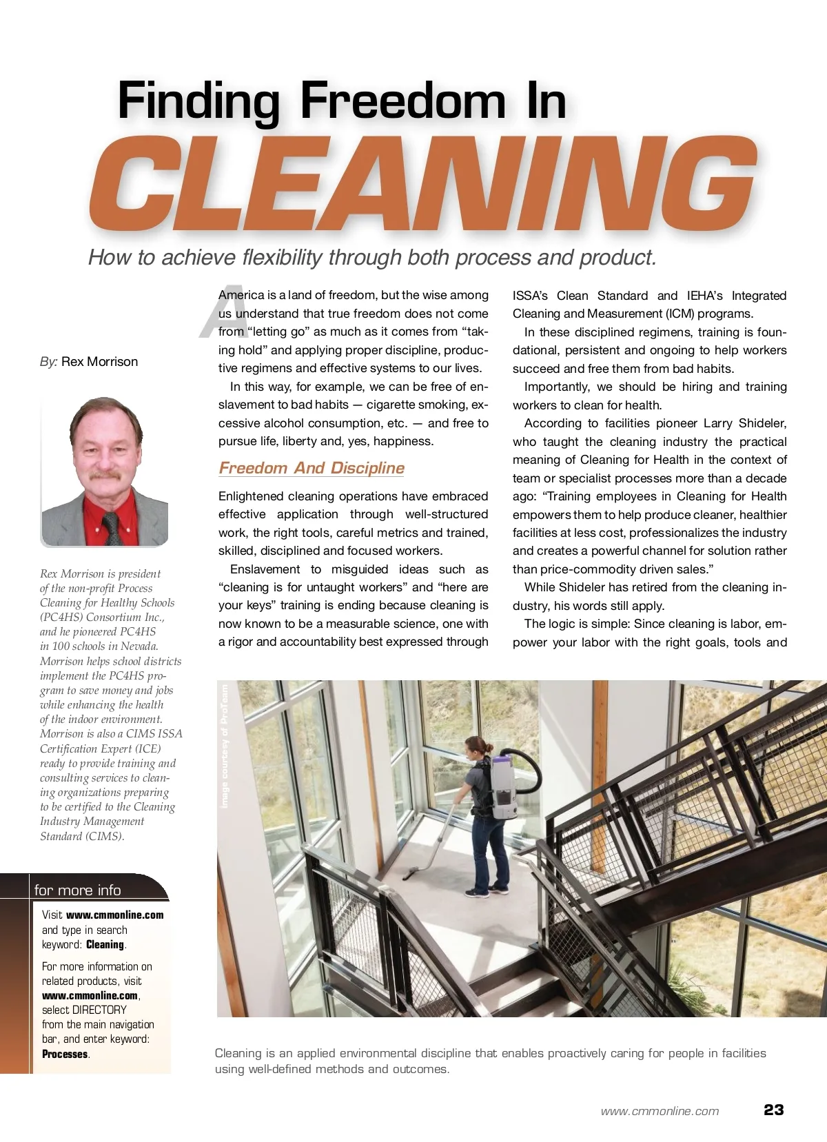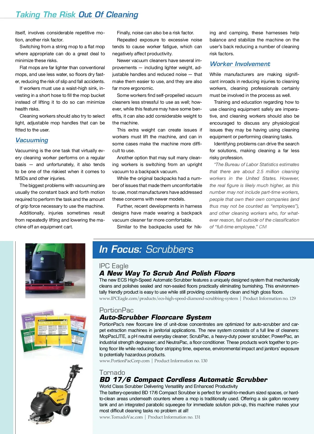 Taking The Risk Out Of Cleaning itself, involves considerable repetitive mo-tion, another risk factor. Switching from a string mop to a flat mop where appropriate can do a great deal to minimize these risks. Flat mops are far lighter than conventional mops, and use less water, so floors dry fast-er, reducing the risk of slip and fall accidents. If workers must use a waist-high sink, in-vesting in a short hose to fill the mop bucket instead of lifting it to do so can minimize health risks. Cleaning workers should also try to select light, adjustable mop handles that can be fitted to the user. Finally, noise can also be a risk factor. Repeated exposure to excessive noise tends to cause worker fatigue, which can negatively affect productivity. Newer vacuum cleaners have several im-provements — including lighter weight, ad-justable handles and reduced noise — that make them easier to use, and they are also far more ergonomic. Some workers find self-propelled vacuum cleaners less stressful to use as well; how-ever, while this feature may have some ben-efits, it can also add considerable weight to the machine. This extra weight can create issues if workers must lift the machine, and can in some cases make the machine more diffi-cult to use. Another option that may suit many clean-ing workers is switching from an upright vacuum to a backpack vacuum. While the original backpacks had a num-ber of issues that made them uncomfortable to use, most manufacturers have addressed these concerns with newer models. Further, recent developments in harness designs have made wearing a backpack vacuum cleaner far more comfortable. Similar to the backpacks used for hik-ing and camping, these harnesses help balance and stabilize the machine on the user’s back reducing a number of cleaning risk factors. Worker Involvement While manufacturers are making signifi-cant inroads in reducing injuries to cleaning workers, cleaning professionals certainly must be involved in the process as well. Training and education regarding how to use cleaning equipment safely are impera-tive, and cleaning workers should also be encouraged to discuss any physiological issues they may be having using cleaning equipment or performing cleaning tasks. Identifying problems can drive the search for solutions, making cleaning a far less risky profession. *The Bureau of Labor Statistics estimates that there are about 2.5 million cleaning workers in the United States. However, the real figure is likely much higher, as this number may not include part-time workers, people that own their own companies (and thus may not be counted as “employees”), and other cleaning workers who, for what-ever reason, fall outside of the classification of “full-time employee.” CM Vacuuming Vacuuming is the one task that virtually ev-ery cleaning worker performs on a regular basis — and unfortunately, it also tends to be one of the riskiest when it comes to MSDs and other injuries. The biggest problems with vacuuming are usually the constant back and forth motion required to perform the task and the amount of grip force necessary to use the machine. Additionally, injuries sometimes result from repeatedly lifting and lowering the ma-chine off an equipment cart. In Focus: Scrubbers IPC Eagle A New Way To Scrub And Polish Floors The new ECS High-Speed Automatic Scrubber features a uniquely designed system that mechanically cleans and polishes sealed and non-sealed floors practically eliminating burnishing. This environmen-tally friendly product is easy to use while still providing consistently clean and high gloss floors. www.IPCEagle.com/products/ecs-high-speed-diamond-scrubbing-system | Product Information no. 129 PortionPac Auto-Scrubber Floorcare System PortionPac’s new floorcare line of unit-dose concentrates are optimized for auto-scrubber and car-pet extraction machines in janitorial applications. The new system consists of a full line of cleaners: MopPacLITE, a pH neutral everyday cleaner; ScrubPac, a heavy-duty power scrubber; PowerPac, an industrial strength degreaser; and NeutraPac, a floor conditioner. These products work together to pro-long floor life while reducing floor stripping time, expense, environmental impact and janitors’ exposure to potentially hazardous products. www.PortionPacCorp.com | Product Information no. 130 Tornado BD 17/6 Compact Cordless Automatic Scrubber World Class Scrubber Delivering Versatility and Enhanced Productivity The battery-operated BD 17/6 Compact Scrubber is perfect for small-to-medium sized spaces, or hard-to-clean areas underneath counters where a mop is traditionally used. Offering a six gallon recovery tank and an integrated parabolic squeegee for immediate solution pick-up, this machine makes your most difficult cleaning tasks no problem at all! www.TornadoVac.com | Product Information no. 131