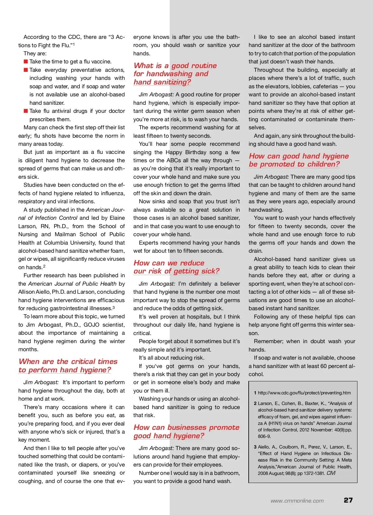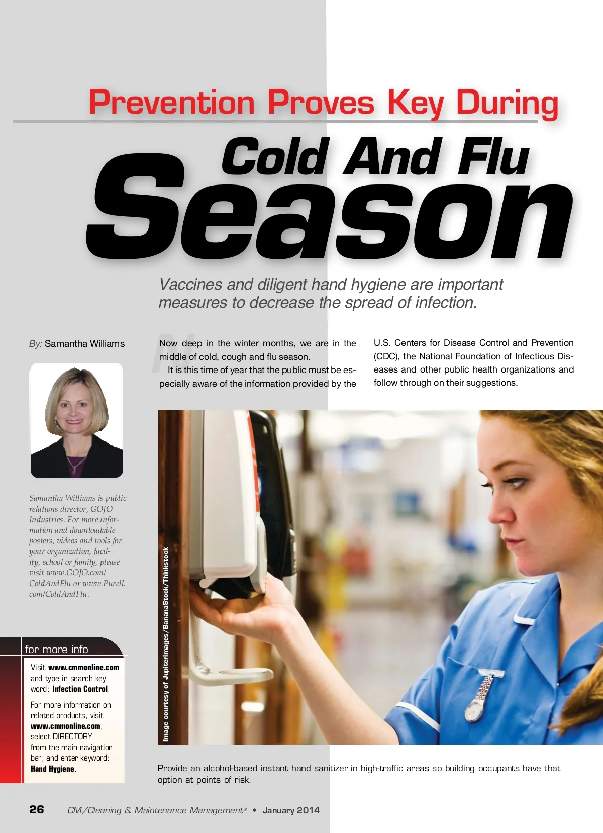 Prevention Proves Key During Season Vaccines and diligent hand hygiene are important measures to decrease the spread of infection. By: Samantha Williams Cold And Flu N Now deep in the winter months, we are in the middle of cold, cough and flu season. It is this time of year that the public must be es-pecially aware of the information provided by the U.S. Centers for Disease Control and Prevention (CDC), the National Foundation of Infectious Dis-eases and other public health organizations and follow through on their suggestions. for more info Visit www.cmmonline.com and type in search key-word: Infection Control . For more information on related products, visit www.cmmonline.com , select DIRECTORY from the main navigation bar, and enter keyword: Hand Hygiene . Provide an alcohol-based instant hand sanitizer in high-traffic areas so building occupants have that option at points of risk. 26 CM/Cleaning & Maintenance Management ® • January 2014 Image courtesy of Jupiterimages/BananaStock/Thinkstock Samantha Williams is public relations director, GOJO Industries. For more infor-mation and downloadable posters, videos and tools for your organization, facil-ity, school or family, please visit www.GOJO.com/ ColdAndFlu or www.Purell. com/ColdAndFlu.