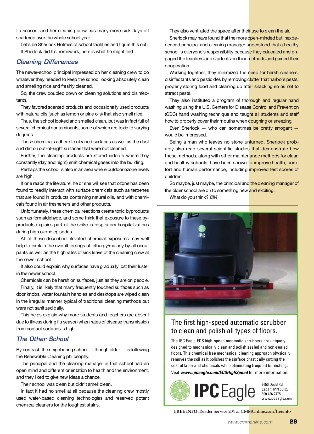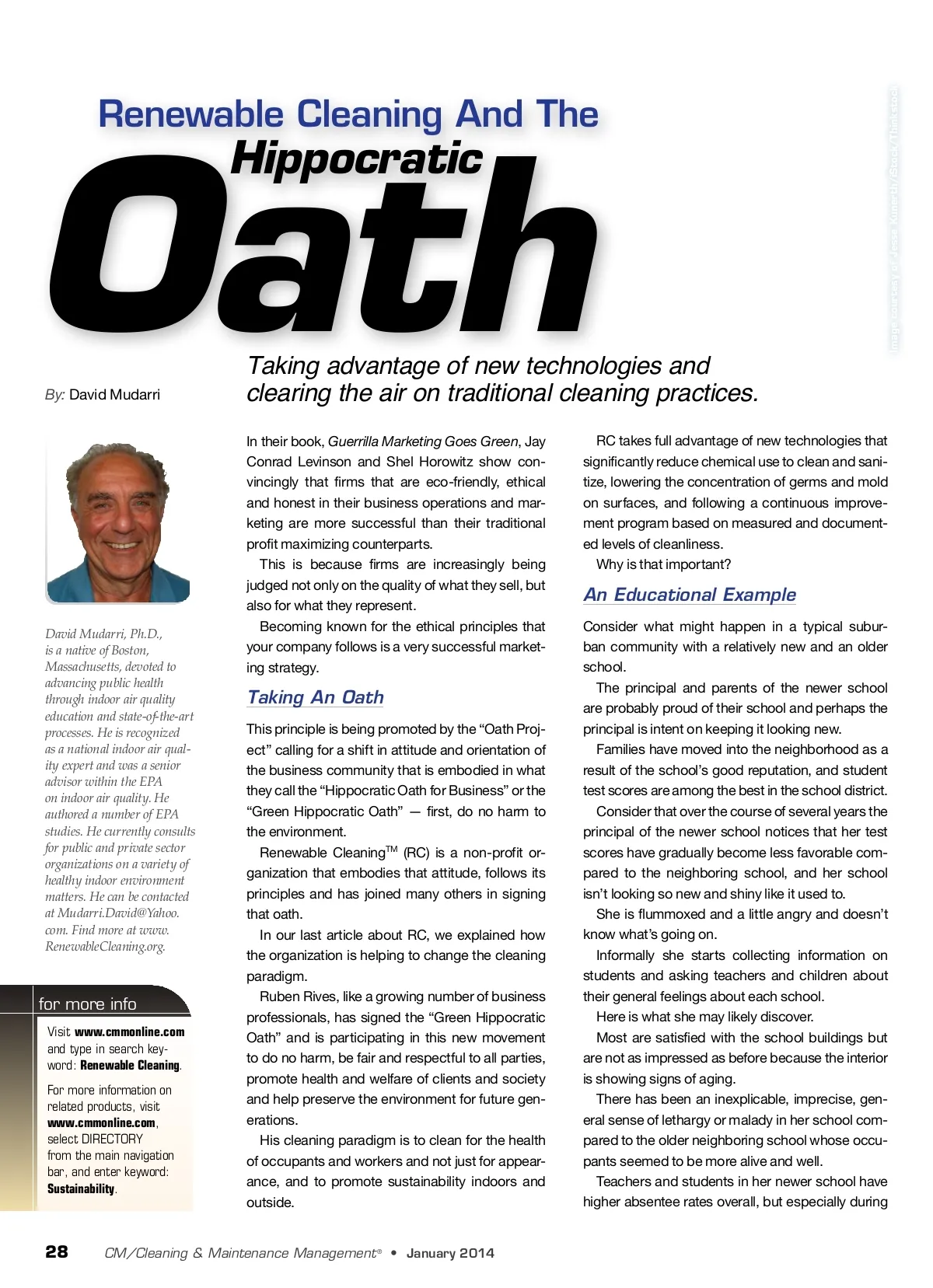 Renewable Cleaning And The Oath By: David Mudarri Hippocratic Taking advantage of new technologies and clearing the air on traditional cleaning practices. In their book, Guerrilla Marketing Goes Green , Jay Conrad Levinson and Shel Horowitz show con-vincingly that firms that are eco-friendly, ethical and honest in their business operations and mar-keting are more successful than their traditional profit maximizing counterparts. This is because firms are increasingly being judged not only on the quality of what they sell, but also for what they represent. Becoming known for the ethical principles that your company follows is a very successful market-ing strategy. RC takes full advantage of new technologies that significantly reduce chemical use to clean and sani-tize, lowering the concentration of germs and mold on surfaces, and following a continuous improve-ment program based on measured and document-ed levels of cleanliness. Why is that important? I David Mudarri, Ph.D., is a native of Boston, Massachusetts, devoted to advancing public health through indoor air quality education and state-of-the-art processes. He is recognized as a national indoor air qual-ity expert and was a senior advisor within the EPA on indoor air quality. He authored a number of EPA studies. He currently consults for public and private sector organizations on a variety of healthy indoor environment matters. He can be contacted at Mudarri.David@Yahoo. com. Find more at www. RenewableCleaning.org. An Educational Example Consider what might happen in a typical subur-ban community with a relatively new and an older school. The principal and parents of the newer school are probably proud of their school and perhaps the principal is intent on keeping it looking new. Families have moved into the neighborhood as a result of the school’s good reputation, and student test scores are among the best in the school district. Consider that over the course of several years the principal of the newer school notices that her test scores have gradually become less favorable com-pared to the neighboring school, and her school isn’t looking so new and shiny like it used to. She is flummoxed and a little angry and doesn’t know what’s going on. Informally she starts collecting information on students and asking teachers and children about their general feelings about each school. Here is what she may likely discover. Most are satisfied with the school buildings but are not as impressed as before because the interior is showing signs of aging. There has been an inexplicable, imprecise, gen-eral sense of lethargy or malady in her school com-pared to the older neighboring school whose occu-pants seemed to be more alive and well. Teachers and students in her newer school have higher absentee rates overall, but especially during Taking An Oath This principle is being promoted by the “Oath Proj-ect” calling for a shift in attitude and orientation of the business community that is embodied in what they call the “Hippocratic Oath for Business” or the “Green Hippocratic Oath” — first, do no harm to the environment. Renewable Cleaning TM (RC) is a non-profit or-ganization that embodies that attitude, follows its principles and has joined many others in signing that oath. In our last article about RC, we explained how the organization is helping to change the cleaning paradigm. Ruben Rives, like a growing number of business professionals, has signed the “Green Hippocratic Oath” and is participating in this new movement to do no harm, be fair and respectful to all parties, promote health and welfare of clients and society and help preserve the environment for future gen-erations. His cleaning paradigm is to clean for the health of occupants and workers and not just for appear-ance, and to promote sustainability indoors and outside. for more info Visit www.cmmonline.com and type in search key-word: Renewable Cleaning . For more information on related products, visit www.cmmonline.com , select DIRECTORY from the main navigation bar, and enter keyword: Sustainability . 28 CM/Cleaning & Maintenance Management ® • January 2014 Image courtesy of Jesse Kunerth/iStock/Thinkstock