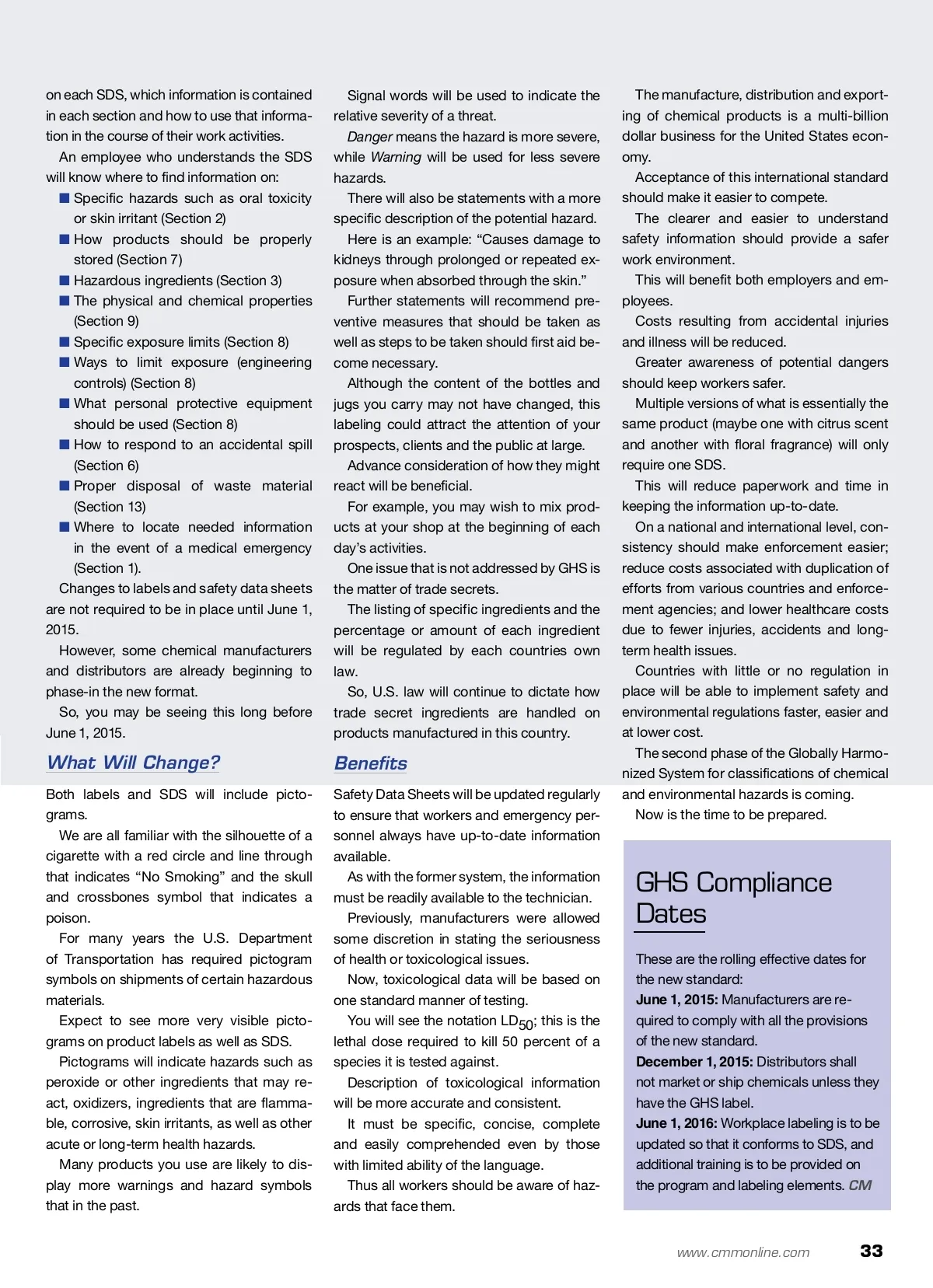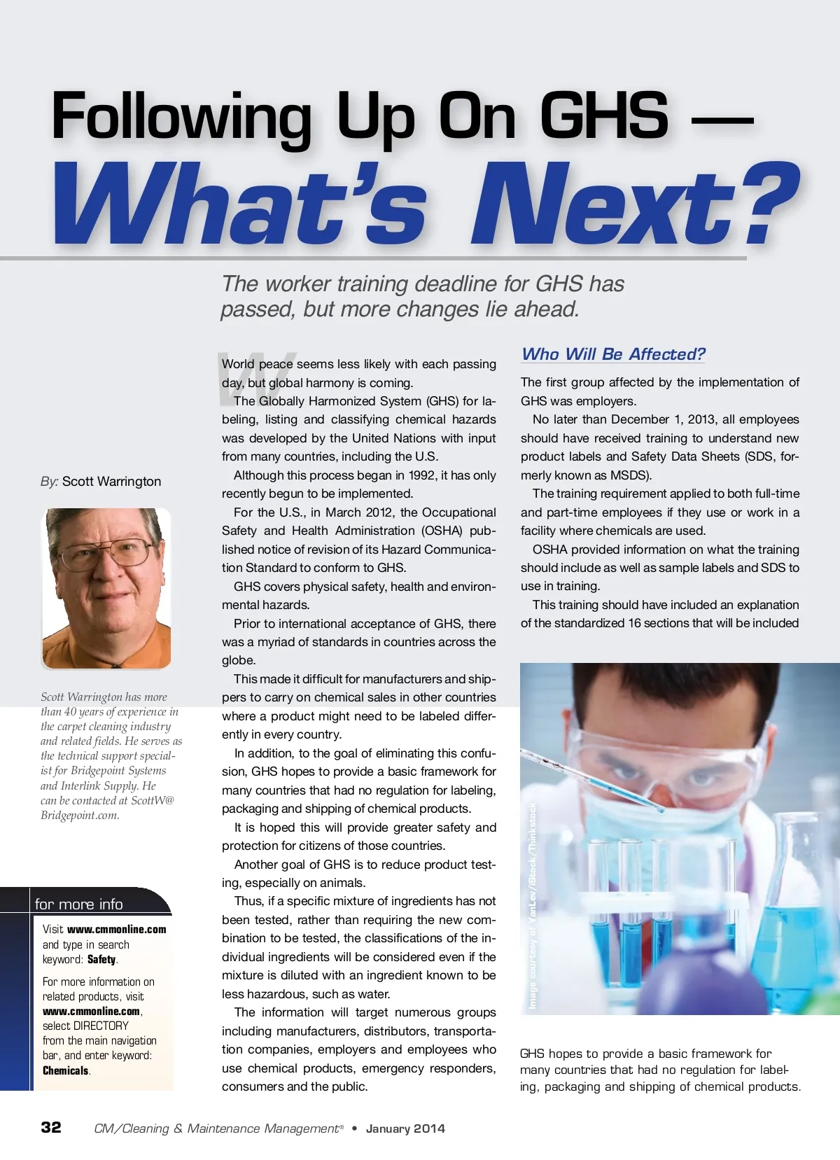 Following Up On GHS — What’s Next? The worker training deadline for GHS has passed, but more changes lie ahead. W By: Scott Warrington for more info Visit www.cmmonline.com and type in search keyword: Safety . For more information on related products, visit www.cmmonline.com , select DIRECTORY from the main navigation bar, and enter keyword: Chemicals . GHS hopes to provide a basic framework for many countries that had no regulation for label-ing, packaging and shipping of chemical products. 32 CM/Cleaning & Maintenance Management ® • January 2014 Image courtesy of YanLev/iStock/Thinkstock Scott Warrington has more than 40 years of experience in the carpet cleaning industry and related fields. He serves as the technical support special-ist for Bridgepoint Systems and Interlink Supply. He can be contacted at ScottW@ Bridgepoint.com. World peace seems less likely with each passing day, but global harmony is coming. The Globally Harmonized System (GHS) for la-beling, listing and classifying chemical hazards was developed by the United Nations with input from many countries, including the U.S. Although this process began in 1992, it has only recently begun to be implemented. For the U.S., in March 2012, the Occupational Safety and Health Administration (OSHA) pub-lished notice of revision of its Hazard Communica-tion Standard to conform to GHS. GHS covers physical safety, health and environ-mental hazards. Prior to international acceptance of GHS, there was a myriad of standards in countries across the globe. This made it difficult for manufacturers and ship-pers to carry on chemical sales in other countries where a product might need to be labeled differ-ently in every country. In addition, to the goal of eliminating this confu-sion, GHS hopes to provide a basic framework for many countries that had no regulation for labeling, packaging and shipping of chemical products. It is hoped this will provide greater safety and protection for citizens of those countries. Another goal of GHS is to reduce product test-ing, especially on animals. Thus, if a specific mixture of ingredients has not been tested, rather than requiring the new com-bination to be tested, the classifications of the in-dividual ingredients will be considered even if the mixture is diluted with an ingredient known to be less hazardous, such as water. The information will target numerous groups including manufacturers, distributors, transporta-tion companies, employers and employees who use chemical products, emergency responders, consumers and the public. Who Will Be Affected? The first group affected by the implementation of GHS was employers. No later than December 1, 2013, all employees should have received training to understand new product labels and Safety Data Sheets (SDS, for-merly known as MSDS). The training requirement applied to both full-time and part-time employees if they use or work in a facility where chemicals are used. OSHA provided information on what the training should include as well as sample labels and SDS to use in training. This training should have included an explanation of the standardized 16 sections that will be included