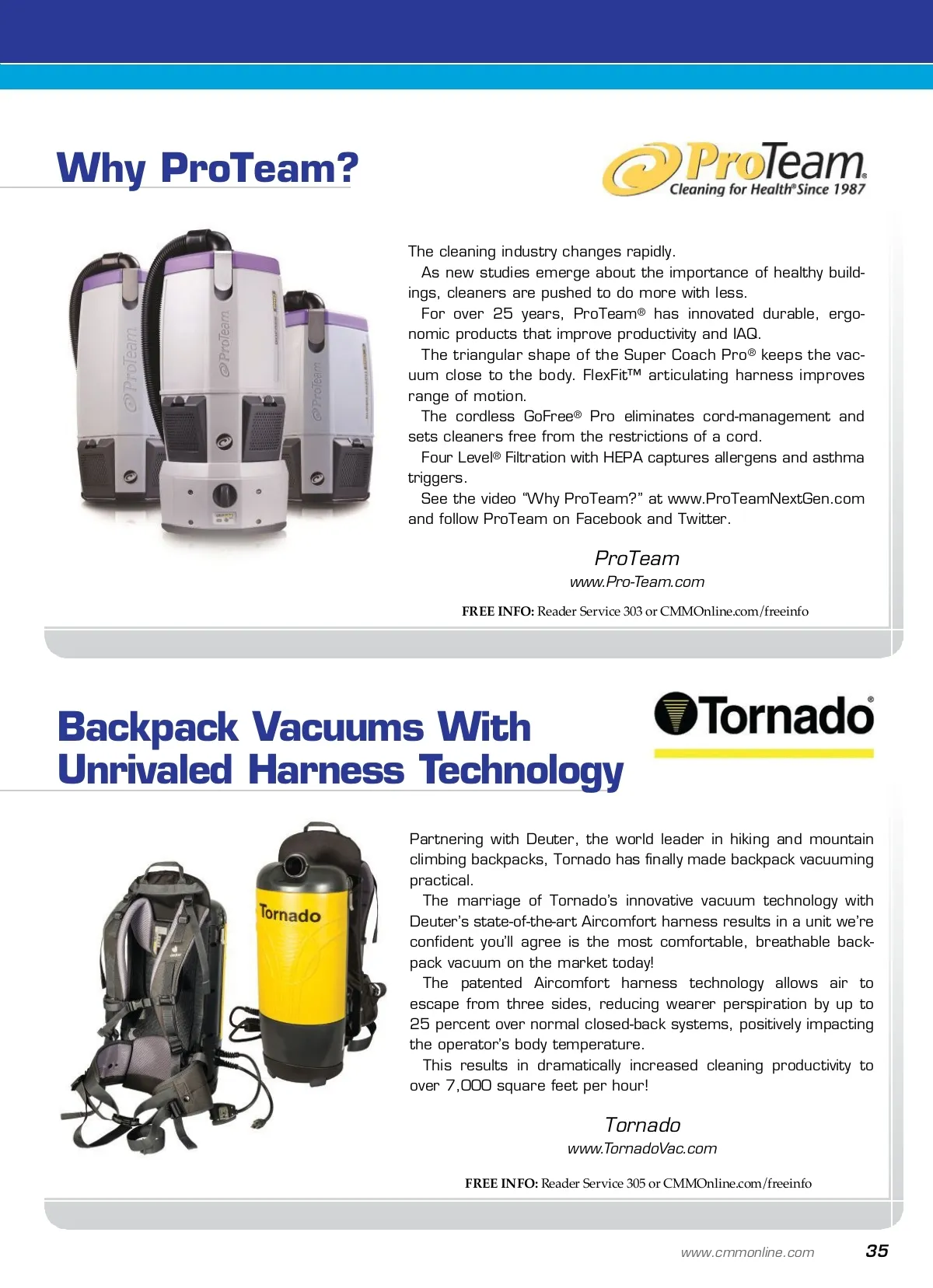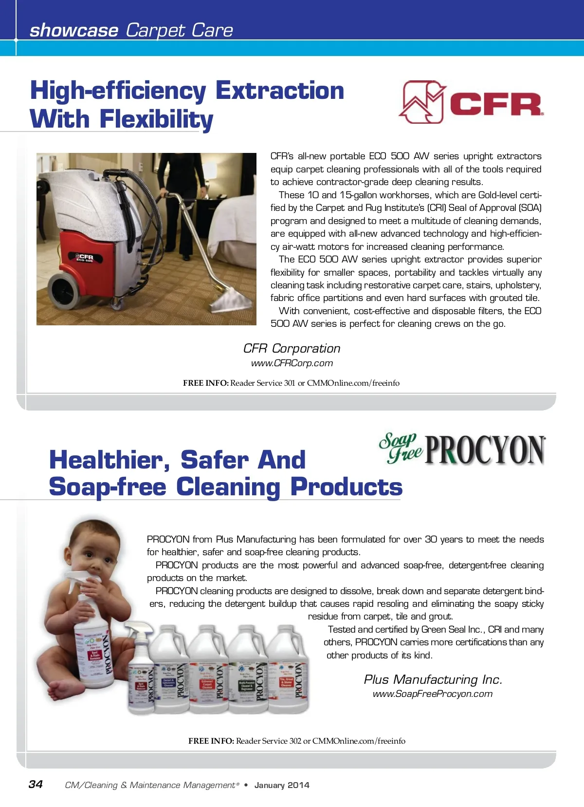 showcase Carpet Care High-efficiency Extraction With Flexibility CFR’s all-new portable ECO 500 AW series upright extractors equip carpet cleaning professionals with all of the tools required to achieve contractor-grade deep cleaning results. These 10 and 15-gallon workhorses, which are Gold-level certi-fied by the Carpet and Rug Institute’s (CRI) Seal of Approval (SOA) program and designed to meet a multitude of cleaning demands, are equipped with all-new advanced technology and high-efficien-cy air-watt motors for increased cleaning performance. The ECO 500 AW series upright extractor provides superior flexibility for smaller spaces, portability and tackles virtually any cleaning task including restorative carpet care, stairs, upholstery, fabric office partitions and even hard surfaces with grouted tile. With convenient, cost-effective and disposable filters, the ECO 500 AW series is perfect for cleaning crews on the go. CFR Corporation www.CFRCorp.com FREE INFO: Reader Service 301 or CMMOnline.com/freeinfo Healthier, Safer And Soap-free Cleaning Products PROCYON from Plus Manufacturing has been formulated for over 30 years to meet the needs for healthier, safer and soap-free cleaning products. PROCYON products are the most powerful and advanced soap-free, detergent-free cleaning products on the market. PROCYON cleaning products are designed to dissolve, break down and separate detergent bind-ers, reducing the detergent buildup that causes rapid resoling and eliminating the soapy sticky residue from carpet, tile and grout. Tested and certified by Green Seal Inc., CRI and many others, PROCYON carries more certifications than any other products of its kind. Plus Manufacturing Inc. www.SoapFreeProcyon.com FREE INFO: Reader Service 302 or CMMOnline.com/freeinfo 34 CM/Cleaning & Maintenance Management ® • January2014