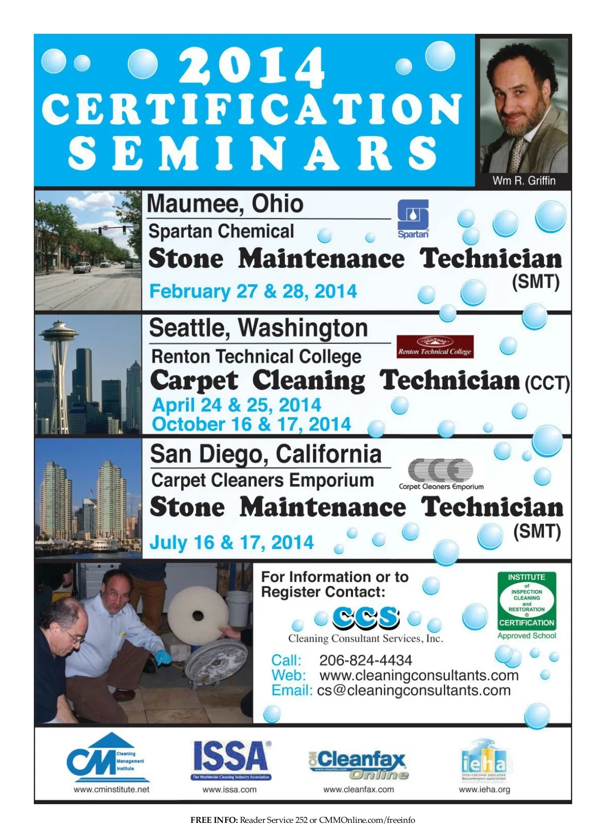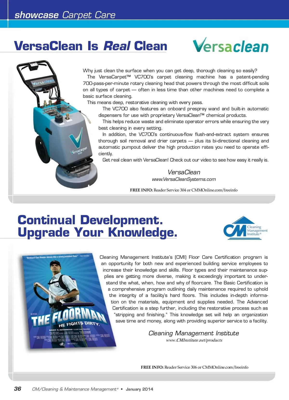 showcase Carpet Care VersaClean Is Real Clean Why just clean the surface when you can get deep, thorough cleaning so easily? The VersaCarpet™ VC700’s carpet cleaning machine has a patent-pending 700-pass-per-minute rotary cleaning head that powers through the most difficult soils on all types of carpet — often in less time than other machines need to complete a basic surface cleaning. This means deep, restorative cleaning with every pass. The VC700 also features an onboard prespray wand and built-in automatic dispensers for use with proprietary VersaClean™ chemical products. This helps reduce waste and eliminate operator errors while ensuring the very best cleaning in every setting. In addition, the VC700’s continuous-flow flush-and-extract system ensures thorough soil removal and drier carpets — plus its bi-directional cleaning and automatic pumpout deliver the high production rates you need to operate effi-ciently. Get real clean with VersaClean! Check out our video to see how easy it really is. VersaClean www.VersaCleanSystems.com FREE INFO: Reader Service 304 or CMMOnline.com/freeinfo Continual Development. Upgrade Your Knowledge. Cleaning Management Institute’s (CMI) Floor Care Certification program is an opportunity for both new and experienced building service employees to increase their knowledge and skills. Floor types and their maintenance sup-plies are getting more diverse, making it exceedingly important to under-stand the what, when, how and why of floorcare. The Basic Certification is a comprehensive program outlining daily maintenance required to uphold the integrity of a facility’s hard floors. This includes in-depth informa-tion on the materials, equipment and supplies needed. The Advanced Certification is a step further, including the restorative process such as “stripping and finishing.” This knowledge set will help an organization save time and money, along with providing superior service to a facility. Cleaning Management Institute www.CMInstitute.net/products FREE INFO: Reader Service 306 or CMMOnline.com/freeinfo 36 CM/Cleaning & Maintenance Management ® • January2014