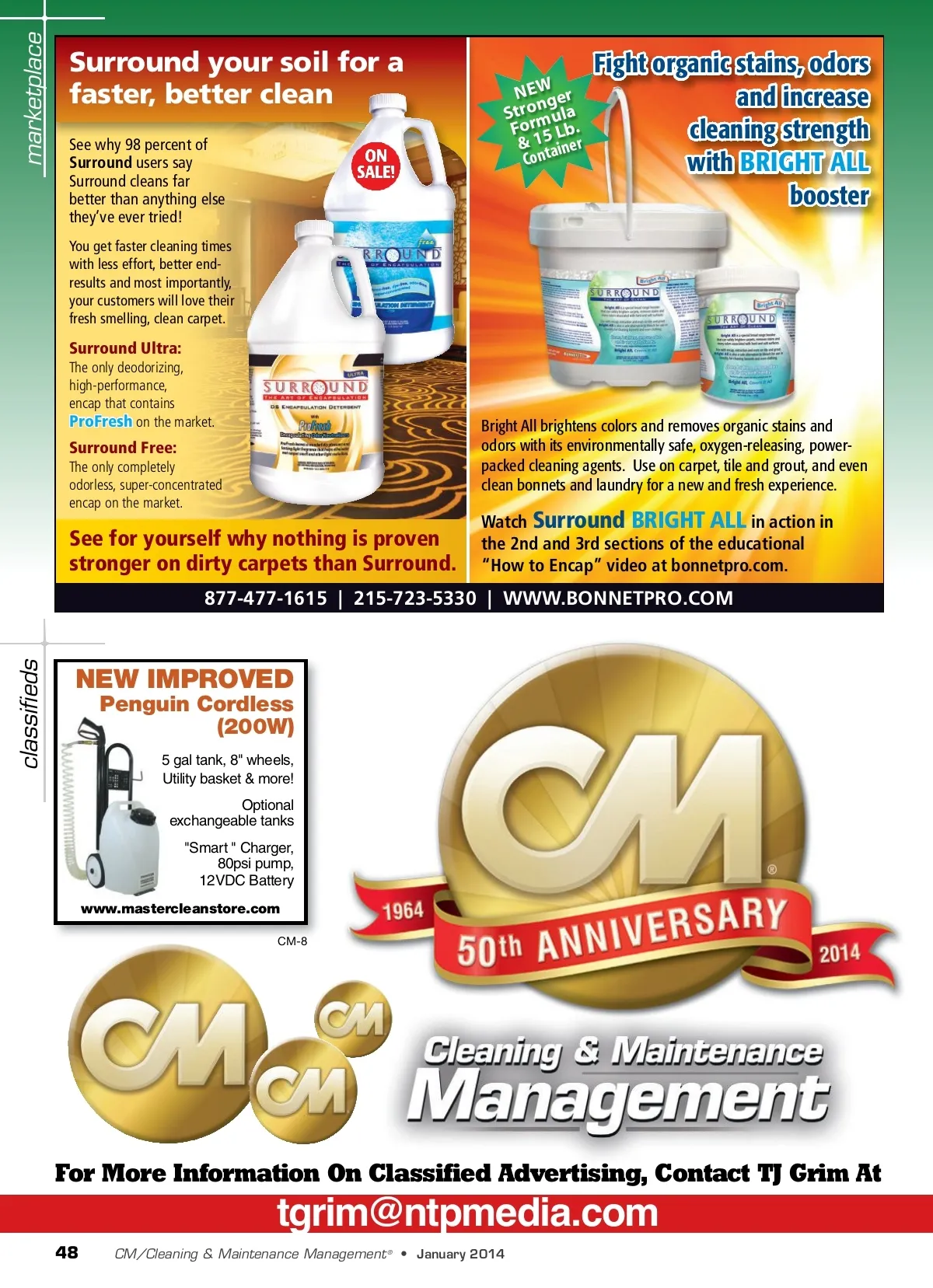 marketplace Surround your soil for a n faster, better clean AM See why 98 percent of Surround users say Surround cleans far better than anything else they’ve ever tried! Page 1 You get faster cleaning times with less effort, better end-results and most importantly, your customers will love their fresh smelling, clean carpet. NEW Stronger Formula Lb. & 15 Container Fight organic stains, odors and increase cleaning strength with BRIGHT ALL booster Surround Ultra: The only deodorizing, high-performance, encap that contains ProFresh on the market. Surround Free: The only completely odorless, super-concentrated encap on the market. Bright All brightens colors and removes organic stains and odors with its environmentally safe, oxygen-releasing, power-packed cleaning agents. Use on carpet, tile and grout, and even clean bonnets and laundry for a new and fresh experience. See for yourself why nothing is proven stronger on dirty carpets than Surround. Watch Surround BRIGHT ALL in action in the 2nd and 3rd sections of the educational “How to Encap” video at bonnetpro.com. 877-477-1615 | 215-723-5330 | WWW.BONNETPRO.COM classifieds NEW IMPROVED Penguin Cordless (200W) 5 gal tank, 8" wheels, Utility basket & more! Optional exchangeable tanks "Smart " Charger, 80psi pump, 12VDC Battery www.mastercleanstore.com CM-8 For More Information On Classified Advertising, Contact TJ Grim At [email protected] 48 CM/Cleaning & Maintenance Management ® • January 2014