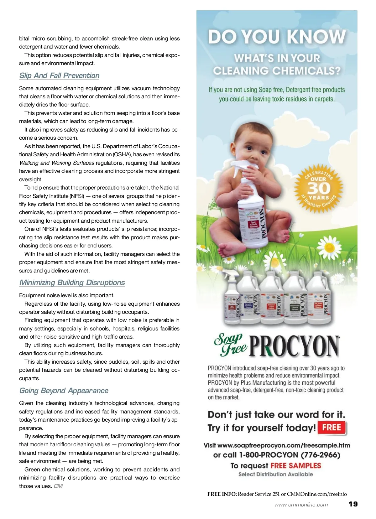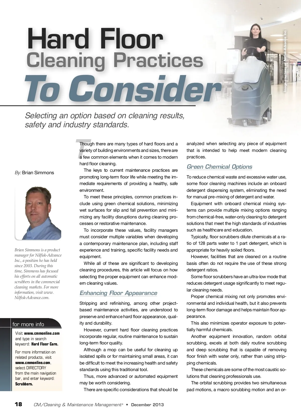 Cleaning Practices To Consider Selecting an option based on cleaning results, safety and industry standards. T By: Brian Simmons Brian Simmons is a product manager for Nilfisk-Advance Inc., a position he has held since 2003. During this time, Simmons has focused his efforts on all automatic scrubbers in the commercial cleaning markets. For more information, visit www. Nilfisk-Advance.com. Though there are many types of hard floors and a variety of building environments and sizes, there are a few common elements when it comes to modern hard floor cleaning. The keys to current maintenance practices are promoting long-term floor life while meeting the im-mediate requirements of providing a healthy, safe environment. To meet these principles, common practices in-clude using green chemical solutions, minimizing wet surfaces for slip and fall prevention and mini-mizing any facility disruptions during cleaning pro-cesses or restorative maintenance. To incorporate these values, facility managers must consider multiple variables when developing a contemporary maintenance plan, including staff experience and training, specific facility needs and equipment. While all of these are significant to developing cleaning procedures, this article will focus on how selecting the proper equipment can enhance mod-ern cleaning values. analyzed when selecting any piece of equipment that is intended to help meet modern cleaning practices. Green Chemical Options To reduce chemical waste and excessive water use, some floor cleaning machines include an onboard detergent dispensing system, eliminating the need for manual pre-mixing of detergent and water. Equipment with onboard chemical mixing sys-tems can provide multiple mixing options ranging from chemical-free, water-only cleaning to detergent solutions that meet the high standards of industries such as healthcare and education. Typically, floor scrubbers dilute chemicals at a ra-tio of 128 parts water to 1 part detergent, which is appropriate for heavily soiled floors. However, facilities that are cleaned on a routine basis often do not require the use of these strong detergent ratios. Some floor scrubbers have an ultra-low mode that reduces detergent usage significantly to meet regu-lar cleaning needs. Proper chemical mixing not only promotes envi-ronmental and individual health, but it also prevents long-term floor damage and helps maintain floor ap-pearance. This also minimizes operator exposure to poten-tially harmful chemicals. Another equipment innovation, random orbital scrubbing, excels at both daily routine scrubbing and deep scrubbing that is capable of removing floor finish with water only, rather than using strip-ping chemicals. These chemicals are some of the most caustic so-lutions that cleaning professionals use. The orbital scrubbing provides two simultaneous pad motions, a macro scrubbing motion and an or-Enhancing Floor Appearance Stripping and refinishing, among other project-based maintenance activities, are understood to preserve and enhance hard floor appearance, qual-ity and durability. However, current hard floor cleaning practices incorporate regular, routine maintenance to sustain long-term floor quality. Although a mop can be useful for cleaning up isolated spills or for maintaining small areas, it can be difficult to meet the increasing health and safety standards using this traditional tool. Thus, more advanced or automated equipment may be worth considering. There are specific considerations that should be for more info Visit www.cmmonline.com and type in search keyword: Hard Floor Care. For more information on related products, visit www.cmmonline.com , select DIRECTORY from the main navigation bar, and enter keyword: Scrubbers. 18 CM/Cleaning & Maintenance Management ® • December 2013 Image courtesy of Nilfisk-Advance Inc. Hard Floor