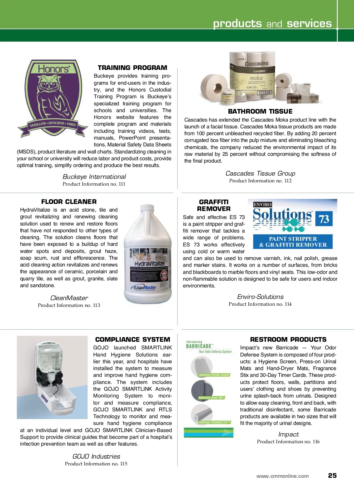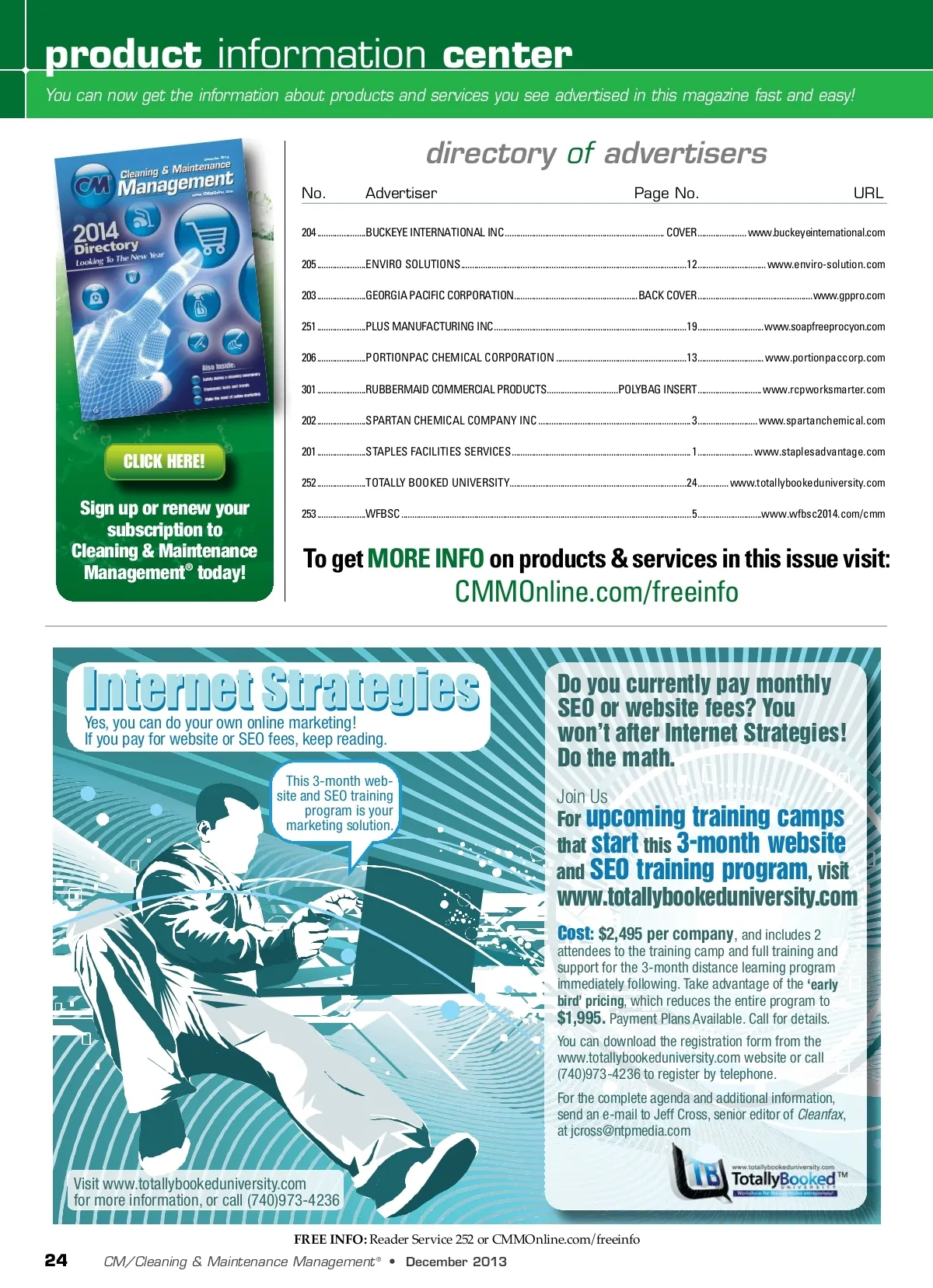 product information center You can now get the information about products and services you see advertised in this magazine fast and easy! December 2013 directory of advertisers No. Advertiser Page No. URL 204 ......................BUCKEYE INTERNATIONAL INC ........................................................................ COVER ...................... www.buckeyeinternational.com 205 ......................ENVIRO SOLUTIONS ......................................................................................................12 ...............................www.enviro-solution.com 203 ......................GEORGIA PACIFIC CORPORATION ........................................................BACK COVER ....................................................www.gppro.com 251 ......................PLUS MANUFACTURING INC .......................................................................................19 ..............................www.soapfreeprocyon.com 206 ......................PORTIONPAC CHEMICAL CORPORATION ...........................................................13 ..............................www.portionpaccorp.com 301 ......................RUBBERMAID COMMERCIAL PRODUCTS ................................POLYBAG INSERT .............................www.rcpworksmarter.com www.CMMOnline.com V G GRAND GROUP VIEW MEDIA AM 11/27/13 11:05 over.indd 1 202 ......................SPARTAN CHEMICAL COMPANY INC .....................................................................3 ........................... www.spartanchemical.com CLICK HERE! Sign up or renew your subscription to Cleaning & Maintenance Management ® today! 201 ......................STAPLES FACILITIES SERVICES .................................................................................1 ......................... www.staplesadvantage.com 252 ......................TOTALLY BOOKED UNIVERSITY ................................................................................24 ..............www.totallybookeduniversity.com 253 ......................WFBSC ...................................................................................................................................5 .............................www.wfbsc2014.com/cmm To get MORE INFO on products & services in this issue visit: CMMOnline.com/freeinfo Do you currently pay monthly SEO or website fees? You won’t after Internet Strategies! Do the math. Join Us Internet Strategies Yes, you can do your own online marketing! If you pay for website or SEO fees, keep reading. This 3-month web-site and SEO training program is your marketing solution. For upcoming training camps that start this 3-month website and SEO training program , visit www.totallybookeduniversity.com Cost: $2,495 per company , and includes 2 attendees to the training camp and full training and support for the 3-month distance learning program immediately following. Take advantage of the ‘early bird’ pricing , which reduces the entire program to $1,995. Payment Plans Available. Call for details. You can download the registration form from the www.totallybookeduniversity.com website or call (740)973-4236 to register by telephone. For the complete agenda and additional information, send an e-mail to Jeff Cross, senior editor of Cleanfax , at [email protected] Visit www.totallybookeduniversity.com for more information, or call (740)973-4236 FREE INFO: Reader Service 252 or CMMOnline.com/freeinfo 24 CM/Cleaning & Maintenance Management ® • December 2013