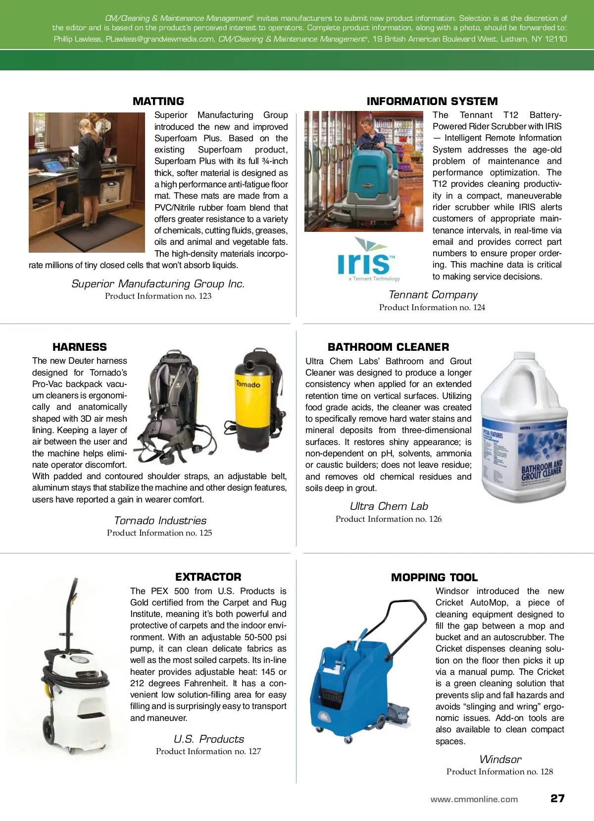 products and services CLEANING SYSTEM Kaivac Inc., developer of the No-Touch Cleaning system, was the first no-touch cleaning option in the professional cleaning industry. The Kaivac 2150, which is designed specifically for larger facilities, has a 21-gallon fresh water tank and 19-gallon recovery tank. Its 500 psi spray capability can help deep-clean all types of surfaces. With a chemical injection and wet vacuum system, users can deep-clean — without touching — soiled, con-taminated surfaces. BRUSHES The Malish Corporation, a manufacturer and marketer of rotary/disc brushes for commercial floor cleaning machines, announced a line of Color-Coded Grit Brushes and other sanitary brush products. The Color-Coded grit brushes offer a wide range of cleaning solutions and are well-suited for companies seeking a cost-competitive and customized green solution. Malish provides a range of products and services that meet or exceed the highest sanitation requirements. The Malish Corporation Product Information no. 118 Kaivac Inc. Product Information no. 117 MATTING Mats Inc. announced Journey 7000, matting that unites perfor-mance rated for high traffic mat-ting with a fashionable linear design for more contemporary buildings. The dual-fiber construc-tion combines absorbent nylon fibers that remove moisture and course fibers that scrape off dirt. Flexion vinyl backing prevents dirt and moisture from reaching the floor underneath. Mats are available in standard sizes and four different colors including Acadia blue, Galapagos green, Sahara brown and Denali gray. CLEANING PRODUCTS Rubbermaid Commercial Products (RCP) announced the availability of the Executive Series. Created after field research, the Executive Series includes sup-plies and materials that match the look and feel of high-end proper-ties. Featuring a black and sil-ver uniform design, the Executive Series blends into an upscale environment, conceals supplies and reduces noise. Coverage includes guest reception, lobby and public areas; guest rooms; conference/meeting rooms and business centers; restaurants and kitchens; and pool, spa and fitness centers. Mats Inc. Product Information no. 119 Rubbermaid Commercial Products Product Information no. 120 EXTRACTOR Sanitaire now offers the SC6095 self-contained 9-gallon extrac-tor that features a wide-cleaning path, strong cleaning power and easy operation. The stainless steel brush housing and motorized chevron brushroll cleans an 18-inch wide path of carpet for efficient cleaning. The wide cleaning path reduces cleaning time and helps provide cost savings for clean-ing professionals. The SC6095 extractor also is designed for easy operation. The see-through recovery tank lid and easy-access solution switch make operation convenient. PAPER TOWELS SCA introduced a collection of Tork high-end hand towels and dis-pensers to offer solutions for Class A office buildings, fine dining restaurants and other top-tier establishments. The towels feature an embossed leaf design, and the Xpress Countertop dispensers include finger-proof technology, anti-slip pads and one-at-a-time dispensing. This type of dispensing can reduce paper use. Sanitaire Product Information no. 121 SCA Product Information no. 122 26 CM/Cleaning & Maintenance Management ® • December 2013