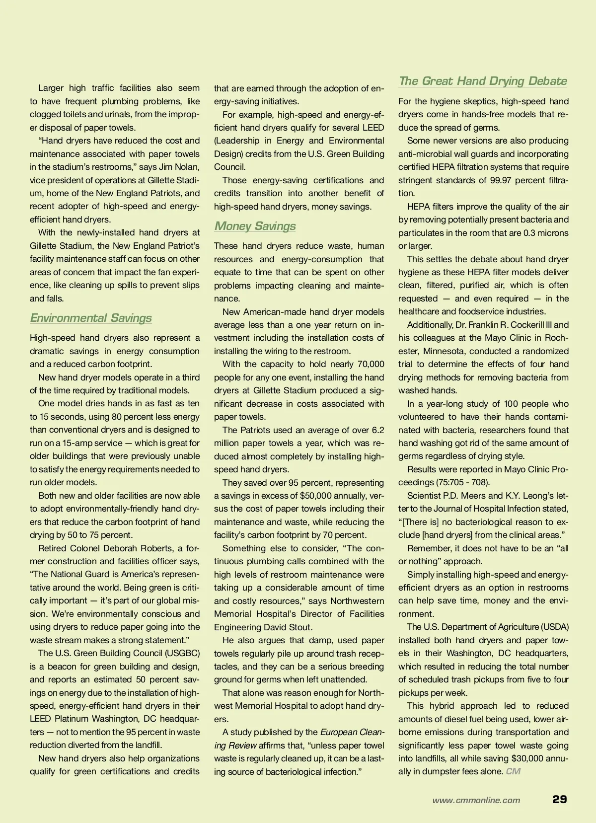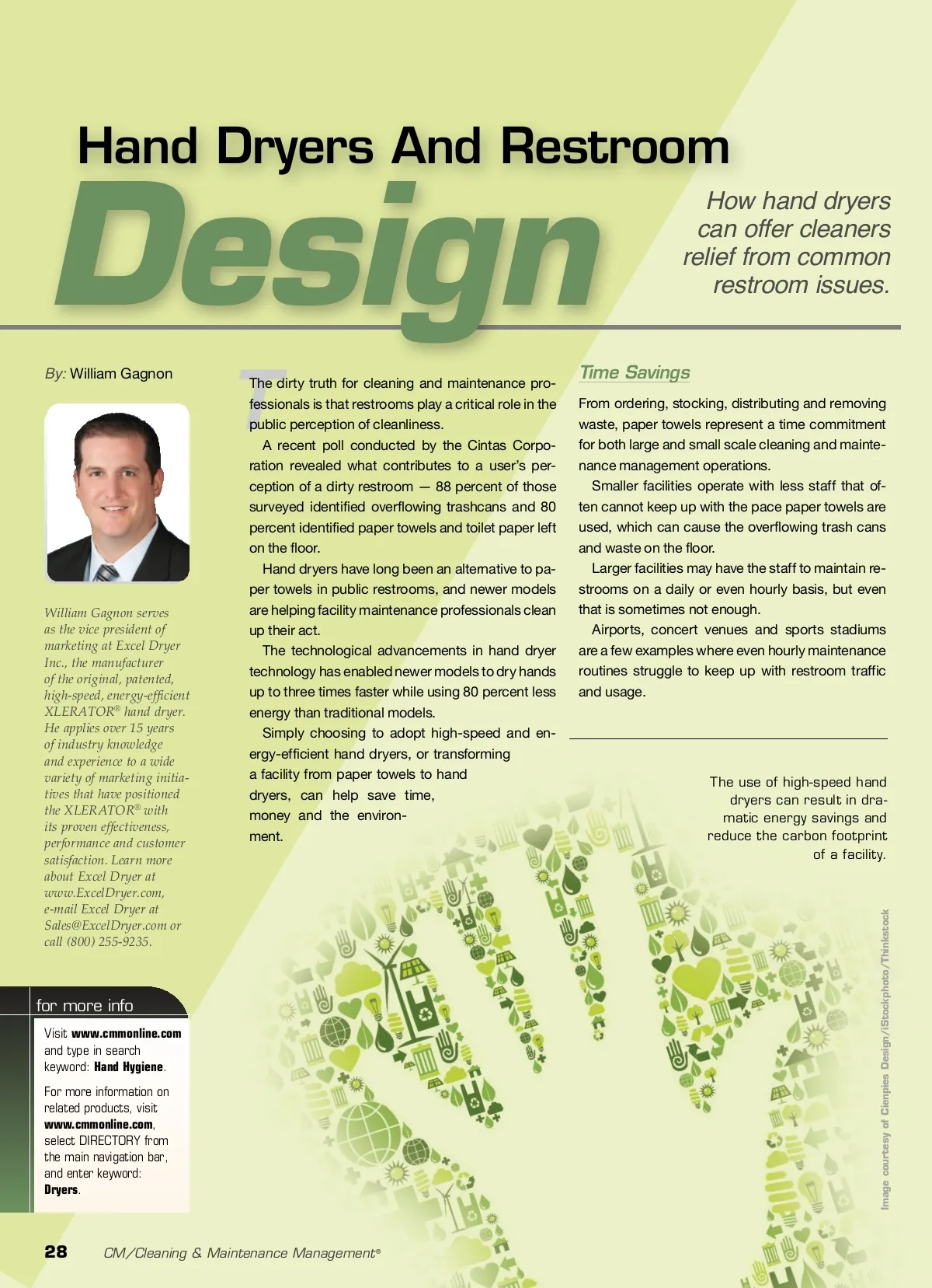 Hand Dryers And Restroom Design By: William Gagnon How hand dryers can offer cleaners relief from common restroom issues. T for more info Visit www.cmmonline.com and type in search keyword: Hand Hygiene . For more information on related products, visit www.cmmonline.com , select DIRECTORY from the main navigation bar, and enter keyword: Dryers . 28 CM/Cleaning & Maintenance Management ® Image courtesy of Cienpies Design/iStockphoto/Thinkstock William Gagnon serves as the vice president of marketing at Excel Dryer Inc., the manufacturer of the original, patented, high-speed, energy-efficient XLERATOR ® hand dryer. He applies over 15 years of industry knowledge and experience to a wide variety of marketing initia-tives that have positioned the XLERATOR ® with its proven effectiveness, performance and customer satisfaction. Learn more about Excel Dryer at www.ExcelDryer.com, e-mail Excel Dryer at [email protected] or call (800) 255-9235. The dirty truth for cleaning and maintenance pro-fessionals is that restrooms play a critical role in the public perception of cleanliness. A recent poll conducted by the Cintas Corpo-ration revealed what contributes to a user’s per-ception of a dirty restroom — 88 percent of those surveyed identified overflowing trashcans and 80 percent identified paper towels and toilet paper left on the floor. Hand dryers have long been an alternative to pa-per towels in public restrooms, and newer models are helping facility maintenance professionals clean up their act. The technological advancements in hand dryer technology has enabled newer models to dry hands up to three times faster while using 80 percent less energy than traditional models. Simply choosing to adopt high-speed and en-ergy-efficient hand dryers, or transforming a facility from paper towels to hand dryers, can help save time, money and the environ-ment. Time Savings From ordering, stocking, distributing and removing waste, paper towels represent a time commitment for both large and small scale cleaning and mainte-nance management operations. Smaller facilities operate with less staff that of-ten cannot keep up with the pace paper towels are used, which can cause the overflowing trash cans and waste on the floor. Larger facilities may have the staff to maintain re-strooms on a daily or even hourly basis, but even that is sometimes not enough. Airports, concert venues and sports stadiums are a few examples where even hourly maintenance routines struggle to keep up with restroom traffic and usage. The use of high-speed hand dryers can result in dra-matic energy savings and reduce the carbon footprint of a facility.