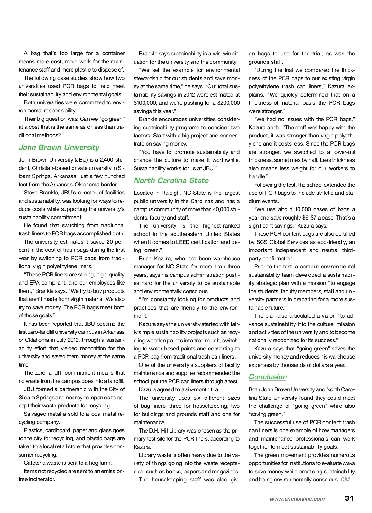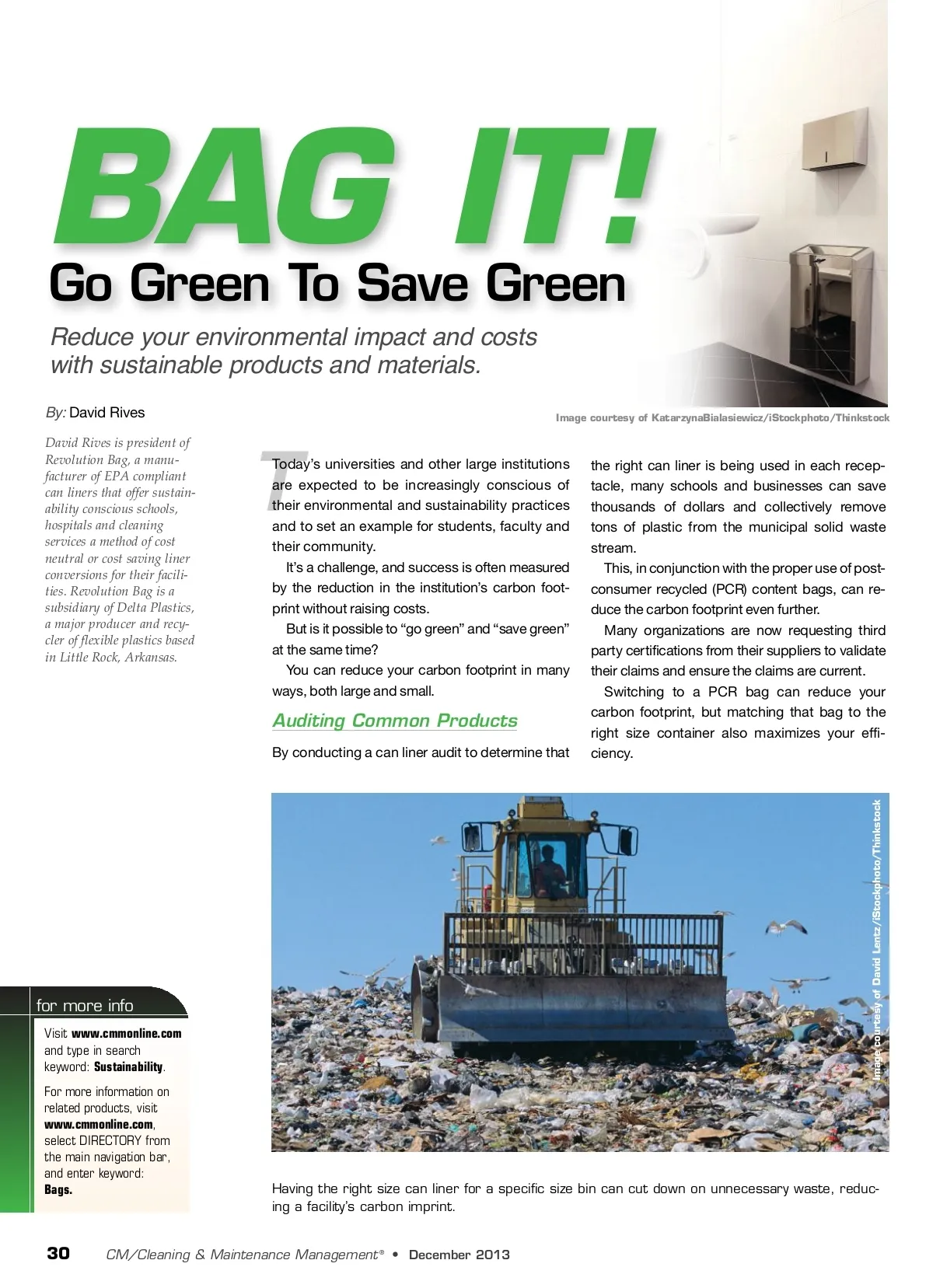 BAG IT! Go Green To Save Green Reduce your environmental impact and costs with sustainable products and materials. By: David Rives David Rives is president of Revolution Bag, a manu-facturer of EPA compliant can liners that offer sustain-ability conscious schools, hospitals and cleaning services a method of cost neutral or cost saving liner conversions for their facili-ties. Revolution Bag is a subsidiary of Delta Plastics, a major producer and recy-cler of flexible plastics based in Little Rock, Arkansas. Image courtesy of KatarzynaBialasiewicz/iStockphoto/Thinkstock T Today’s universities and other large institutions are expected to be increasingly conscious of their environmental and sustainability practices and to set an example for students, faculty and their community. It’s a challenge, and success is often measured by the reduction in the institution’s carbon foot-print without raising costs. But is it possible to “go green” and “save green” at the same time? You can reduce your carbon footprint in many ways, both large and small. Auditing Common Products By conducting a can liner audit to determine that the right can liner is being used in each recep-tacle, many schools and businesses can save thousands of dollars and collectively remove tons of plastic from the municipal solid waste stream. This, in conjunction with the proper use of post-consumer recycled (PCR) content bags, can re-duce the carbon footprint even further. Many organizations are now requesting third party certifications from their suppliers to validate their claims and ensure the claims are current. Switching to a PCR bag can reduce your carbon footprint, but matching that bag to the right size container also maximizes your effi-ciency. for more info Visit www.cmmonline.com and type in search keyword: Sustainability . For more information on related products, visit www.cmmonline.com , select DIRECTORY from the main navigation bar, and enter keyword: Bags. Having the right size can liner for a specific size bin can cut down on unnecessary waste, reduc-ing a facility’s carbon imprint. 30 CM/Cleaning & Maintenance Management ® • December 2013 Image courtesy of David Lentz/iStockphoto/Thinkstock