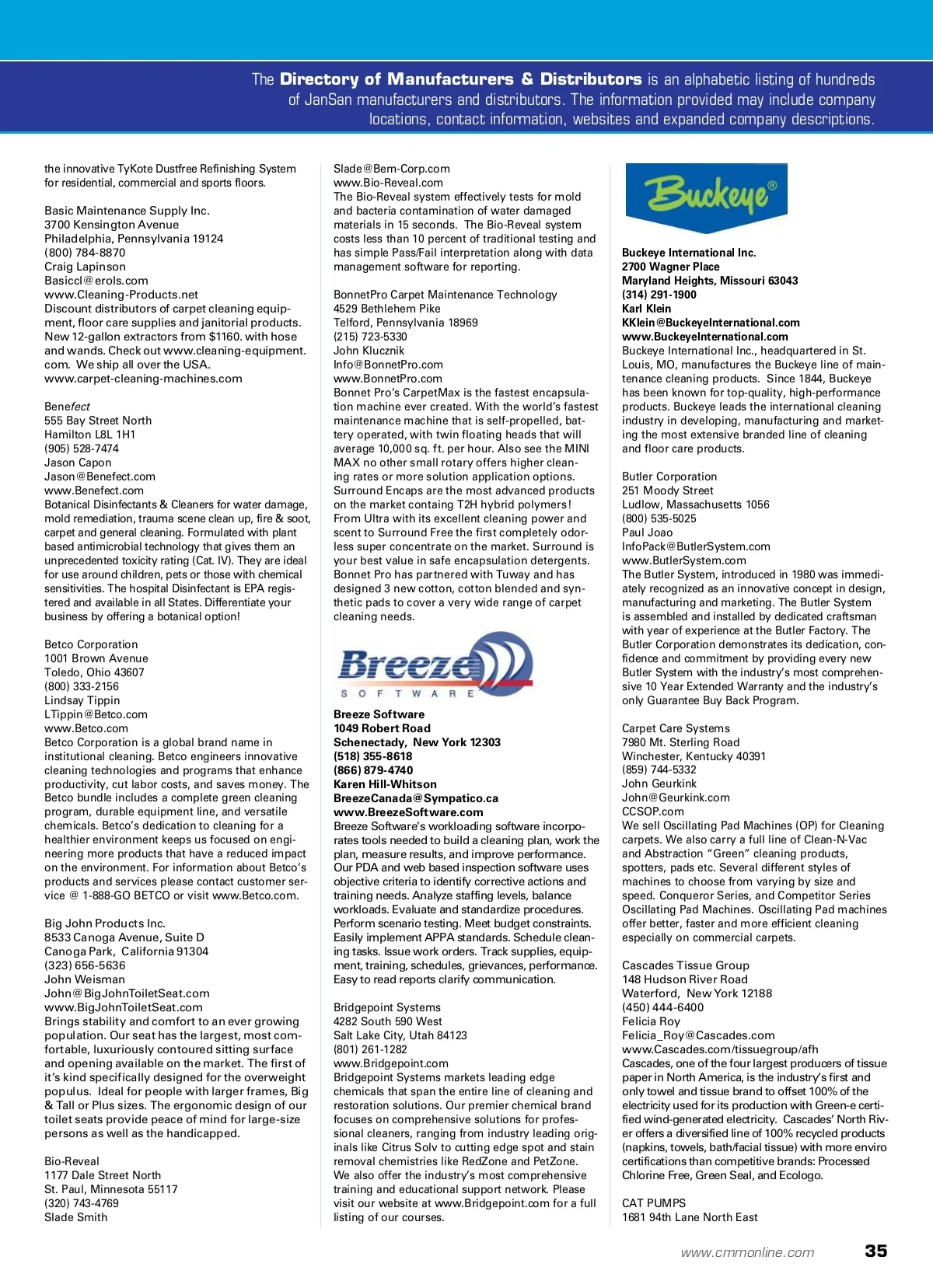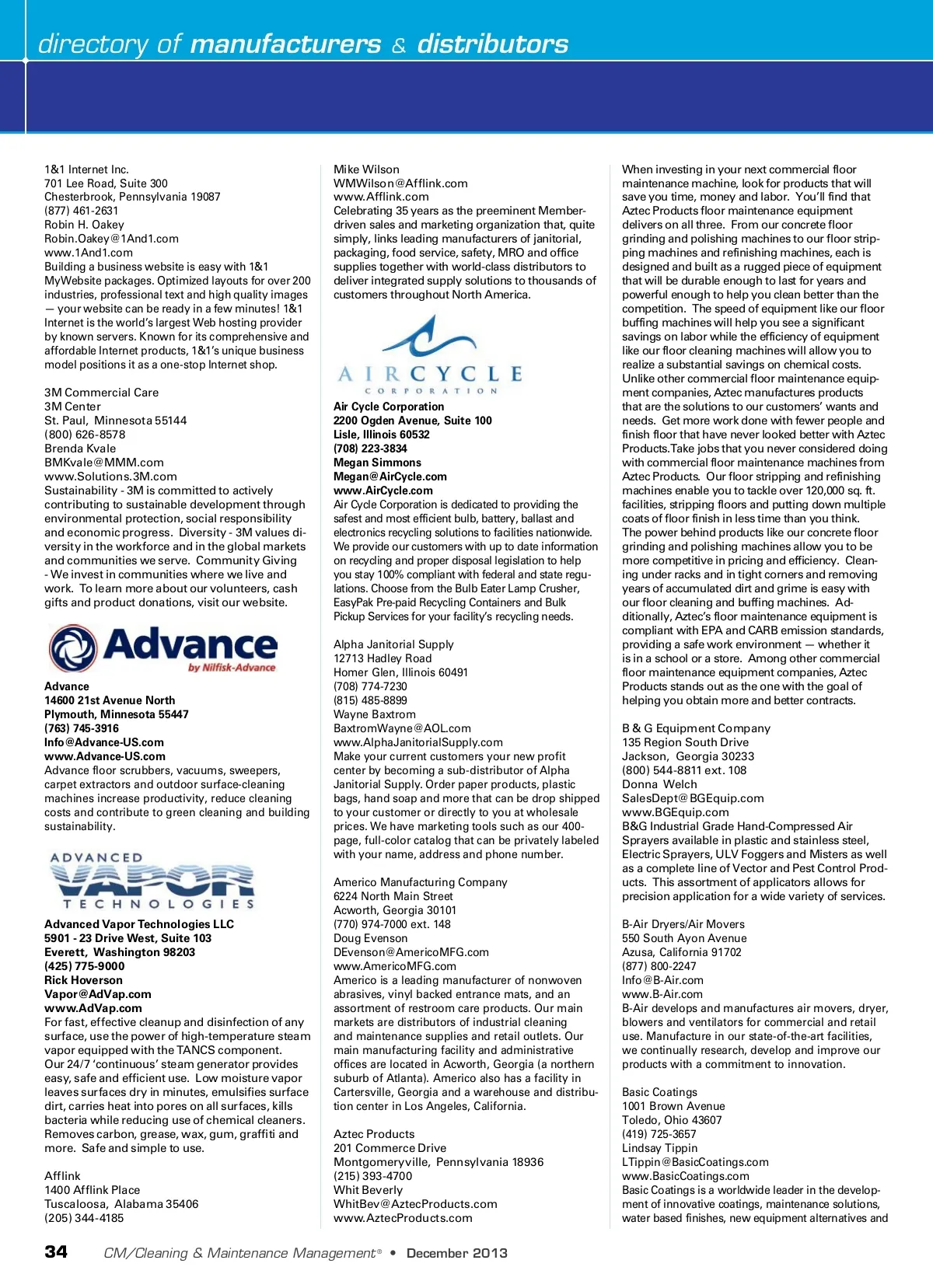 directory of manufacturers & distributors 1&1 Internet Inc. 701 Lee Road, Suite 300 Chesterbrook, Pennsylvania 19087 (877) 461-2631 Robin H. Oakey [email protected] www.1And1.com Building a business website is easy with 1&1 MyWebsite packages. Optimized layouts for over 200 industries, professional text and high quality images — your website can be ready in a few minutes! 1&1 Internet is the world’s largest Web hosting provider by known servers. Known for its comprehensive and affordable Internet products, 1&1’s unique business model positions it as a one-stop Internet shop. 3M Commercial Care 3M Center St. Paul, Minnesota 55144 (800) 626-8578 Brenda Kvale [email protected] www.Solutions.3M.com Sustainability -3M is committed to actively contributing to sustainable development through environmental protection, social responsibility and economic progress. Diversity -3M values di-versity in the workforce and in the global markets and communities we serve. Community Giving -We invest in communities where we live and work. To learn more about our volunteers, cash gifts and product donations, visit our website. Mike Wilson [email protected] www.Afflink.com Celebrating 35 years as the preeminent Member-driven sales and marketing organization that, quite simply, links leading manufacturers of janitorial, packaging, food service, safety, MRO and office supplies together with world-class distributors to deliver integrated supply solutions to thousands of customers throughout North America. Air Cycle Corporation 2200 Ogden Avenue, Suite 100 Lisle, Illinois 60532 (708) 223-3834 Megan Simmons [email protected] www.AirCycle.com Air Cycle Corporation is dedicated to providing the safest and most efficient bulb, battery, ballast and electronics recycling solutions to facilities nationwide. We provide our customers with up to date information on recycling and proper disposal legislation to help you stay 100% compliant with federal and state regu-lations. Choose from the Bulb Eater Lamp Crusher, EasyPak Pre-paid Recycling Containers and Bulk Pickup Services for your facility’s recycling needs. Alpha Janitorial Supply 12713 Hadley Road Homer Glen, Illinois 60491 (708) 774-7230 (815) 485-8899 Wayne Baxtrom [email protected] www.AlphaJanitorialSupply.com Make your current customers your new profit center by becoming a sub-distributor of Alpha Janitorial Supply. Order paper products, plastic bags, hand soap and more that can be drop shipped to your customer or directly to you at wholesale prices. We have marketing tools such as our 400-page, full-color catalog that can be privately labeled with your name, address and phone number. Americo Manufacturing Company 6224 North Main Street Acworth, Georgia 30101 (770) 974-7000 ext. 148 Doug Evenson [email protected] www.AmericoMFG.com Americo is a leading manufacturer of nonwoven abrasives, vinyl backed entrance mats, and an assortment of restroom care products. Our main markets are distributors of industrial cleaning and maintenance supplies and retail outlets. Our main manufacturing facility and administrative offices are located in Acworth, Georgia (a northern suburb of Atlanta). Americo also has a facility in Cartersville, Georgia and a warehouse and distribu-tion center in Los Angeles, California. Aztec Products 201 Commerce Drive Montgomeryville, Pennsylvania 18936 (215) 393-4700 Whit Beverly [email protected] www.AztecProducts.com Advance 14600 21st Avenue North Plymouth, Minnesota 55447 (763) 745-3916 [email protected] www.Advance-US.com Advance floor scrubbers, vacuums, sweepers, carpet extractors and outdoor surface-cleaning machines increase productivity, reduce cleaning costs and contribute to green cleaning and building sustainability. When investing in your next commercial floor maintenance machine, look for products that will save you time, money and labor. You’ll find that Aztec Products floor maintenance equipment delivers on all three. From our concrete floor grinding and polishing machines to our floor strip-ping machines and refinishing machines, each is designed and built as a rugged piece of equipment that will be durable enough to last for years and powerful enough to help you clean better than the competition. The speed of equipment like our floor buffing machines will help you see a significant savings on labor while the efficiency of equipment like our floor cleaning machines will allow you to realize a substantial savings on chemical costs. Unlike other commercial floor maintenance equip-ment companies, Aztec manufactures products that are the solutions to our customers’ wants and needs. Get more work done with fewer people and finish floor that have never looked better with Aztec Products.Take jobs that you never considered doing with commercial floor maintenance machines from Aztec Products. Our floor stripping and refinishing machines enable you to tackle over 120,000 sq. ft. facilities, stripping floors and putting down multiple coats of floor finish in less time than you think. The power behind products like our concrete floor grinding and polishing machines allow you to be more competitive in pricing and efficiency. Clean-ing under racks and in tight corners and removing years of accumulated dirt and grime is easy with our floor cleaning and buffing machines. Ad-ditionally, Aztec’s floor maintenance equipment is compliant with EPA and CARB emission standards, providing a safe work environment — whether it is in a school or a store. Among other commercial floor maintenance equipment companies, Aztec Products stands out as the one with the goal of helping you obtain more and better contracts. B & G Equipment Company 135 Region South Drive Jackson, Georgia 30233 (800) 544-8811 ext. 108 Donna Welch [email protected] www.BGEquip.com B&G Industrial Grade Hand-Compressed Air Sprayers available in plastic and stainless steel, Electric Sprayers, ULV Foggers and Misters as well as a complete line of Vector and Pest Control Pro