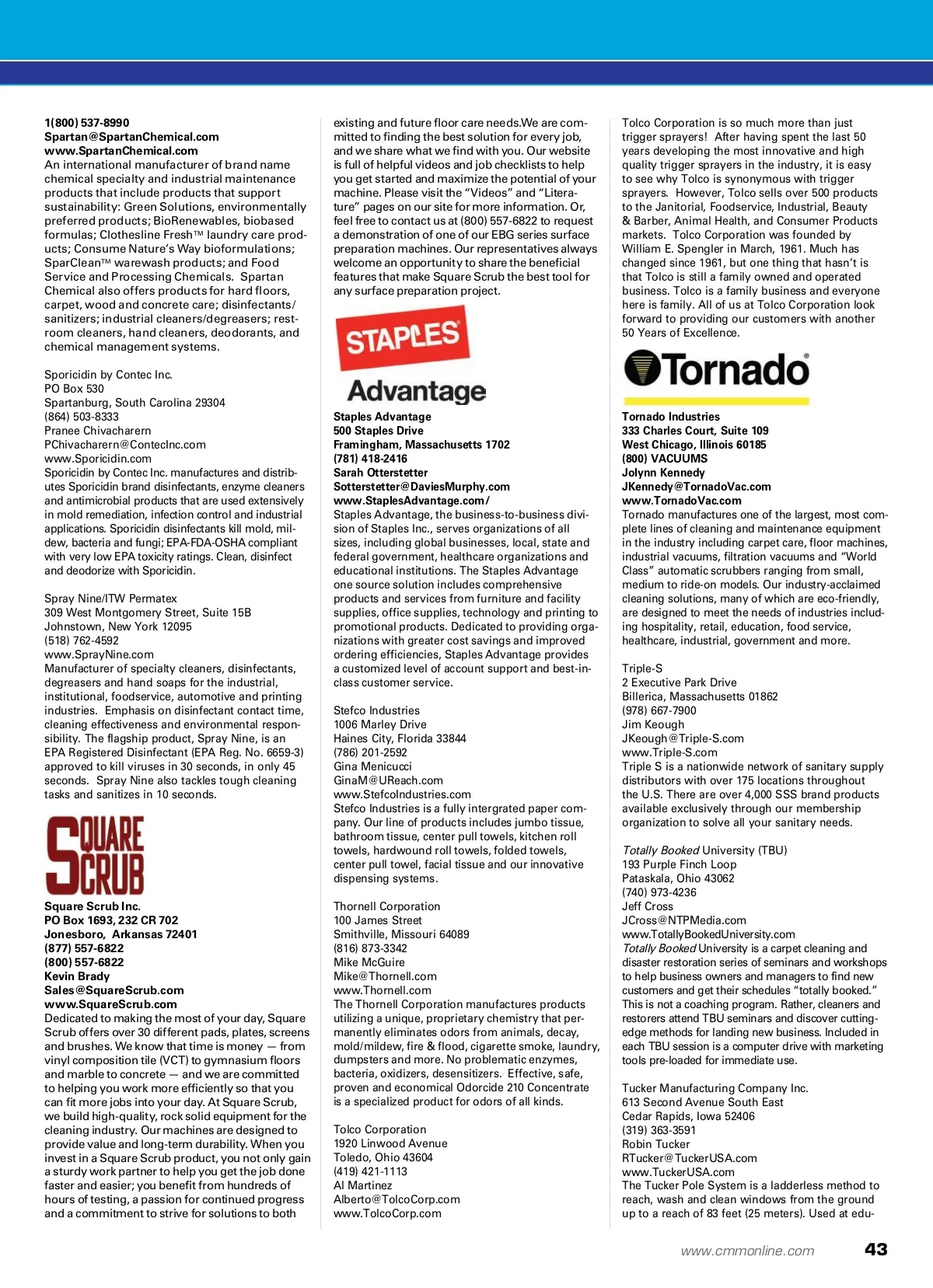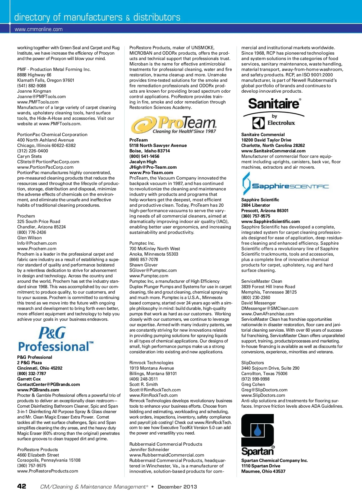 directory of manufacturers www.cmmonline.com working together with Green Seal and Carpet and Rug Institute, we have increase the efficiency of Procyon and the power of Procyon will blow your mind. PMF -Production Metal Forming Inc. 8888 Highway 66 Klamath Falls, Oregon 97601 (541) 882-9088 Joanne Kingman [email protected] www.PMFTools.com Manufacturer of a large variety of carpet cleaning wands, upholstery cleaning tools, hard surface tools, the Hide-A-Hose and accessories. Visit our website at www.PMFTools.com. PortionPac Chemical Corporation 400 North Ashland Avenue Chicago, Illinois 60622-6382 (312) 226-0400 Caryn Stets [email protected] www.PortionPacCorp.com PortionPac manufactures highly concentrated, pre-measured cleaning products that reduce the resources used throughout the lifecycle of produc-tion, storage, distribution and disposal, minimize the adverse effects of chemicals on the environ-ment, and eliminate the unsafe and ineffective habits of traditional cleaning procedures. Prochem 325 South Price Road Chandler, Arizona 85224 (800) 776-2436 Glen Wilson [email protected] www.Prochem.com Prochem is a leader in the professional carpet and fabric care industry as a result of establishing a supe-rior standard of quality and performance bolstered by a relentless dedication to strive for advancement in design and technology. Across the country and around the world, Prochem has set the industry stan-dard since 1968. This was accomplished by our com-mitment; to produce quality, to our customers, and to your success. Prochem is committed to continuing this trend as we move into the future with ongoing research and development to bring forth even better, more efficient equipment and technology to help you achieve your goals in your business endeavors. & distributors mercial and institutional markets worldwide. Since 1968, RCP has pioneered technologies and system solutions in the categories of food services, sanitary maintenance, waste handling, material transport, away-from-home washroom, and safety products. RCP, an ISO 9001:2000 manufacturer, is part of Newell Rubbermaid’s global portfolio of brands and continues to develop innovative products. ProRestore Products, maker of UNSMOKE, MICROBAN and ODORx products, offers the prod-ucts and technical support that professionals trust. Microban is the name for effective antimicrobial treatments for professional cleaning, water and fire restoration, trauma cleanup and more. Unsmoke provides time-tested solutions for the smoke and fire remediation professionals and ODORx prod-ucts are known for providing broad spectrum odor control applications. ProRestore provides train-ing in fire, smoke and odor remediation through Restoration Sciences Academy. ProTeam 5118 North Sawyer Avenue Boise, Idaho 83714 (800) 541-1456 Jacalyn High [email protected] www.Pro-Team.com ProTeam, the Vacuum Company innovated the backpack vacuum in 1987, and has continued to revolutionize the cleaning and maintenance industry with products and programs that help workers get the deepest, most efficient and productive clean. Today, ProTeam has 20 high-performance vacuums to serve the vary-ing needs of all commercial cleaners, aimed at dramatically improving indoor air quality (IAQ), enabling better user ergonomics, and increasing sustainability and productivity. Pumptec Inc. 700 McKinley North West Anoka, Minnesota 55303 (866) 857-7078 Shawn Glover [email protected] www.Pumptec.com Pumptec Inc, a manufacturer of High Efficiency Duplex Plunger Pumps and Systems for use in carpet cleaning, tile and grout cleaning, chemical spraying and much more. Pumptec is a U.S.A., Minnesota based company, started over 24 years ago with a sim-ple philosophy in mind: build durable, high-quality pumps that work as hard as our customers. Working closely with our customers, we continue to leverage our expertise. Armed with many industry patents, we are constantly striving for new innovations related in providing pumping solutions for spraying liquids in all types of chemical applications. Our designs of small, high performance pumps make us a strong consideration into existing and new applications. Rimrock Technologies 1919 Montana Avenue Billings, Montana 59101 (406) 248-3511 Scott R. Smith [email protected] www.RimRockTech.com Rimrock Technologies develops revolutionary business tools to enhance your business efforts. Choose from bidding and estimating, workloading and scheduling, work orders, inspections, inventory, safety compliance and payroll job costing! Check out www.RimRockTech. com to see how Executive ToolKit Version 5.0 can add the power and versatility you need. Rubbermaid Commercial Products Jennifer Schneider www.RubbermaidCommercial.com Rubbermaid Commercial Products, headquar-tered in Winchester, Va., is a manufacturer of innovative, solution-based products for com-Sanitaire Commercial 10200 David Taylor Drive Charlotte, North Carolina 28262 www.SanitaireCommercial.com Manufacturer of commercial floor care equip-ment including uprights, canisters, back vac, floor machines, extractors and air movers. Sapphire Scientific 2604 Liberator Prescott, Arizona 86301 (360) 757-9575 www.SapphireScientific.com Sapphire Scientific has developed a complete, integrated system for carpet cleaning profession-als designed for ease of application, deep residue-free cleaning and enhanced efficiency. Sapphire Scientific offers a revolutionary line of Sapphire Scientific truckmounts, tools and accessories, plus a complete line of innovative chemical products for carpet, upholstery, rug and hard surface cleaning. ServiceMaster Clean 3839 Forest Hill Irene Road Memphis, Tennessee 38125 (800) 230-2360 David Messenger [email protected] www.OwnAFranchise.com ServiceMaster Clean has franchise opportunities nationwide in disaster restoration, floor care and jani-torial cleaning services. With over 60 years of success-ful franchising, ServiceMaster Clean offers unparalleled support, training, products/