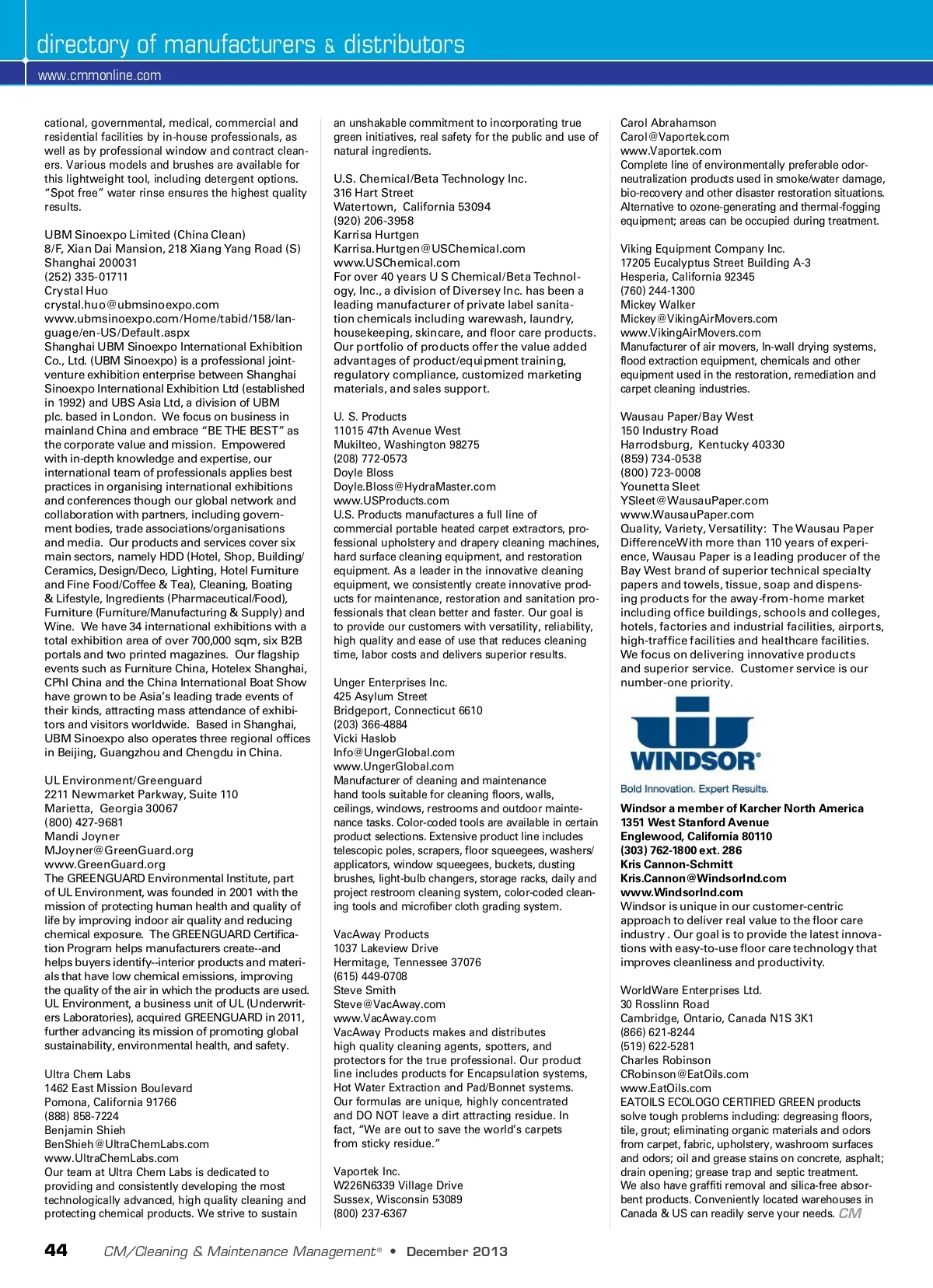 directory of manufacturers www.cmmonline.com cational, governmental, medical, commercial and residential facilities by in-house professionals, as well as by professional window and contract clean-ers. Various models and brushes are available for this lightweight tool, including detergent options. “Spot free” water rinse ensures the highest quality results. UBM Sinoexpo Limited (China Clean) 8/F, Xian Dai Mansion, 218 Xiang Yang Road (S) Shanghai 200031 (252) 335 -01711 Crystal Huo [email protected] www.ubmsinoexpo.com/Home/tabid/158/lan-guage/en-US/Default.aspx Shanghai UBM Sinoexpo International Exhibition Co., Ltd. (UBM Sinoexpo) is a professional joint-venture exhibition enterprise between Shanghai Sinoexpo International Exhibition Ltd (established in 1992) and UBS Asia Ltd, a division of UBM plc. based in London. We focus on business in mainland China and embrace “BE THE BEST” as the corporate value and mission. Empowered with in-depth knowledge and expertise, our international team of professionals applies best practices in organising international exhibitions and conferences though our global network and collaboration with partners, including govern-ment bodies, trade associations/organisations and media. Our products and services cover six main sectors, namely HDD (Hotel, Shop, Building/ Ceramics, Design/Deco, Lighting, Hotel Furniture and Fine Food/Coffee & Tea), Cleaning, Boating & Lifestyle, Ingredients (Pharmaceutical/Food), Furniture (Furniture/Manufacturing & Supply) and Wine. We have 34 international exhibitions with a total exhibition area of over 700,000 sqm, six B2B portals and two printed magazines. Our flagship events such as Furniture China, Hotelex Shanghai, CPhI China and the China International Boat Show have grown to be Asia’s leading trade events of their kinds, attracting mass attendance of exhibi-tors and visitors worldwide. Based in Shanghai, UBM Sinoexpo also operates three regional offices in Beijing, Guangzhou and Chengdu in China. UL Environment/Greenguard 2211 Newmarket Parkway, Suite 110 Marietta, Georgia 30067 (800) 427-9681 Mandi Joyner [email protected] www.GreenGuard.org The GREENGUARD Environmental Institute, part of UL Environment, was founded in 2001 with the mission of protecting human health and quality of life by improving indoor air quality and reducing chemical exposure. The GREENGUARD Certifica-tion Program helps manufacturers create--and helps buyers identify--interior products and materi-als that have low chemical emissions, improving the quality of the air in which the products are used. UL Environment, a business unit of UL (Underwrit-ers Laboratories), acquired GREENGUARD in 2011, further advancing its mission of promoting global sustainability, environmental health, and safety. Ultra Chem Labs 1462 East Mission Boulevard Pomona, California 91766 (888) 858-7224 Benjamin Shieh [email protected] www.UltraChemLabs.com Our team at Ultra Chem Labs is dedicated to providing and consistently developing the most technologically advanced, high quality cleaning and protecting chemical products. We strive to sustain & distributors Carol Abrahamson [email protected] www.Vaportek.com Complete line of environmentally preferable odor-neutralization products used in smoke/water damage, bio-recovery and other disaster restoration situations. Alternative to ozone-generating and thermal-fogging equipment; areas can be occupied during treatment. Viking Equipment Company Inc. 17205 Eucalyptus Street Building A-3 Hesperia, California 92345 (760) 244-1300 Mickey Walker [email protected] www.VikingAirMovers.com Manufacturer of air movers, In-wall drying systems, flood extraction equipment, chemicals and other equipment used in the restoration, remediation and carpet cleaning industries. Wausau Paper/Bay West 150 Industry Road Harrodsburg, Kentucky 40330 (859) 734-0538 (800) 723-0008 Younetta Sleet [email protected] www.WausauPaper.com Quality, Variety, Versatility: The Wausau Paper DifferenceWith more than 110 years of experi-ence, Wausau Paper is a leading producer of the Bay West brand of superior technical specialty papers and towels, tissue, soap and dispens-ing products for the away-from-home market including office buildings, schools and colleges, hotels, factories and industrial facilities, airports, high-traffice facilities and healthcare facilities. We focus on delivering innovative products and superior service. Customer service is our number-one priority. an unshakable commitment to incorporating true green initiatives, real safety for the public and use of natural ingredients. U.S. Chemical/Beta Technology Inc. 316 Hart Street Watertown, California 53094 (920) 206-3958 Karrisa Hurtgen [email protected] www.USChemical.com For over 40 years U S Chemical/Beta Technol-ogy, Inc., a division of Diversey Inc. has been a leading manufacturer of private label sanita-tion chemicals including warewash, laundry, housekeeping, skincare, and floor care products. Our portfolio of products offer the value added advantages of product/equipment training, regulatory compliance, customized marketing materials, and sales support. U. S. Products 11015 47th Avenue West Mukilteo, Washington 98275 (208) 772-0573 Doyle Bloss [email protected] www.USProducts.com U.S. Products manufactures a full line of commercial portable heated carpet extractors, pro-fessional upholstery and drapery cleaning machines, hard surface cleaning equipment, and restoration equipment. As a leader in the innovative cleaning equipment, we consistently create innovative prod-ucts for maintenance, restoration and sanitation pro-fessionals that clean better and faster. Our goal is to provide our customers with versatility, reliability, high quality and ease of use that reduces cleaning time, labor costs and delivers superior results. Unger Enterprises Inc. 425 Asylum Street Bridgeport, Connecticut 6610 (203) 366-4884 Vicki Haslob [email protected] www.UngerGlobal.com Manufacturer of cleaning 