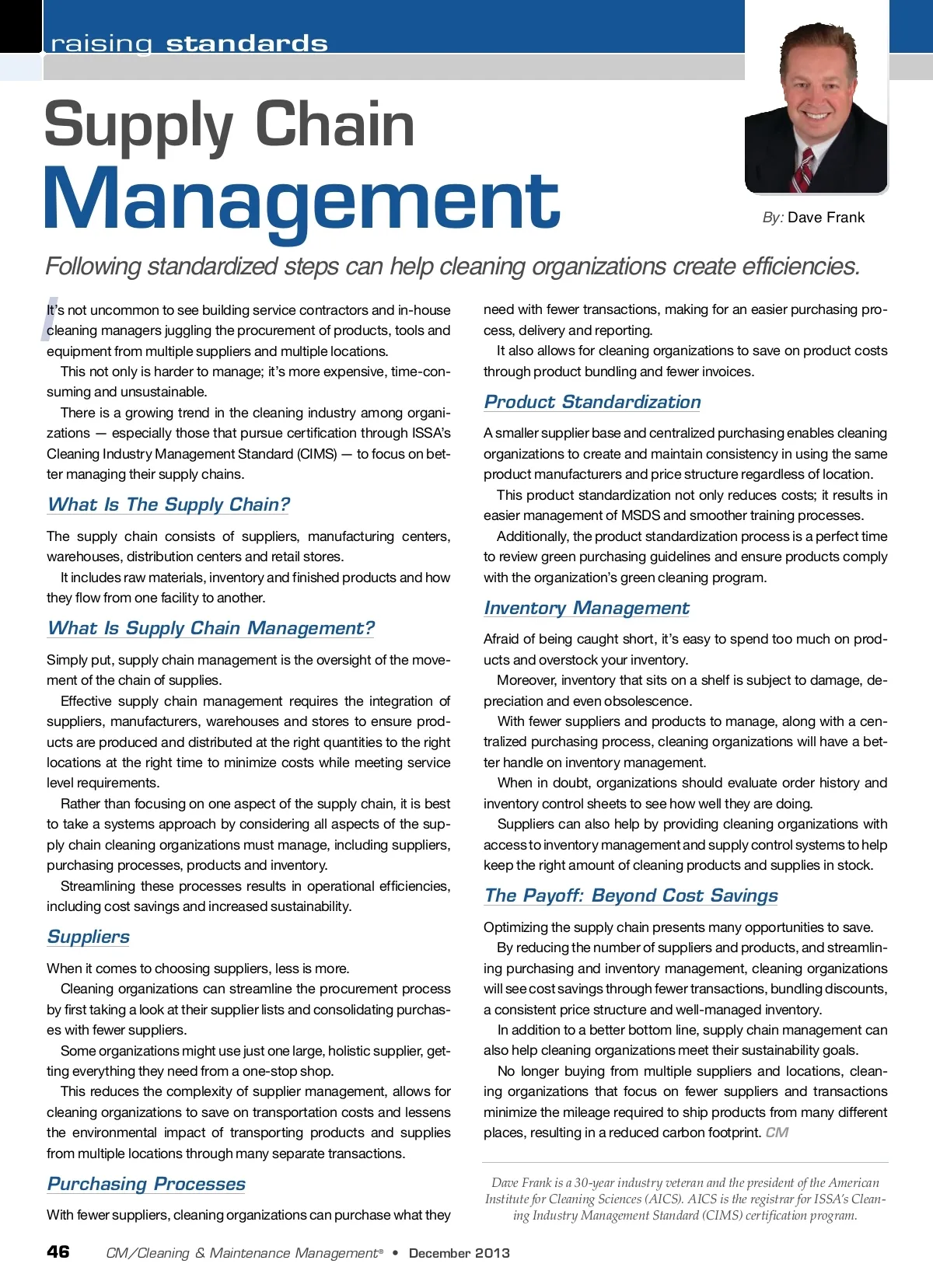 raising standards Supply Chain Management I It’s not uncommon to see building service contractors and in-house cleaning managers juggling the procurement of products, tools and equipment from multiple suppliers and multiple locations. This not only is harder to manage; it’s more expensive, time-con-suming and unsustainable. There is a growing trend in the cleaning industry among organi-zations — especially those that pursue certification through ISSA’s Cleaning Industry Management Standard (CIMS) — to focus on bet-ter managing their supply chains. By: Dave Frank Following standardized steps can help cleaning organizations create efficiencies. need with fewer transactions, making for an easier purchasing pro-cess, delivery and reporting. It also allows for cleaning organizations to save on product costs through product bundling and fewer invoices. Product Standardization A smaller supplier base and centralized purchasing enables cleaning organizations to create and maintain consistency in using the same product manufacturers and price structure regardless of location. This product standardization not only reduces costs; it results in easier management of MSDS and smoother training processes. Additionally, the product standardization process is a perfect time to review green purchasing guidelines and ensure products comply with the organization’s green cleaning program. What Is The Supply Chain? The supply chain consists of suppliers, manufacturing centers, warehouses, distribution centers and retail stores. It includes raw materials, inventory and finished products and how they flow from one facility to another. Inventory Management Afraid of being caught short, it’s easy to spend too much on prod-ucts and overstock your inventory. Moreover, inventory that sits on a shelf is subject to damage, de-preciation and even obsolescence. With fewer suppliers and products to manage, along with a cen-tralized purchasing process, cleaning organizations will have a bet-ter handle on inventory management. When in doubt, organizations should evaluate order history and inventory control sheets to see how well they are doing. Suppliers can also help by providing cleaning organizations with access to inventory management and supply control systems to help keep the right amount of cleaning products and supplies in stock. What Is Supply Chain Management? Simply put, supply chain management is the oversight of the move-ment of the chain of supplies. Effective supply chain management requires the integration of suppliers, manufacturers, warehouses and stores to ensure prod-ucts are produced and distributed at the right quantities to the right locations at the right time to minimize costs while meeting service level requirements. Rather than focusing on one aspect of the supply chain, it is best to take a systems approach by considering all aspects of the sup-ply chain cleaning organizations must manage, including suppliers, purchasing processes, products and inventory. Streamlining these processes results in operational efficiencies, including cost savings and increased sustainability. The Payoff: Beyond Cost Savings Optimizing the supply chain presents many opportunities to save. By reducing the number of suppliers and products, and streamlin-ing purchasing and inventory management, cleaning organizations will see cost savings through fewer transactions, bundling discounts, a consistent price structure and well-managed inventory. In addition to a better bottom line, supply chain management can also help cleaning organizations meet their sustainability goals. No longer buying from multiple suppliers and locations, clean-ing organizations that focus on fewer suppliers and transactions minimize the mileage required to ship products from many different places, resulting in a reduced carbon footprint. CM Suppliers When it comes to choosing suppliers, less is more. Cleaning organizations can streamline the procurement process by first taking a look at their supplier lists and consolidating purchas-es with fewer suppliers. Some organizations might use just one large, holistic supplier, get-ting everything they need from a one-stop shop. This reduces the complexity of supplier management, allows for cleaning organizations to save on transportation costs and lessens the environmental impact of transporting products and supplies from multiple locations through many separate transactions. Purchasing Processes With fewer suppliers, cleaning organizations can purchase what they Dave Frank is a 30-year industry veteran and the president of the American Institute for Cleaning Sciences (AICS). AICS is the registrar for ISSA’s Clean-ing Industry Management Standard (CIMS) certification program. 46 CM/Cleaning & Maintenance Management ® • December 2013