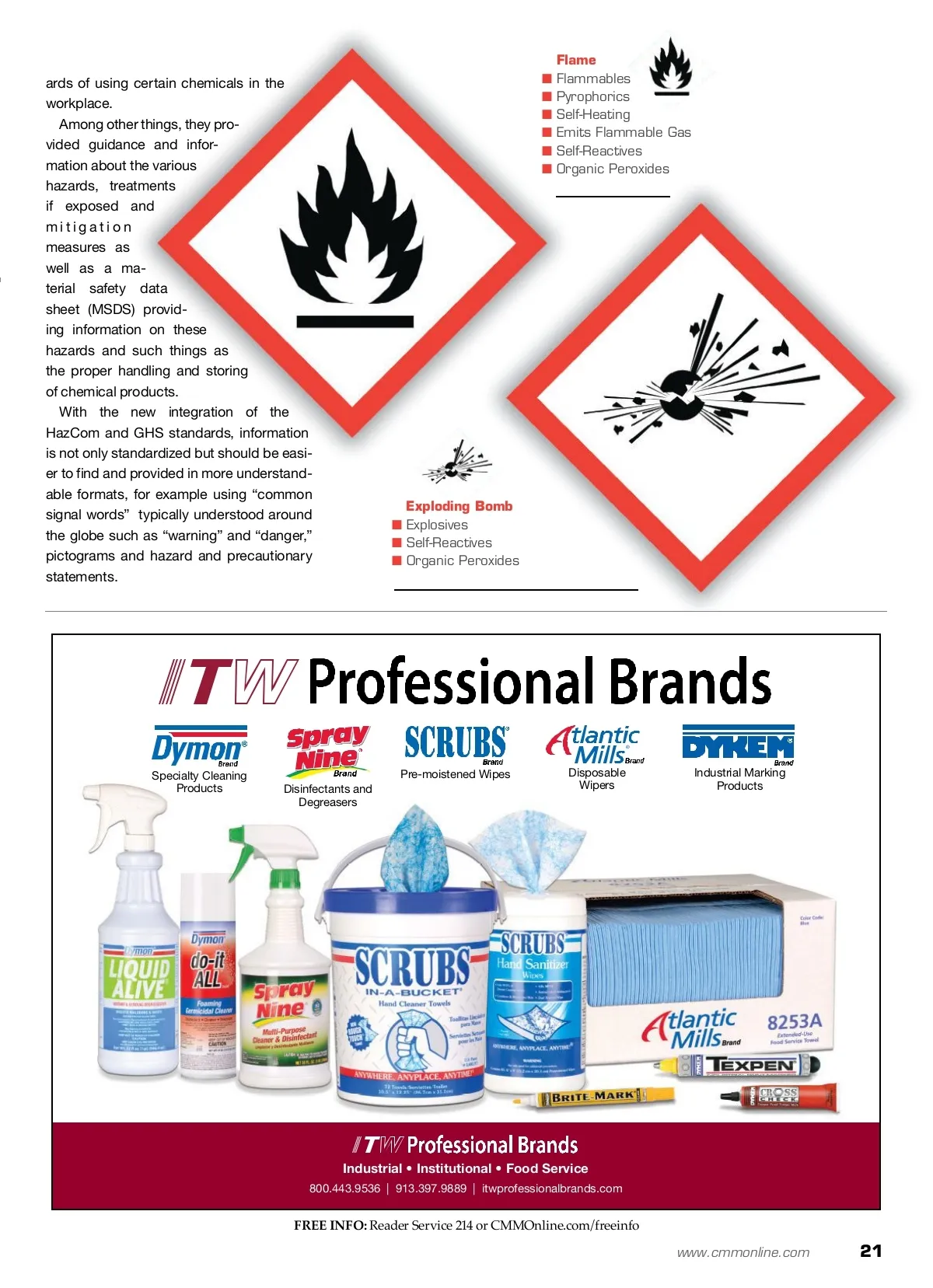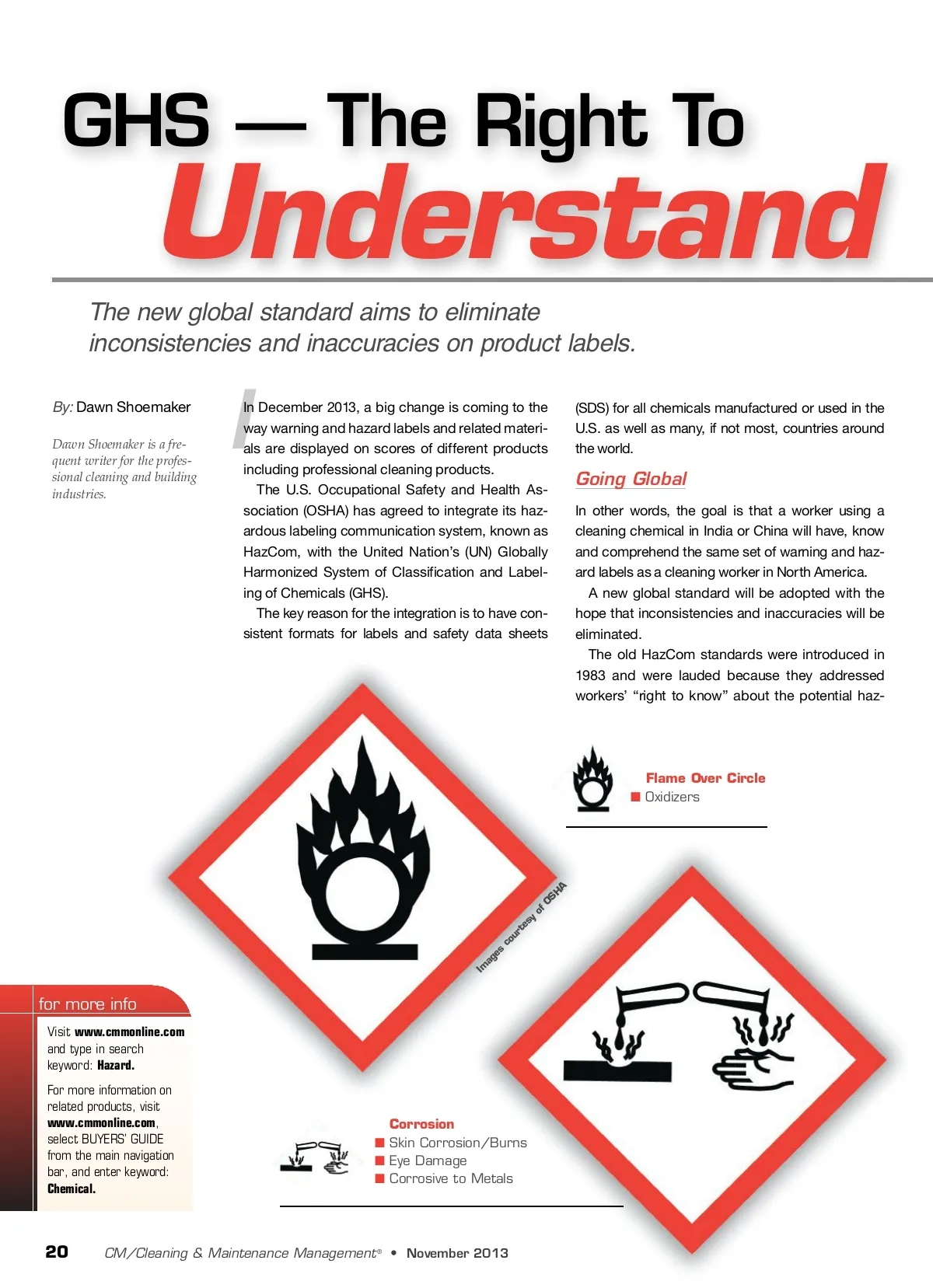 GHS — The Right To Understand The new global standard aims to eliminate inconsistencies and inaccuracies on product labels. By: Dawn Shoemaker Dawn Shoemaker is a fre-quent writer for the profes-sional cleaning and building industries. I In December 2013, a big change is coming to the way warning and hazard labels and related materi-als are displayed on scores of different products including professional cleaning products. The U.S. Occupational Safety and Health As-sociation (OSHA) has agreed to integrate its haz-ardous labeling communication system, known as HazCom, with the United Nation’s (UN) Globally Harmonized System of Classification and Label-ing of Chemicals (GHS). The key reason for the integration is to have con-sistent formats for labels and safety data sheets (SDS) for all chemicals manufactured or used in the U.S. as well as many, if not most, countries around the world. Going Global In other words, the goal is that a worker using a cleaning chemical in India or China will have, know and comprehend the same set of warning and haz-ard labels as a cleaning worker in North America. A new global standard will be adopted with the hope that inconsistencies and inaccuracies will be eliminated. The old HazCom standards were introduced in 1983 and were lauded because they addressed workers’ “right to know” about the potential haz-Flame Over Circle ■ Oxidizers for more info Visit www.cmmonline.com and type in search keyword: Hazard. For more information on related products, visit www.cmmonline.com , select BUYERS’ GUIDE from the main navigation bar, and enter keyword: Chemical. Corrosion ■ Skin Corrosion/Burns ■ Eye Damage ■ Corrosive to Metals 20 CM/Cleaning & Maintenance Management ® • November 2013 Images courtesy of OSHA