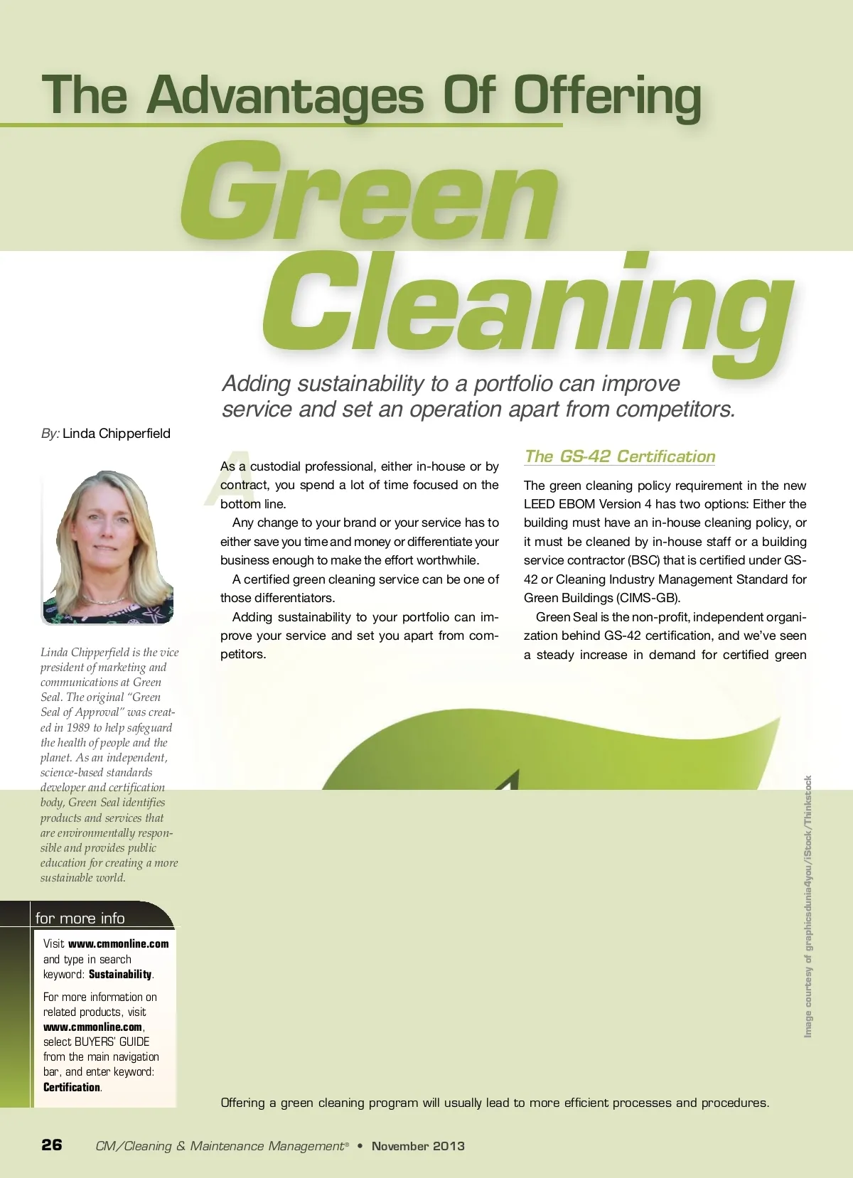 The Advantages Of Offering Green Cleaning Adding sustainability to a portfolio can improve service and set an operation apart from competitors. The GS-42 Certification The green cleaning policy requirement in the new LEED EBOM Version 4 has two options: Either the building must have an in-house cleaning policy, or it must be cleaned by in-house staff or a building service contractor (BSC) that is certified under GS-42 or Cleaning Industry Management Standard for Green Buildings (CIMS-GB). Green Seal is the non-profit, independent organi-zation behind GS-42 certification, and we’ve seen a steady increase in demand for certified green By: Linda Chipperfield A Linda Chipperfield is the vice president of marketing and communications at Green Seal. The original “Green Seal of Approval” was creat-ed in 1989 to help safeguard the health of people and the planet. As an independent, science-based standards developer and certification body, Green Seal identifies products and services that are environmentally respon-sible and provides public education for creating a more sustainable world. As a custodial professional, either in-house or by contract, you spend a lot of time focused on the bottom line. Any change to your brand or your service has to either save you time and money or differentiate your business enough to make the effort worthwhile. A certified green cleaning service can be one of those differentiators. Adding sustainability to your portfolio can im-prove your service and set you apart from com-petitors. for more info Visit www.cmmonline.com and type in search keyword: Sustainability . For more information on related products, visit www.cmmonline.com , select BUYERS’ GUIDE from the main navigation bar, and enter keyword: Certification . Offering a green cleaning program will usually lead to more efficient processes and procedures. 26 CM/Cleaning & Maintenance Management ® • November 2013 Image courtesy of graphicsdunia4you/iStock/Thinkstock