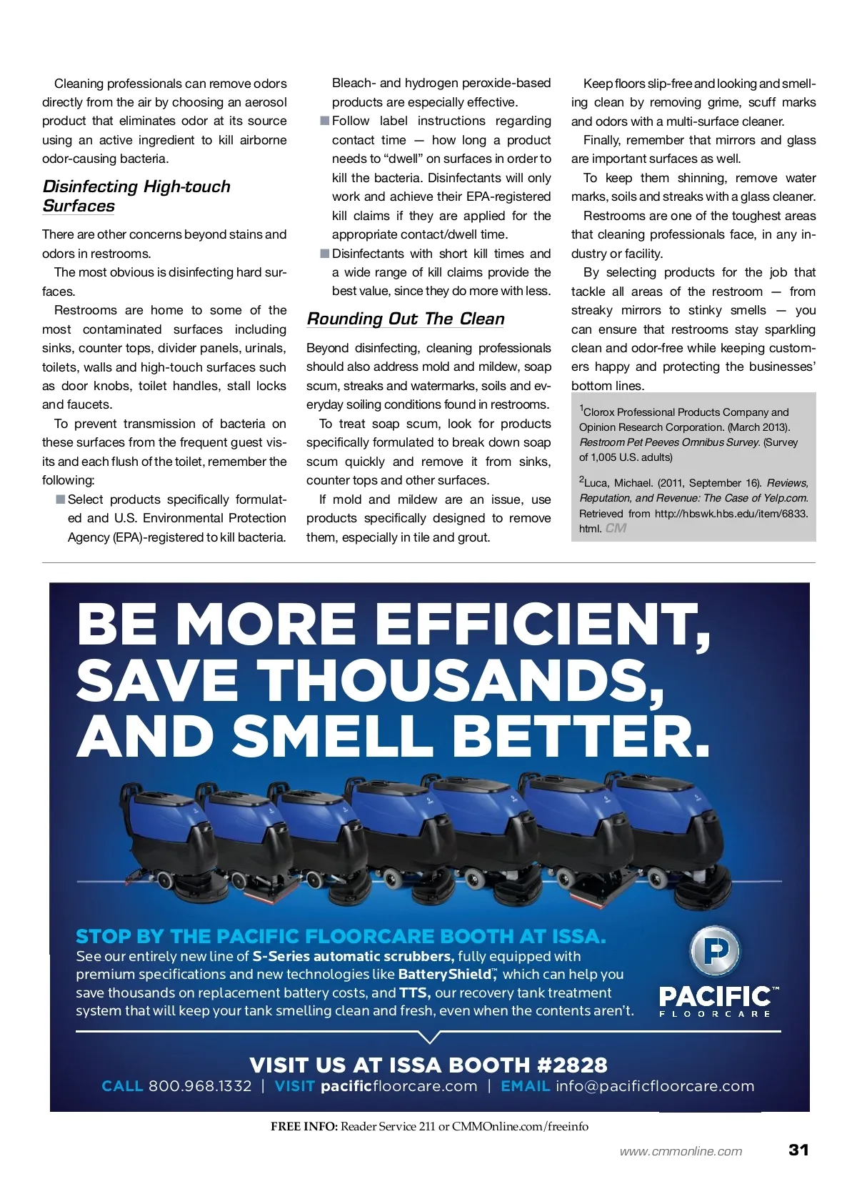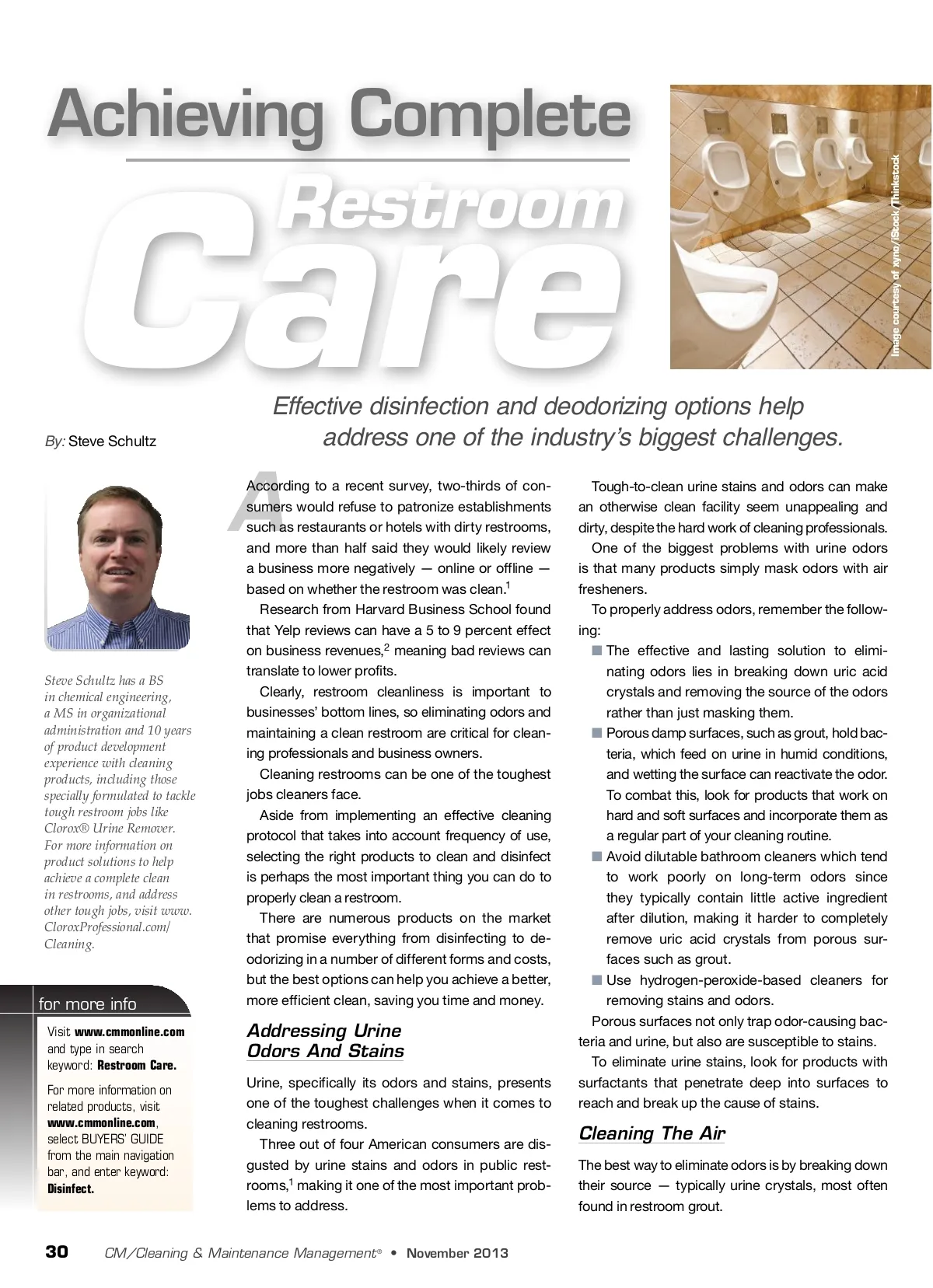Achieving Complete Care By: Steve Schultz Restroom Effective disinfection and deodorizing options help address one of the industry’s biggest challenges. A Steve Schultz has a BS in chemical engineering, a MS in organizational administration and 10 years of product development experience with cleaning products, including those specially formulated to tackle tough restroom jobs like Clorox® Urine Remover. For more information on product solutions to help achieve a complete clean in restrooms, and address other tough jobs, visit www. CloroxProfessional.com/ Cleaning. for more info Visit www.cmmonline.com and type in search keyword: Restroom Care. For more information on related products, visit www.cmmonline.com , select BUYERS’ GUIDE from the main navigation bar, and enter keyword: Disinfect. According to a recent survey, two-thirds of con-sumers would refuse to patronize establishments such as restaurants or hotels with dirty restrooms, and more than half said they would likely review a business more negatively — online or offline — based on whether the restroom was clean. 1 Research from Harvard Business School found that Yelp reviews can have a 5 to 9 percent effect on business revenues, 2 meaning bad reviews can translate to lower profits. Clearly, restroom cleanliness is important to businesses’ bottom lines, so eliminating odors and maintaining a clean restroom are critical for clean-ing professionals and business owners. Cleaning restrooms can be one of the toughest jobs cleaners face. Aside from implementing an effective cleaning protocol that takes into account frequency of use, selecting the right products to clean and disinfect is perhaps the most important thing you can do to properly clean a restroom. There are numerous products on the market that promise everything from disinfecting to de-odorizing in a number of different forms and costs, but the best options can help you achieve a better, more efficient clean, saving you time and money. Addressing Urine Odors And Stains Urine, specifically its odors and stains, presents one of the toughest challenges when it comes to cleaning restrooms. Three out of four American consumers are dis-gusted by urine stains and odors in public rest-rooms, 1 making it one of the most important prob-lems to address. Tough-to-clean urine stains and odors can make an otherwise clean facility seem unappealing and dirty, despite the hard work of cleaning professionals. One of the biggest problems with urine odors is that many products simply mask odors with air fresheners. To properly address odors, remember the follow-ing: ■ The effective and lasting solution to elimi-nating odors lies in breaking down uric acid crystals and removing the source of the odors rather than just masking them. ■ Porous damp surfaces, such as grout, hold bac-teria, which feed on urine in humid conditions, and wetting the surface can reactivate the odor. To combat this, look for products that work on hard and soft surfaces and incorporate them as a regular part of your cleaning routine. ■ Avoid dilutable bathroom cleaners which tend to work poorly on long-term odors since they typically contain little active ingredient after dilution, making it harder to completely remove uric acid crystals from porous sur-faces such as grout. ■ Use hydrogen-peroxide-based cleaners for removing stains and odors. Porous surfaces not only trap odor-causing bac-teria and urine, but also are susceptible to stains. To eliminate urine stains, look for products with surfactants that penetrate deep into surfaces to reach and break up the cause of stains. Cleaning The Air The best way to eliminate odors is by breaking down their source — typically urine crystals, most often found in restroom grout. 30 CM/Cleaning & Maintenance Management ® • November 2013 Image courtesy of xyno/iStock/Thinkstock