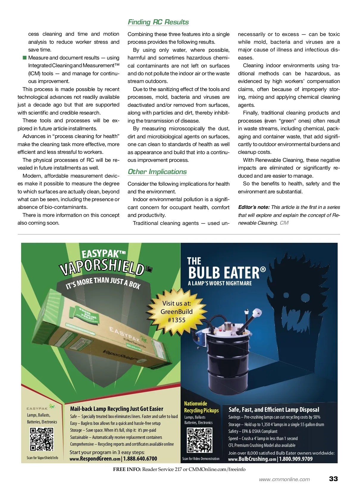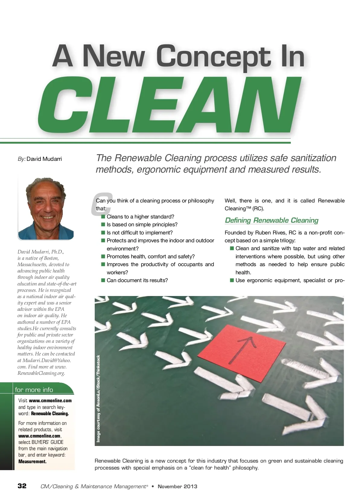 A New Concept In CLEAN By: David Mudarri The Renewable Cleaning process utilizes safe sanitization methods, ergonomic equipment and measured results. C David Mudarri, Ph.D., is a native of Boston, Massachusetts, devoted to advancing public health through indoor air quality education and state-of-the-art processes. He is recognized as a national indoor air qual-ity expert and was a senior advisor within the EPA on indoor air quality. He authored a number of EPA studies.He currently consults for public and private sector organizations on a variety of healthy indoor environment matters. He can be contacted at Mudarri.David@Yahoo. com. Find more at www. RenewableCleaning.org. Can you think of a cleaning process or philosophy that: ■ Cleans to a higher standard? ■ Is based on simple principles? ■ Is not difficult to implement? ■ Protects and improves the indoor and outdoor environment? ■ Promotes health, comfort and safety? ■ Improves the productivity of occupants and workers? ■ Can document its results? Well, there is one, and it is called Renewable Cleaning™ (RC). Defining Renewable Cleaning Founded by Ruben Rives, RC is a non-profit con-cept based on a simple trilogy: ■ Clean and sanitize with tap water and related interventions where possible, but using other methods as needed to help ensure public health. ■ Use ergonomic equipment, specialist or pro-for more info Visit www.cmmonline.com and type in search key-word: Renewable Cleaning. For more information on related products, visit www.cmmonline.com , select BUYERS’ GUIDE from the main navigation bar, and enter keyword: Measurement. Renewable Cleaning is a new concept for this industry that focuses on green and sustainable cleaning processes with special emphasis on a “clean for health” philosophy. 32 CM/Cleaning & Maintenance Management ® • November 2013 Image courtesy of AnsonLu/iStock/Thinkstock