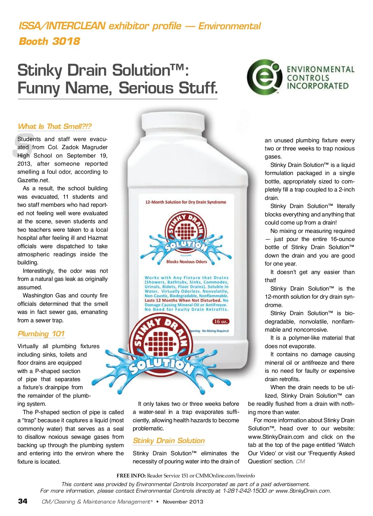 ISSA/INTERCLEAN exhibitor profile — Environmental Booth 3018 Stinky Drain Solution™: Funny Name, Serious Stuff. What Is That Smell?!? S Students and staff were evacu-ated from Col. Zadok Magruder High School on September 19, 2013, after someone reported smelling a foul odor, according to Gazette.net. As a result, the school building was evacuated, 11 students and two staff members who had report-ed not feeling well were evaluated at the scene, seven students and two teachers were taken to a local hospital after feeling ill and Hazmat officials were dispatched to take atmospheric readings inside the building. Interestingly, the odor was not from a natural gas leak as originally assumed. Washington Gas and county fire officials determined that the smell was in fact sewer gas, emanating from a sewer trap. Plumbing 101 Virtually all plumbing fixtures including sinks, toilets and floor drains are equipped with a P-shaped section of pipe that separates a fixture’s drainpipe from the remainder of the plumb-ing system. The P-shaped section of pipe is called a “trap” because it captures a liquid (most commonly water) that serves as a seal to disallow noxious sewage gases from backing up through the plumbing system and entering into the environ where the fixture is located. It only takes two or three weeks before a water-seal in a trap evaporates suffi-ciently, allowing health hazards to become problematic. Stinky Drain Solution Stinky Drain Solution™ eliminates the necessity of pouring water into the drain of an unused plumbing fixture every two or three weeks to trap noxious gases. Stinky Drain Solution™ is a liquid formulation packaged in a single bottle, appropriately sized to com-pletely fill a trap coupled to a 2-inch drain. Stinky Drain Solution™ literally blocks everything and anything that could come up from a drain! No mixing or measuring required — just pour the entire 16-ounce bottle of Stinky Drain Solution™ down the drain and you are good for one year. It doesn’t get any easier than that! Stinky Drain Solution™ is the 12-month solution for dry drain syn-drome. Stinky Drain Solution™ is bio-degradable, nonvolatile, nonflam-mable and noncorrosive. It is a polymer-like material that does not evaporate. It contains no damage causing mineral oil or antifreeze and there is no need for faulty or expensive drain retrofits. When the drain needs to be uti-lized, Stinky Drain Solution™ can be readily flushed from a drain with noth-ing more than water. For more information about Stinky Drain Solution™, head over to our website: www.StinkyDrain.com and click on the tab at the top of the page entitled ‘Watch Our Video’ or visit our ‘Frequently Asked Question’ section. CM FREE INFO: Reader Service 151 or CMMOnline.com/freeinfo This content was provided by Environmental Controls Incorporated as part of a paid advertisement. For more information, please contact Environmental Controls directly at 1-281-242-1500 or www.StinkyDrain.com. 34 CM/Cleaning & Maintenance Management ® • November 2013