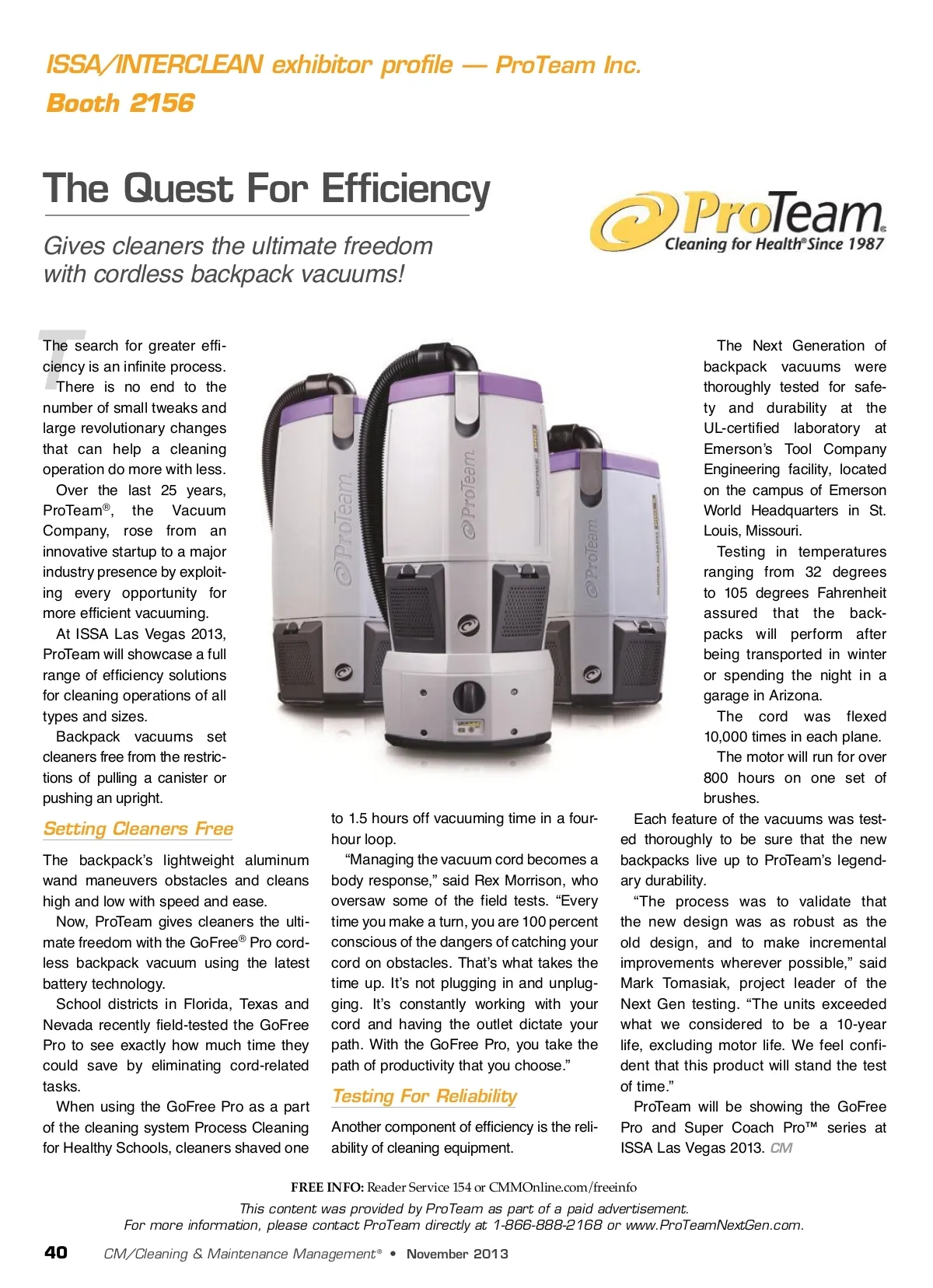 ISSA/INTERCLEAN exhibitor profile — ProTeam Inc. Booth 2156 The Quest For Efficiency Gives cleaners the ultimate freedom with cordless backpack vacuums! T The search for greater effi-ciency is an infinite process. There is no end to the number of small tweaks and large revolutionary changes that can help a cleaning operation do more with less. Over the last 25 years, ProTeam ® , the Vacuum Company, rose from an innovative startup to a major industry presence by exploit-ing every opportunity for more efficient vacuuming. At ISSA Las Vegas 2013, ProTeam will showcase a full range of efficiency solutions for cleaning operations of all types and sizes. Backpack vacuums set cleaners free from the restric-tions of pulling a canister or pushing an upright. Setting Cleaners Free The backpack’s lightweight aluminum wand maneuvers obstacles and cleans high and low with speed and ease. Now, ProTeam gives cleaners the ulti-mate freedom with the GoFree ® Pro cord-less backpack vacuum using the latest battery technology. School districts in Florida, Texas and Nevada recently field-tested the GoFree Pro to see exactly how much time they could save by eliminating cord-related tasks. When using the GoFree Pro as a part of the cleaning system Process Cleaning for Healthy Schools, cleaners shaved one to 1.5 hours off vacuuming time in a four-hour loop. “Managing the vacuum cord becomes a body response,” said Rex Morrison, who oversaw some of the field tests. “Every time you make a turn, you are 100 percent conscious of the dangers of catching your cord on obstacles. That’s what takes the time up. It’s not plugging in and unplug -ging. It’s constantly working with your cord and having the outlet dictate your path. With the GoFree Pro, you take the path of productivity that you choose.” Testing For Reliability Another component of efficiency is the reli-ability of cleaning equipment. The Next Generation of backpack vacuums were thoroughly tested for safe-ty and durability at the UL-certified laboratory at Emerson’s Tool Company Engineering facility, located on the campus of Emerson World Headquarters in St. Louis, Missouri. Testing in temperatures ranging from 32 degrees to 105 degrees Fahrenheit assured that the back-packs will perform after being transported in winter or spending the night in a garage in Arizona. The cord was flexed 10,000 times in each plane. The motor will run for over 800 hours on one set of brushes. Each feature of the vacuums was test-ed thoroughly to be sure that the new backpacks live up to ProTeam’s legend -ary durability. “The process was to validate that the new design was as robust as the old design, and to make incremental improvements wherever possible,” said Mark Tomasiak, project leader of the Next Gen testing. “The units exceeded what we considered to be a 10-year life, excluding motor life. We feel confi-dent that this product will stand the test of time.” ProTeam will be showing the GoFree Pro and Super Coach Pro™ series at ISSA Las Vegas 2013. CM FREE INFO: Reader Service 154 or CMMOnline.com/freeinfo This content was provided by ProTeam as part of a paid advertisement. For more information, please contact ProTeam directly at 1-866-888-2168 or www.ProTeamNextGen.com. 40 CM/Cleaning & Maintenance Management ® • November 2013