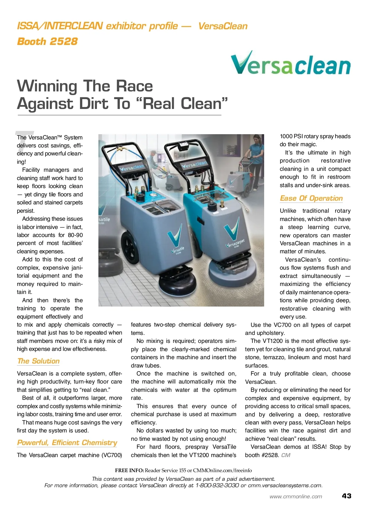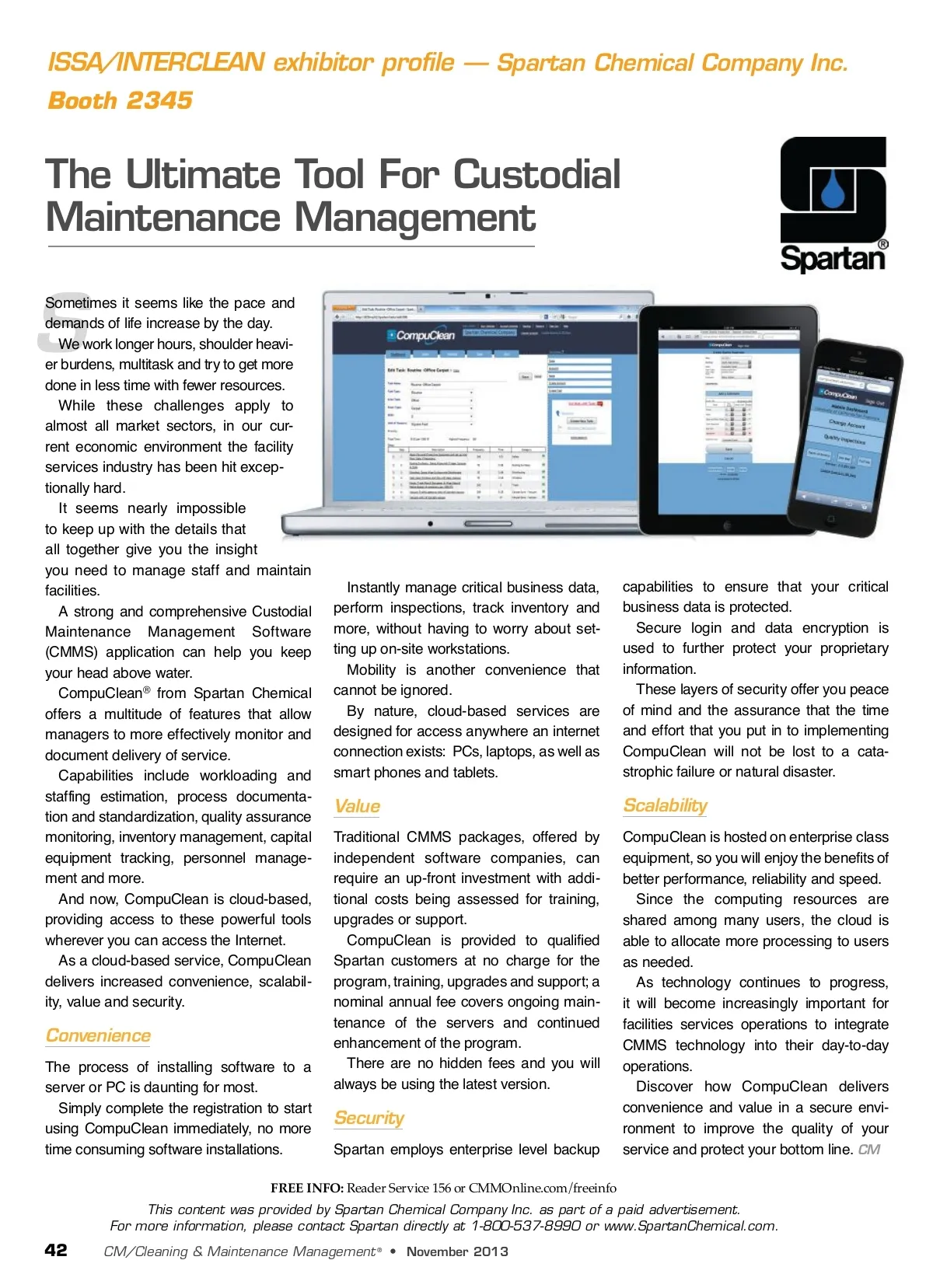 ISSA/INTERCLEAN exhibitor profile — Spartan Chemical Company Inc. Booth 2345 The Ultimate Tool For Custodial Maintenance Management S Sometimes it seems like the pace and demands of life increase by the day. We work longer hours, shoulder heavi-er burdens, multitask and try to get more done in less time with fewer resources. While these challenges apply to almost all market sectors, in our cur-rent economic environment the facility services industry has been hit excep-tionally hard. It seems nearly impossible to keep up with the details that all together give you the insight you need to manage staff and maintain facilities. A strong and comprehensive Custodial Maintenance Management Software (CMMS) application can help you keep your head above water. CompuClean ® from Spartan Chemical offers a multitude of features that allow managers to more effectively monitor and document delivery of service. Capabilities include workloading and staffing estimation, process documenta-tion and standardization, quality assurance monitoring, inventory management, capital equipment tracking, personnel manage-ment and more. And now, CompuClean is cloud-based, providing access to these powerful tools wherever you can access the Internet. As a cloud-based service, CompuClean delivers increased convenience, scalabil-ity, value and security. Instantly manage critical business data, perform inspections, track inventory and more, without having to worry about set-ting up on-site workstations. Mobility is another convenience that cannot be ignored. By nature, cloud-based services are designed for access anywhere an internet connection exists: PCs, laptops, as well as smart phones and tablets. capabilities to ensure that your critical business data is protected. Secure login and data encryption is used to further protect your proprietary information. These layers of security offer you peace of mind and the assurance that the time and effort that you put in to implementing CompuClean will not be lost to a cata-strophic failure or natural disaster. Value Traditional CMMS packages, offered by independent software companies, can require an up-front investment with addi-tional costs being assessed for training, upgrades or support. CompuClean is provided to qualified Spartan customers at no charge for the program, training, upgrades and support; a nominal annual fee covers ongoing main-tenance of the servers and continued enhancement of the program. There are no hidden fees and you will always be using the latest version. Scalability CompuClean is hosted on enterprise class equipment, so you will enjoy the benefits of better performance, reliability and speed. Since the computing resources are shared among many users, the cloud is able to allocate more processing to users as needed. As technology continues to progress, it will become increasingly important for facilities services operations to integrate CMMS technology into their day-to-day operations. Discover how CompuClean delivers convenience and value in a secure envi-ronment to improve the quality of your service and protect your bottom line. CM Convenience The process of installing software to a server or PC is daunting for most. Simply complete the registration to start using CompuClean immediately, no more time consuming software installations. Security Spartan employs enterprise level backup FREE INFO: Reader Service 156 or CMMOnline.com/freeinfo This content was provided by Spartan Chemical Company Inc. as part of a paid advertisement. For more information, please contact Spartan directly at 1-800-537-8990 or www.SpartanChemical.com. 42 CM/Cleaning & Maintenance Management ® • November 2013