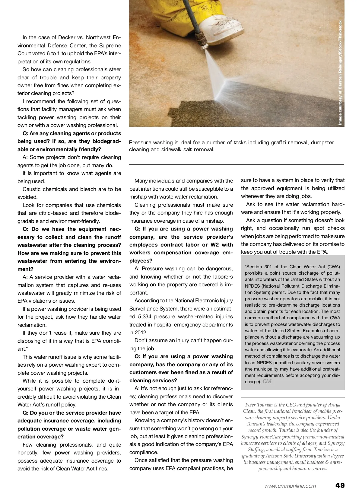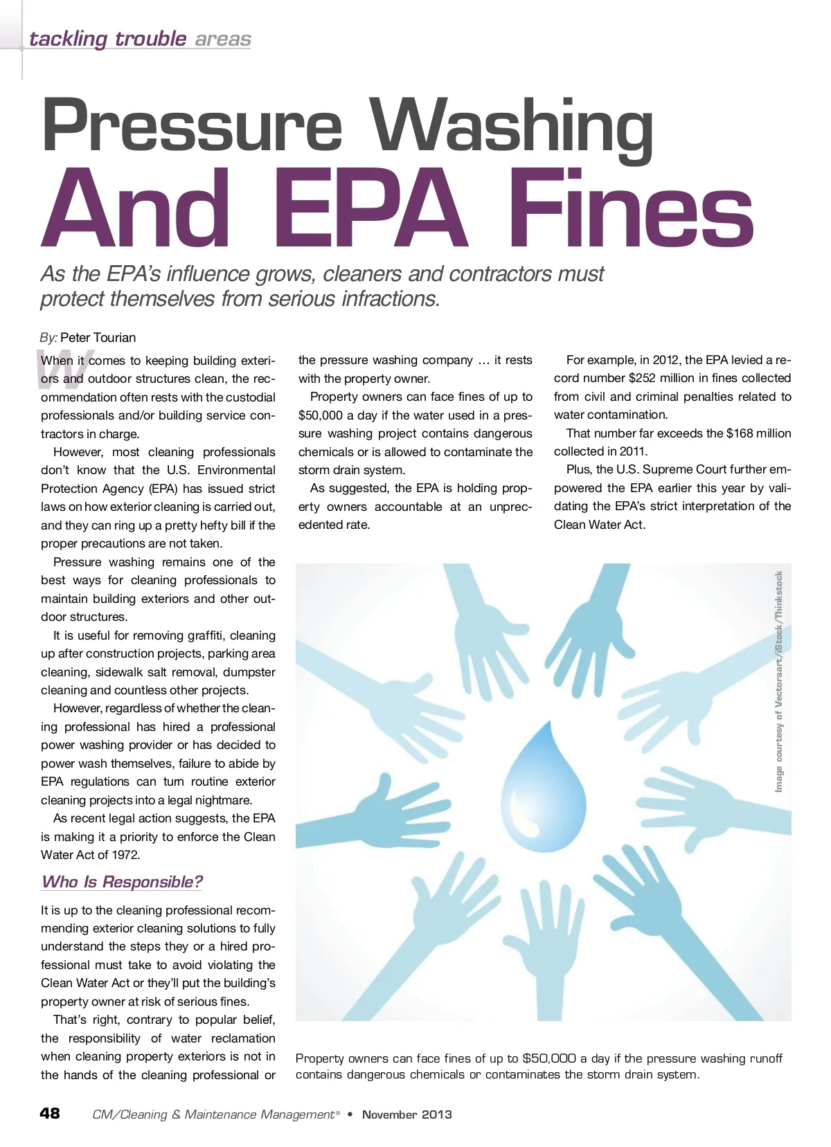 tackling trouble areas Pressure Washing As the EPA’s influence grows, cleaners and contractors must protect themselves from serious infractions. By: Peter Tourian And EPA Fines When it comes to keeping building exteri-ors and outdoor structures clean, the rec-ommendation often rests with the custodial professionals and/or building service con-tractors in charge. However, most cleaning professionals don’t know that the U.S. Environmental Protection Agency (EPA) has issued strict laws on how exterior cleaning is carried out, and they can ring up a pretty hefty bill if the proper precautions are not taken. Pressure washing remains one of the best ways for cleaning professionals to maintain building exteriors and other out-door structures. It is useful for removing graffiti, cleaning up after construction projects, parking area cleaning, sidewalk salt removal, dumpster cleaning and countless other projects. However, regardless of whether the clean-ing professional has hired a professional power washing provider or has decided to power wash themselves, failure to abide by EPA regulations can turn routine exterior cleaning projects into a legal nightmare. As recent legal action suggests, the EPA is making it a priority to enforce the Clean Water Act of 1972. the pressure washing company … it rests with the property owner. Property owners can face fines of up to $50,000 a day if the water used in a pres-sure washing project contains dangerous chemicals or is allowed to contaminate the storm drain system. As suggested, the EPA is holding prop-erty owners accountable at an unprec-edented rate. For example, in 2012, the EPA levied a re-cord number $252 million in fines collected from civil and criminal penalties related to water contamination. That number far exceeds the $168 million collected in 2011. Plus, the U.S. Supreme Court further em-powered the EPA earlier this year by vali-dating the EPA’s strict interpretation of the Clean Water Act. W Who Is Responsible? It is up to the cleaning professional recom-mending exterior cleaning solutions to fully understand the steps they or a hired pro-fessional must take to avoid violating the Clean Water Act or they’ll put the building’s property owner at risk of serious fines. That’s right, contrary to popular belief, the responsibility of water reclamation when cleaning property exteriors is not in the hands of the cleaning professional or Property owners can face fines of up to $50,000 a day if the pressure washing runoff contains dangerous chemicals or contaminates the storm drain system. 48 CM/Cleaning & Maintenance Management ® • November 2013 Image courtesy of Vectoraart/iStock/Thinkstock