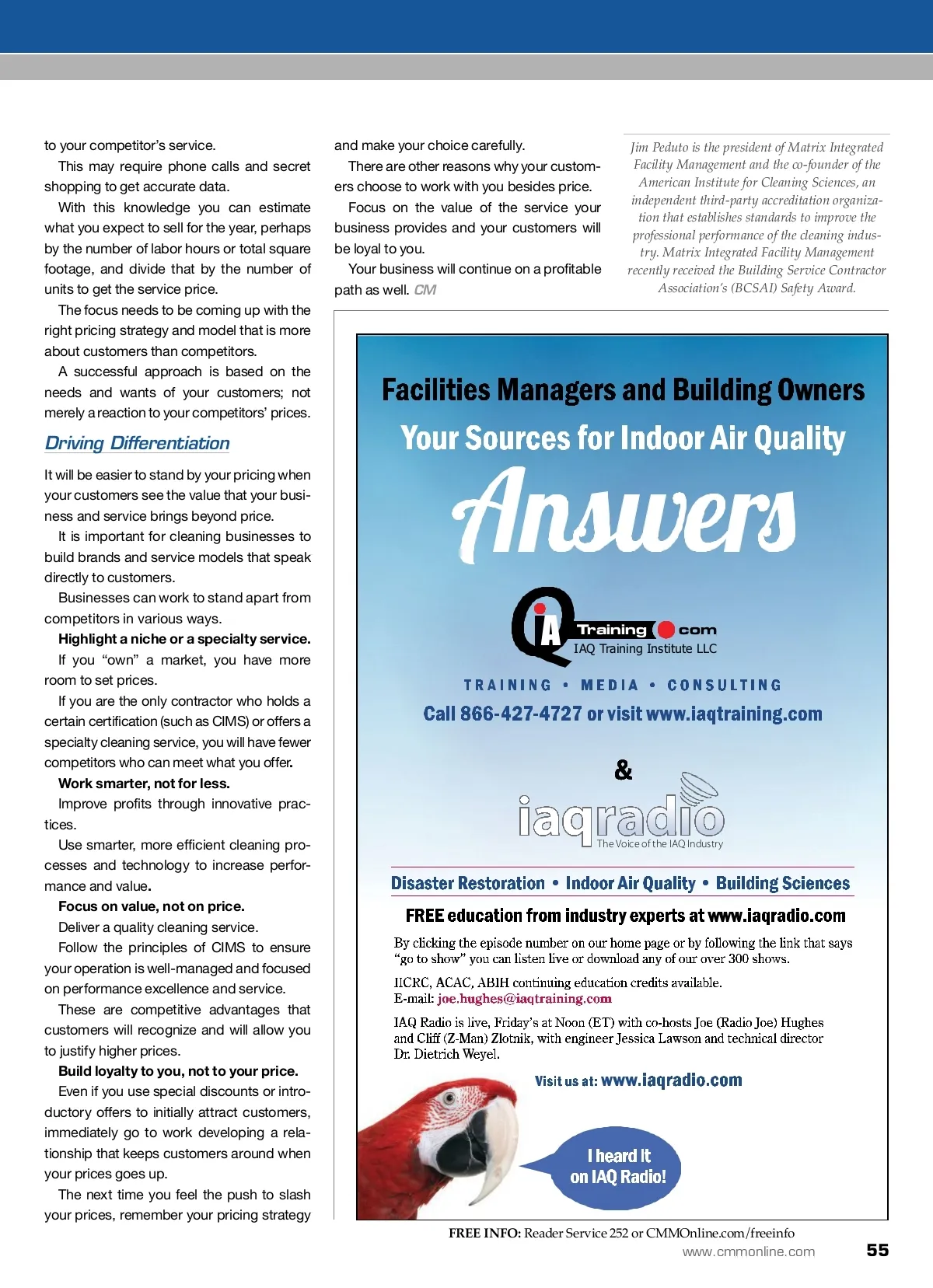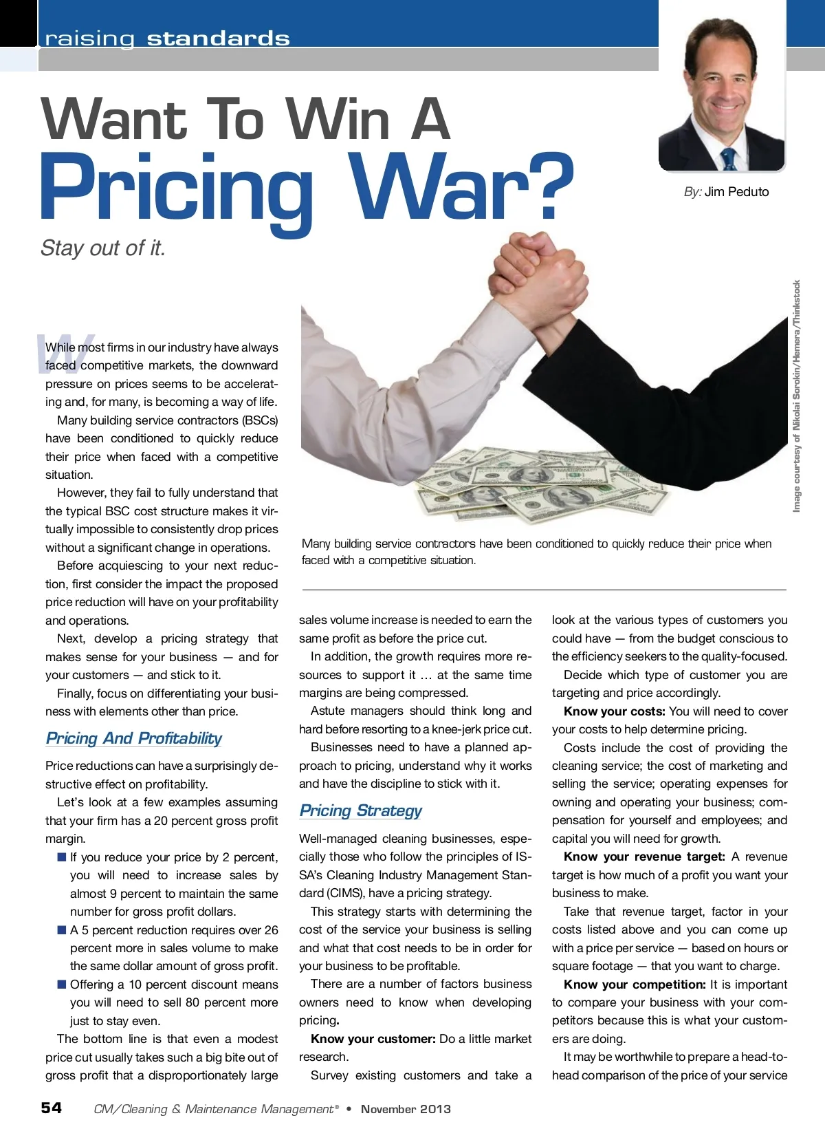 raising standards Pricing War? Stay out of it. Want To Win A By: Jim Peduto W While most firms in our industry have always faced competitive markets, the downward pressure on prices seems to be accelerat-ing and, for many, is becoming a way of life. Many building service contractors (BSCs) have been conditioned to quickly reduce their price when faced with a competitive situation. However, they fail to fully understand that the typical BSC cost structure makes it vir-tually impossible to consistently drop prices without a significant change in operations. Before acquiescing to your next reduc-tion, first consider the impact the proposed price reduction will have on your profitability and operations. Next, develop a pricing strategy that makes sense for your business — and for your customers — and stick to it. Finally, focus on differentiating your busi-ness with elements other than price. Many building service contractors have been conditioned to quickly reduce their price when faced with a competitive situation. Pricing And Profitability Price reductions can have a surprisingly de-structive effect on profitability. Let’s look at a few examples assuming that your firm has a 20 percent gross profit margin. ■ If you reduce your price by 2 percent, you will need to increase sales by almost 9 percent to maintain the same number for gross profit dollars. ■ A 5 percent reduction requires over 26 percent more in sales volume to make the same dollar amount of gross profit. ■ Offering a 10 percent discount means you will need to sell 80 percent more just to stay even. The bottom line is that even a modest price cut usually takes such a big bite out of gross profit that a disproportionately large sales volume increase is needed to earn the same profit as before the price cut. In addition, the growth requires more re-sources to support it … at the same time margins are being compressed. Astute managers should think long and hard before resorting to a knee-jerk price cut. Businesses need to have a planned ap-proach to pricing, understand why it works and have the discipline to stick with it. Pricing Strategy Well-managed cleaning businesses, espe-cially those who follow the principles of IS-SA’s Cleaning Industry Management Stan-dard (CIMS), have a pricing strategy. This strategy starts with determining the cost of the service your business is selling and what that cost needs to be in order for your business to be profitable. There are a number of factors business owners need to know when developing pricing . Know your customer: Do a little market research. Survey existing customers and take a look at the various types of customers you could have — from the budget conscious to the efficiency seekers to the quality-focused. Decide which type of customer you are targeting and price accordingly. Know your costs: You will need to cover your costs to help determine pricing. Costs include the cost of providing the cleaning service; the cost of marketing and selling the service; operating expenses for owning and operating your business; com-pensation for yourself and employees; and capital you will need for growth. Know your revenue target: A revenue target is how much of a profit you want your business to make. Take that revenue target, factor in your costs listed above and you can come up with a price per service — based on hours or square footage — that you want to charge. Know your competition: It is important to compare your business with your com-petitors because this is what your custom-ers are doing. It may be worthwhile to prepare a head-to-head comparison of the price of your service 54 CM/Cleaning & Maintenance Management ® • November 2013 Image courtesy of Nikolai Sorokin/Hemera/Thinkstock