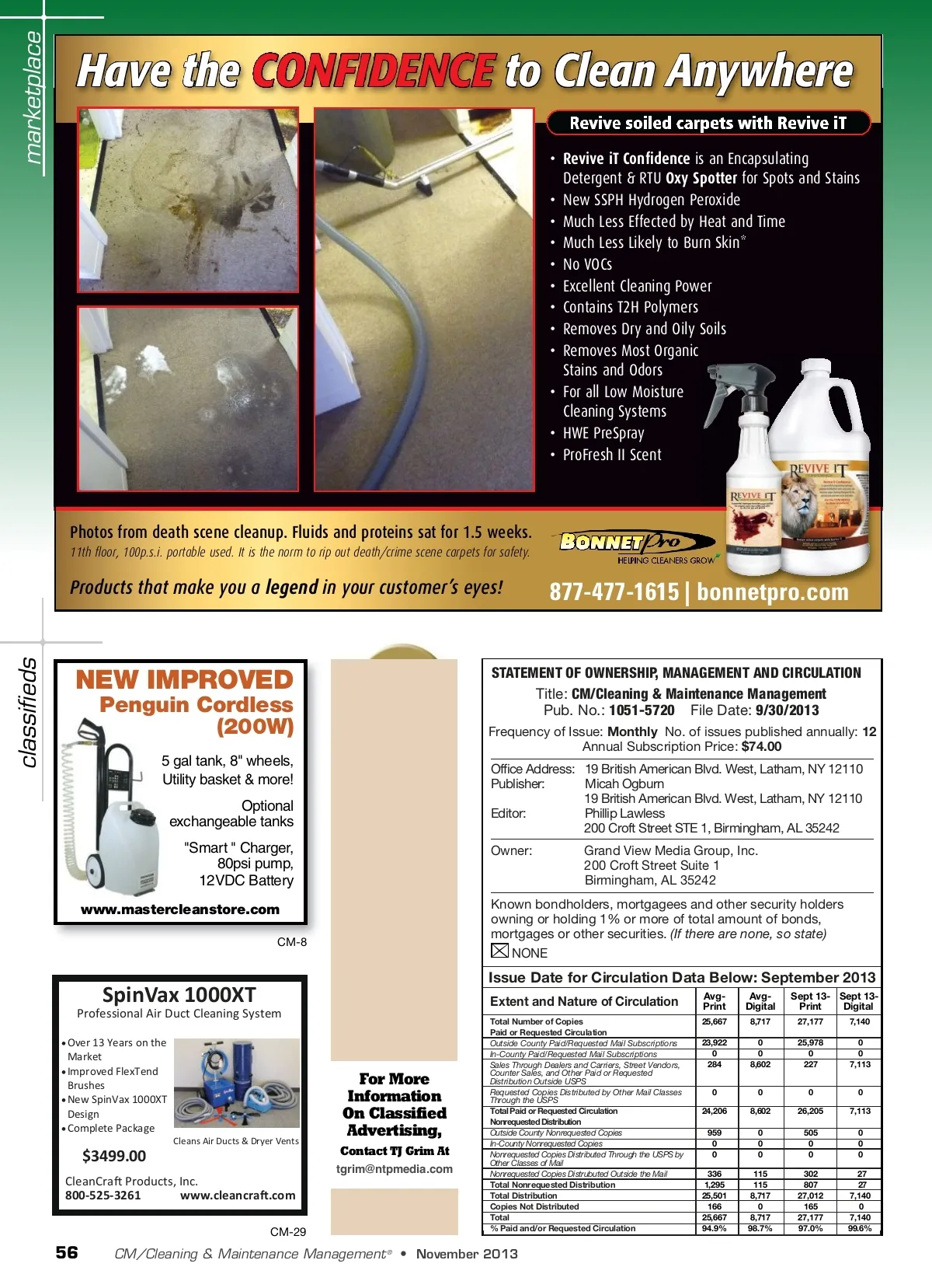 marketplace Have the CONFIDENCE to Clean Anywhere • Revive iT Confidence is an Encapsulating Detergent & RTU Oxy Spotter for Spots and Stains • New SSPH Hydrogen Peroxide • Much Less Effected by Heat and Time • Much Less Likely to Burn Skin* • No VOCs • Excellent Cleaning Power • Contains T2H Polymers • Removes Dry and Oily Soils • Removes Most Organic Stains and Odors • For all Low Moisture Cleaning Systems • HWE PreSpray • ProFresh II Scent AM Page 1 Photos from death scene cleanup. Fluids and proteins sat for 1.5 weeks. 11th floor, 100p.s.i. portable used. It is the norm to rip out death/crime scene carpets for safety. Products that make you a legend in your customer’s eyes! 877-477-1615 | b bonnetpro.com t classifieds NEW IMPROVED Penguin Cordless (200W) 5 gal tank, 8" wheels, Utility basket & more! Optional exchangeable tanks "Smart " Charger, 80psi pump, 12VDC Battery www.mastercleanstore.com CM-8 STATEMENT OF OWNERSHIP, MANAGEMENT AND CIRCULATION Title: CM/Cleaning & Maintenance Management Pub. No.: 1051-5720 File Date: 9/30/2013 Frequency of Issue: Monthly No. of issues published annually: 12 Annual Subscription Price: $74.00 Office Address: 19 British American Blvd. West, Latham, NY 12110 Publisher: Micah Ogburn 19 British American Blvd. West, Latham, NY 12110 Editor: Phillip Lawless 200 Croft Street STE 1, Birmingham, AL 35242 Owner: Grand View Media Group, Inc. 200 Croft Street Suite 1 Birmingham, AL 35242 Known bondholders, mortgagees and other security holders owning or holding 1% or more of total amount of bonds, mortgages or other securities. (If there are none, so state) NONE Professional Air Duct Cleaning System Over 13 Years on the SpinVax 1000XT Issue Date for Circulation Data Below: September 2013 Extent and Nature of Circulation Total Number of Copies Paid or Requested Circulation Outside County Paid/Requested Mail Subscriptions In-County Paid/Requested Mail Subscriptions Sales Through Dealers and Carriers, Street Vendors, Counter Sales, and Other Paid or Requested Distribution Outside USPS Requested Copies Distributed by Other Mail Classes Through the USPS Total Paid or Requested Circulation Nonrequested Distribution Outside County Nonrequested Copies In-County Nonrequested Copies Nonrequested Copies Distributed Through the USPS by Other Classes of Mail Nonrequested Copies Distrubuted Outside the Mail Total Nonrequested Distribution Total Distribution Copies Not Distributed Total % Paid and/or Requested Circulation Avg-Print 25,667 23,922 0 284 0 24,206 959 0 0 336 1,295 25,501 166 25,667 94.9% Avg-Digital 8,717 0 0 8,602 0 8,602 0 0 0 115 115 8,717 0 8,717 98.7% Sept 13-Sept 13-Print Digital 27,177 25,978 0 227 0 26,205 505 0 0 302 807 27,012 165 27,177 97.0% 7,140 0 0 7,113 0 7,113 0 0 0 27 27 7,140 0 7,140 99.6% Market Improved FlexTend Brushes New SpinVax 1000XT Design Complete Package $3499.00 Cleans Air Ducts & Dryer Vents For More Information On Classified Advertising, Contact TJ Grim At [email protected] CleanCra � Products, Inc. 800‐525‐3261 www.cleancra�.com CM-29 56 CM/Cleaning & Maintenance Management ® • November 2013