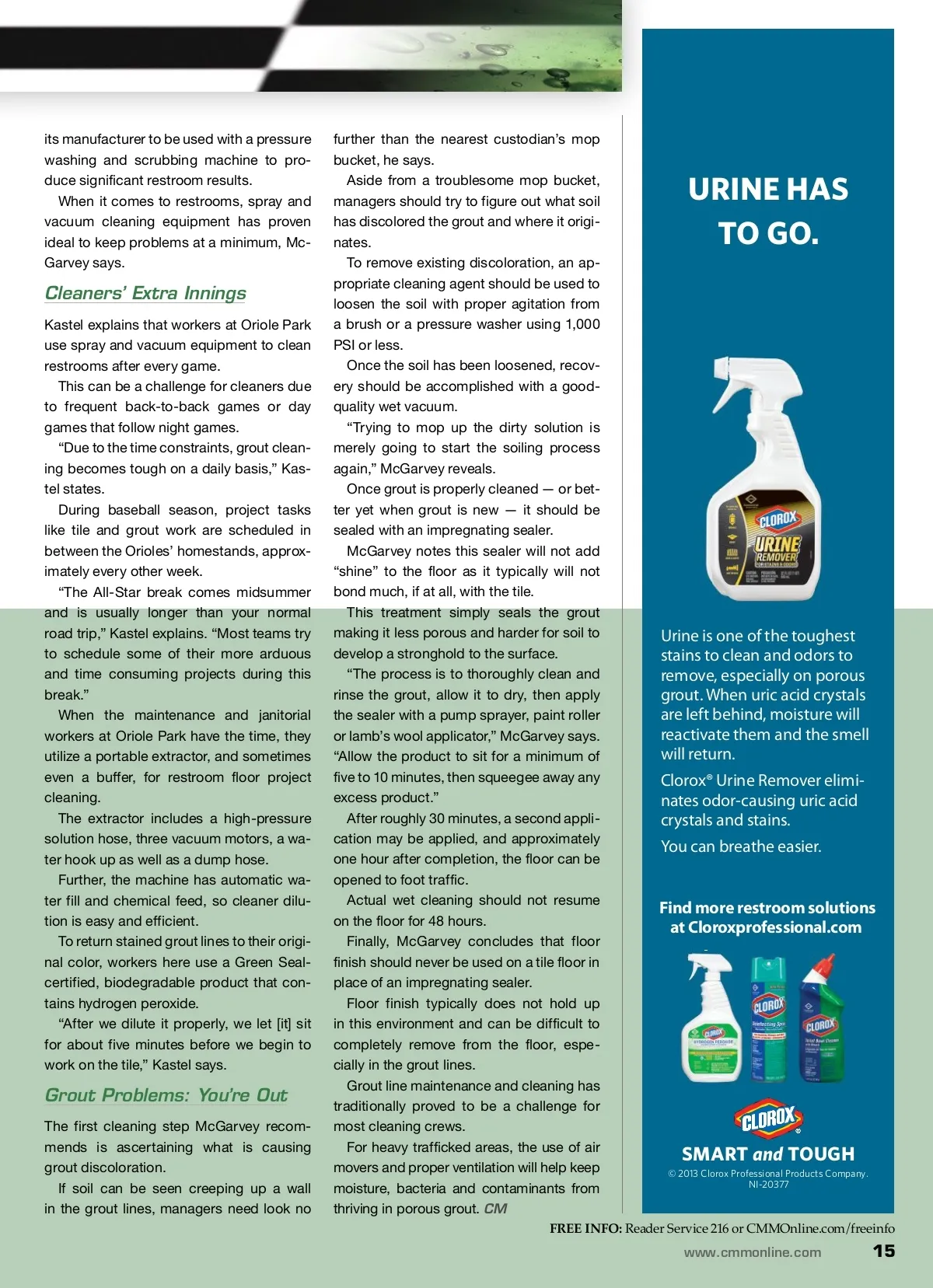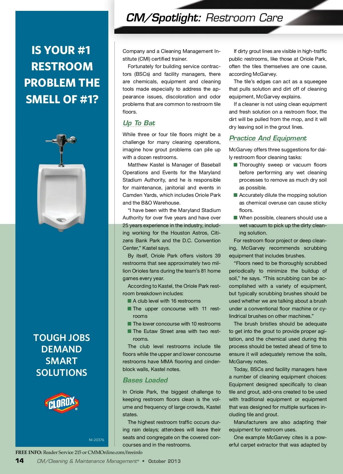 CM/Spotlight: Restroom Care IS YOUR #1 RESTROOM PROBLEM THE SMELL OF #1? Company and a Cleaning Management In-stitute (CMI) certified trainer. Fortunately for building service contrac-tors (BSCs) and facility managers, there are chemicals, equipment and cleaning tools made especially to address the ap-pearance issues, discoloration and odor problems that are common to restroom tile floors. Up To Bat While three or four tile floors might be a challenge for many cleaning operations, imagine how grout problems can pile up with a dozen restrooms. Matthew Kastel is Manager of Baseball Operations and Events for the Maryland Stadium Authority, and he is responsible for maintenance, janitorial and events in Camden Yards, which includes Oriole Park and the B&O Warehouse. “I have been with the Maryland Stadium Authority for over five years and have over 25 years experience in the industry, includ-ing working for the Houston Astros, Citi-zens Bank Park and the D.C. Convention Center,” Kastel says. By itself, Oriole Park offers visitors 39 restrooms that see approximately two mil-lion Orioles fans during the team’s 81 home games every year. According to Kastel, the Oriole Park rest-room breakdown includes: ■ A club level with 16 restrooms ■ The upper concourse with 11 rest-rooms ■ The lower concourse with 10 restrooms ■ The Eutaw Street area with two rest-rooms. The club level restrooms include tile floors while the upper and lower concourse restrooms have MMA flooring and cinder-block walls, Kastel notes. If dirty grout lines are visible in high-traffic public restrooms, like those at Oriole Park, often the tiles themselves are one cause, according McGarvey. The tile’s edges can act as a squeegee that pulls solution and dirt off of cleaning equipment, McGarvey explains. If a cleaner is not using clean equipment and fresh solution on a restroom floor, the dirt will be pulled from the mop, and it will dry leaving soil in the grout lines. Practice And Equipment McGarvey offers three suggestions for dai-ly restroom floor cleaning tasks: ■ Thoroughly sweep or vacuum floors before performing any wet cleaning processes to remove as much dry soil as possible. ■ Accurately dilute the mopping solution as chemical overuse can cause sticky floors. ■ When possible, cleaners should use a wet vacuum to pick up the dirty clean-ing solution. For restroom floor project or deep clean-ing, McGarvey recommends scrubbing equipment that includes brushes. “Floors need to be thoroughly scrubbed periodically to minimize the buildup of soil,” he says. “This scrubbing can be ac-complished with a variety of equipment, but typically scrubbing brushes should be used whether we are talking about a brush under a conventional floor machine or cy-lindrical brushes on other machines.” The brush bristles should be adequate to get into the grout to provide proper agi-tation, and the chemical used during this process should be tested ahead of time to ensure it will adequately remove the soils, McGarvey notes. Today, BSCs and facility managers have a number of cleaning equipment choices: Equipment designed specifically to clean tile and grout, add-ons created to be used with traditional equipment or equipment that was designed for multiple surfaces in-cluding tile and grout. Manufacturers are also adapting their equipment for restroom uses. One example McGarvey cites is a pow-erful carpet extractor that was adapted by TOUGH JOBS DEMAND SMART SOLUTIONS Bases Loaded In Oriole Park, the biggest challenge to keeping restroom floors clean is the vol-ume and frequency of large crowds, Kastel states. The highest restroom traffic occurs dur-ing rain delays; attendees will leave their seats and congregate on the covered con-courses and in the restrooms. NI-20376 FREE INFO: Reader Service 215 or CMMOnline.com/freeinfo 14 CM/Cleaning & Maintenance Management ® • October 2013