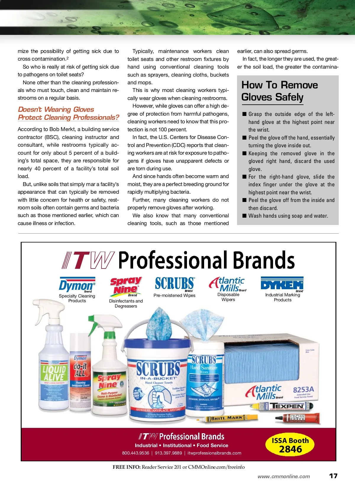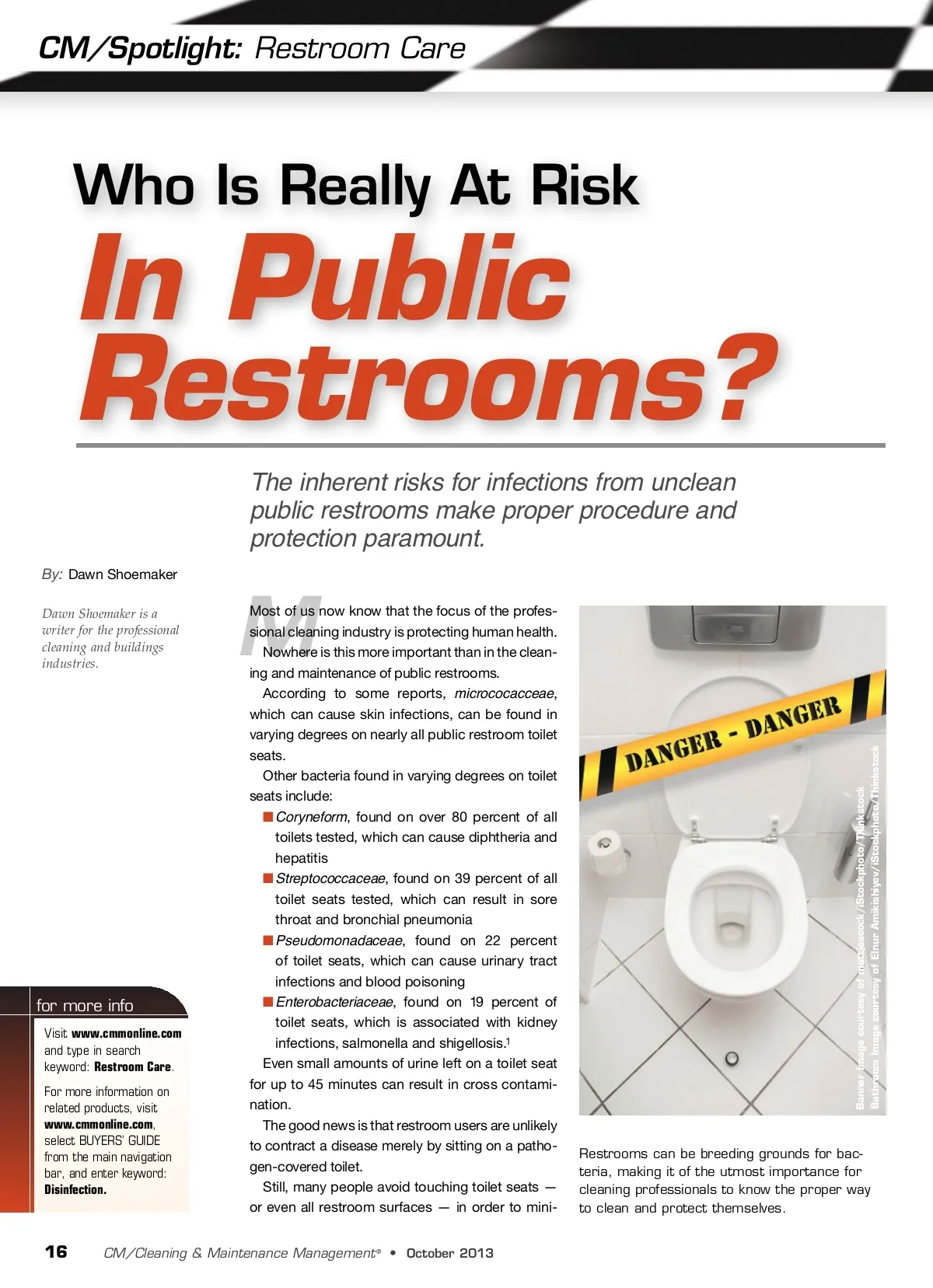 CM/Spotlight: Restroom Care Who Is Really At Risk In Public Restrooms? The inherent risks for infections from unclean public restrooms make proper procedure and protection paramount. By: Dawn Shoemaker Dawn Shoemaker is a writer for the professional cleaning and buildings industries. M for more info Visit www.cmmonline.com and type in search keyword: Restroom Care . For more information on related products, visit www.cmmonline.com , select BUYERS’ GUIDE from the main navigation bar, and enter keyword: Disinfection. Most of us now know that the focus of the profes-sional cleaning industry is protecting human health. Nowhere is this more important than in the clean-ing and maintenance of public restrooms. According to some reports, micrococacceae , which can cause skin infections, can be found in varying degrees on nearly all public restroom toilet seats. Other bacteria found in varying degrees on toilet seats include: ■ Coryneform , found on over 80 percent of all toilets tested, which can cause diphtheria and hepatitis ■ Streptococcaceae , found on 39 percent of all toilet seats tested, which can result in sore throat and bronchial pneumonia ■ Pseudomonadaceae , found on 22 percent of toilet seats, which can cause urinary tract infections and blood poisoning ■ Enterobacteriaceae , found on 19 percent of toilet seats, which is associated with kidney infections, salmonella and shigellosis. 1 Even small amounts of urine left on a toilet seat for up to 45 minutes can result in cross contami-nation. The good news is that restroom users are unlikely to contract a disease merely by sitting on a patho-gen-covered toilet. Still, many people avoid touching toilet seats — or even all restroom surfaces — in order to mini-Restrooms can be breeding grounds for bac-teria, making it of the utmost importance for cleaning professionals to know the proper way to clean and protect themselves. 16 CM/Cleaning & Maintenance Management ® • October 2013 Banner Image courtesy of mattjeacock/iStockphoto/Thinkstock Bathroom Image courtesy of Elnur Amikishiyev/iStockphoto/Thinkstock