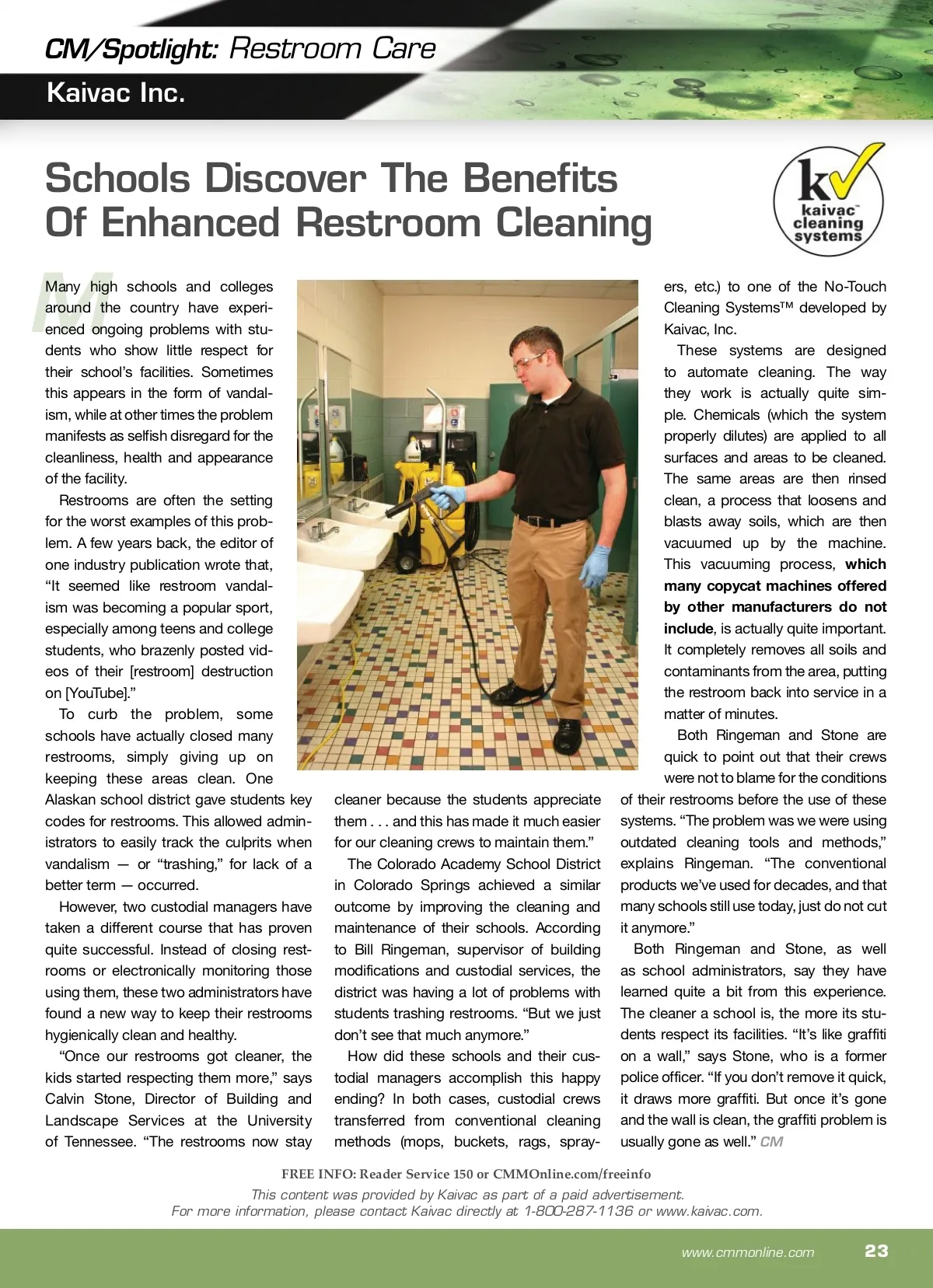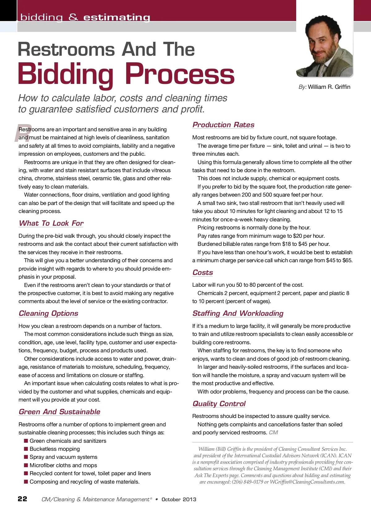 bidding & estimating Restrooms And The Bidding Process How to calculate labor, costs and cleaning times to guarantee satisfied customers and profit. By: William R. Griffin R Restrooms are an important and sensitive area in any building and must be maintained at high levels of cleanliness, sanitation and safety at all times to avoid complaints, liability and a negative impression on employees, customers and the public. Restrooms are unique in that they are often designed for clean-ing, with water and stain resistant surfaces that include vitreous china, chrome, stainless steel, ceramic tile, glass and other rela-tively easy to clean materials. Water connections, floor drains, ventilation and good lighting can also be part of the design that will facilitate and speed up the cleaning process. Production Rates Most restrooms are bid by fixture count, not square footage. The average time per fixture — sink, toilet and urinal — is two to three minutes each. Using this formula generally allows time to complete all the other tasks that need to be done in the restroom. This does not include supply, chemical or equipment costs. If you prefer to bid by the square foot, the production rate gener-ally ranges between 200 and 500 square feet per hour. A small two sink, two stall restroom that isn’t heavily used will take you about 10 minutes for light cleaning and about 12 to 15 minutes for once-a-week heavy cleaning. Pricing restrooms is normally done by the hour. Pay rates range from minimum wage to $20 per hour. Burdened billable rates range from $18 to $45 per hour. If you have less than one hour’s work, it would be best to establish a minimum charge per service call which can range from $45 to $65. What To Look For During the pre-bid walk through, you should closely inspect the restrooms and ask the contact about their current satisfaction with the services they receive in their restrooms. This will give you a better understanding of their concerns and provide insight with regards to where to you should provide em-phasis in your proposal. Even if the restrooms aren’t clean to your standards or that of the prospective customer, it is best to avoid making any negative comments about the level of service or the existing contractor. Costs Labor will run you 50 to 80 percent of the cost. Chemicals 2 percent, equipment 2 percent, paper and plastic 8 to 10 percent (percent of wages). Cleaning Options How you clean a restroom depends on a number of factors. The most common considerations include such things as size, condition, age, use level, facility type, customer and user expecta-tions, frequency, budget, process and products used. Other considerations include access to water and power, drain-age, resistance of materials to moisture, scheduling, frequency, ease of access and limitations on closure or staffing. An important issue when calculating costs relates to what is pro-vided by the customer and what supplies, chemicals and equip-ment will you provide at your cost. Staffing And Workloading If it’s a medium to large facility, it will generally be more productive to train and utilize restroom specialists to clean easily accessible or building core restrooms. When staffing for restrooms, the key is to find someone who enjoys, wants to clean and does of good job of restroom cleaning. In larger and heavily-soiled restrooms, if the surfaces and loca-tion will handle the moisture, a spray and vacuum system will be the most productive and effective. With odor problems, frequency and process can be the cause. Quality Control Restrooms should be inspected to assure quality service. Nothing gets complaints and cancellations faster than soiled and poorly serviced restrooms. CM William (Bill) Griffin is the president of Cleaning Consultant Services Inc. and president of the International Custodial Advisors Network (ICAN). ICAN is a nonprofit association comprised of industry professionals providing free con-sultation services through the Cleaning Management Institute (CMI) and their Ask The Experts page. Comments and questions about bidding and estimating are encouraged: (206) 849-0179 or [email protected]. Green And Sustainable Restrooms offer a number of options to implement green and sustainable cleaning processes; this includes such things as: ■ Green chemicals and sanitizers ■ Bucketless mopping ■ Spray and vacuum systems ■ Microfiber cloths and mops ■ Recycled content for towel, toilet paper and liners ■ Composing and recycling of waste materials. 22 CM/Cleaning & Maintenance Management ® • October 2013