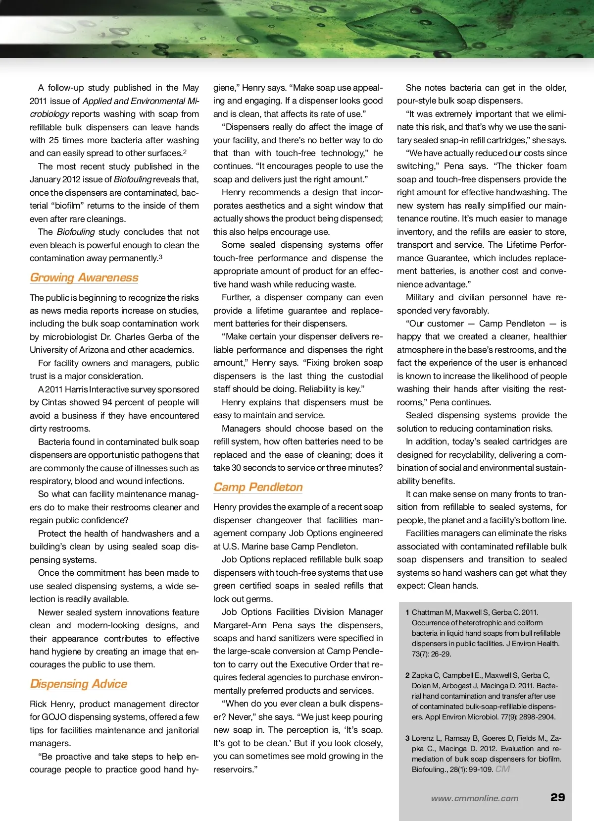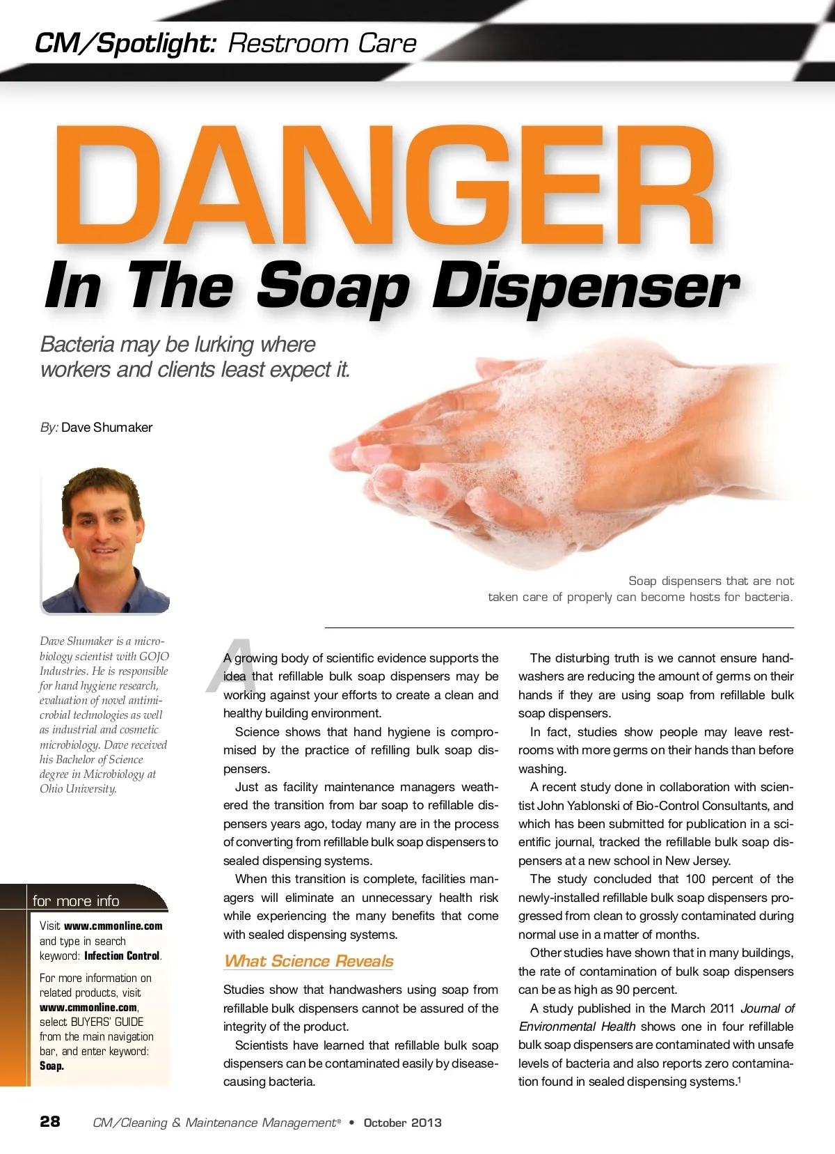 CM/Spotlight: Restroom Care In The Soap Dispenser Bacteria may be lurking where workers and clients least expect it. By: Dave Shumaker DANGER A A growing body of scientific evidence supports the idea that refillable bulk soap dispensers may be working against your efforts to create a clean and healthy building environment. Science shows that hand hygiene is compro-mised by the practice of refilling bulk soap dis-pensers. Just as facility maintenance managers weath-ered the transition from bar soap to refillable dis-pensers years ago, today many are in the process of converting from refillable bulk soap dispensers to sealed dispensing systems. When this transition is complete, facilities man-agers will eliminate an unnecessary health risk while experiencing the many benefits that come with sealed dispensing systems. Soap dispensers that are not taken care of properly can become hosts for bacteria. Dave Shumaker is a micro-biology scientist with GOJO Industries. He is responsible for hand hygiene research, evaluation of novel antimi-crobial technologies as well as industrial and cosmetic microbiology. Dave received his Bachelor of Science degree in Microbiology at Ohio University. for more info Visit www.cmmonline.com and type in search keyword: Infection Control . For more information on related products, visit www.cmmonline.com , select BUYERS’ GUIDE from the main navigation bar, and enter keyword: Soap. What Science Reveals Studies show that handwashers using soap from refillable bulk dispensers cannot be assured of the integrity of the product. Scientists have learned that refillable bulk soap dispensers can be contaminated easily by disease-causing bacteria. The disturbing truth is we cannot ensure hand-washers are reducing the amount of germs on their hands if they are using soap from refillable bulk soap dispensers. In fact, studies show people may leave rest-rooms with more germs on their hands than before washing. A recent study done in collaboration with scien-tist John Yablonski of Bio-Control Consultants, and which has been submitted for publication in a sci-entific journal, tracked the refillable bulk soap dis-pensers at a new school in New Jersey. The study concluded that 100 percent of the newly-installed refillable bulk soap dispensers pro-gressed from clean to grossly contaminated during normal use in a matter of months. Other studies have shown that in many buildings, the rate of contamination of bulk soap dispensers can be as high as 90 percent. A study published in the March 2011 Journal of Environmental Health shows one in four refillable bulk soap dispensers are contaminated with unsafe levels of bacteria and also reports zero contamina-tion found in sealed dispensing systems. 1 28 CM/Cleaning & Maintenance Management ® • October 2013