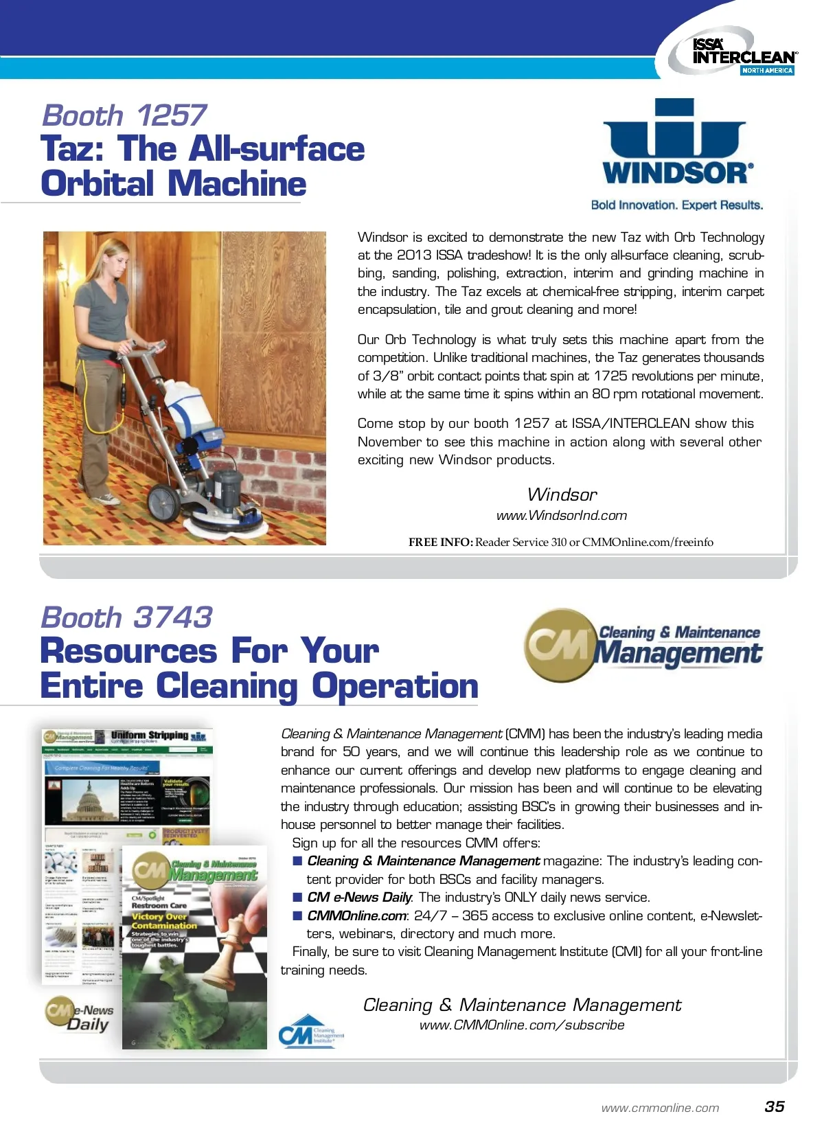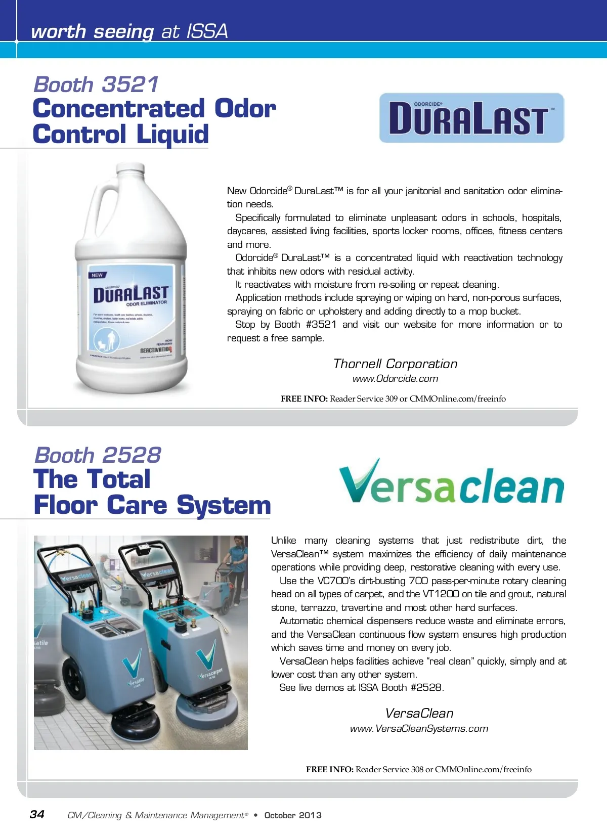 worth seeing at ISSA Booth 3521 Concentrated Odor Control Liquid New Odorcide ® DuraLast™ is for all your janitorial and sanitation odor elimina-tion needs. Specifically formulated to eliminate unpleasant odors in schools, hospitals, daycares, assisted living facilities, sports locker rooms, offices, fitness centers and more. Odorcide ® DuraLast™ is a concentrated liquid with reactivation technology that inhibits new odors with residual activity. It reactivates with moisture from re-soiling or repeat cleaning. Application methods include spraying or wiping on hard, non-porous surfaces, spraying on fabric or upholstery and adding directly to a mop bucket. Stop by Booth #3521 and visit our website for more information or to request a free sample. Thornell Corporation www.Odorcide.com FREE INFO: Reader Service 309 or CMMOnline.com/freeinfo Booth 2528 The Total Floor Care System Unlike many cleaning systems that just redistribute dirt, the VersaClean™ system maximizes the efficiency of daily maintenance operations while providing deep, restorative cleaning with every use. Use the VC700’s dirt-busting 700 pass-per-minute rotary cleaning head on all types of carpet, and the VT1200 on tile and grout, natural stone, terrazzo, travertine and most other hard surfaces. Automatic chemical dispensers reduce waste and eliminate errors, and the VersaClean continuous flow system ensures high production which saves time and money on every job. VersaClean helps facilities achieve “real clean” quickly, simply and at lower cost than any other system. See live demos at ISSA Booth #2528. VersaClean www.VersaCleanSystems.com FREE INFO: Reader Service 308 or CMMOnline.com/freeinfo 34 CM/Cleaning & Maintenance Management ® • October2013