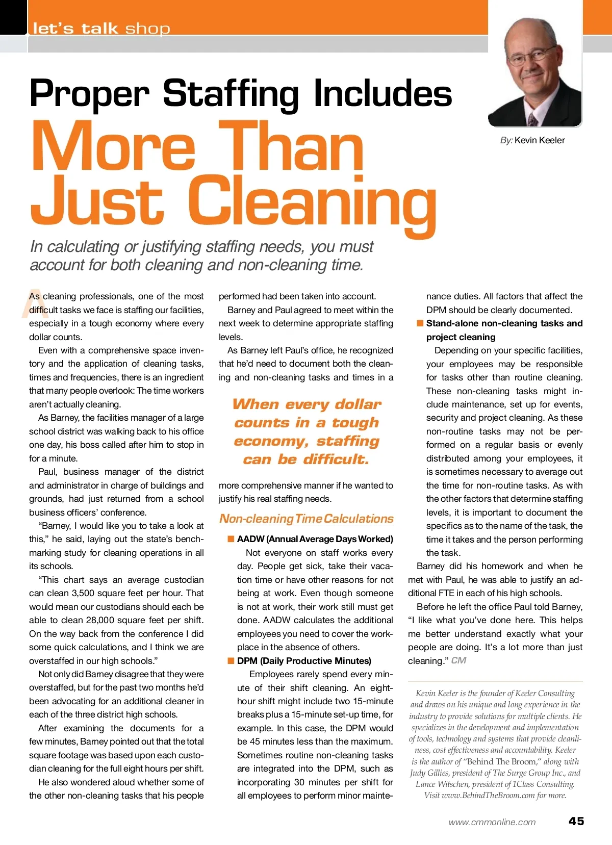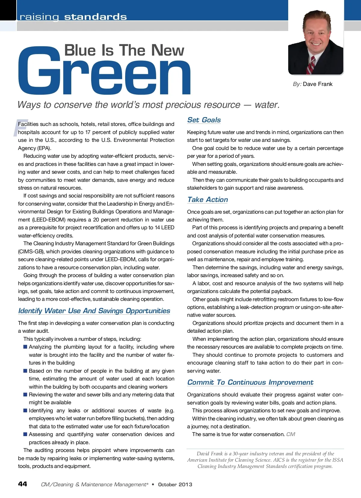 raising standards Green F Facilities such as schools, hotels, retail stores, office buildings and hospitals account for up to 17 percent of publicly supplied water use in the U.S., according to the U.S. Environmental Protection Agency (EPA). Reducing water use by adopting water-efficient products, servic-es and practices in these facilities can have a great impact in lower-ing water and sewer costs, and can help to meet challenges faced by communities to meet water demands, save energy and reduce stress on natural resources. If cost savings and social responsibility are not sufficient reasons for conserving water, consider that the Leadership in Energy and En-vironmental Design for Existing Buildings Operations and Manage-ment (LEED-EBOM) requires a 20 percent reduction in water use as a prerequisite for project recertification and offers up to 14 LEED water-efficiency credits. The Cleaning Industry Management Standard for Green Buildings (CIMS-GB), which provides cleaning organizations with guidance to secure cleaning-related points under LEED-EBOM, calls for organi-zations to have a resource conservation plan, including water. Going through the process of building a water conservation plan helps organizations identify water use, discover opportunities for sav-ings, set goals, take action and commit to continuous improvement, leading to a more cost-effective, sustainable cleaning operation. Blue Is The New By: Dave Frank Ways to conserve the world’s most precious resource — water. Set Goals Keeping future water use and trends in mind, organizations can then start to set targets for water use and savings. One goal could be to reduce water use by a certain percentage per year for a period of years. When setting goals, organizations should ensure goals are achiev-able and measurable. Then they can communicate their goals to building occupants and stakeholders to gain support and raise awareness. Take Action Once goals are set, organizations can put together an action plan for achieving them. Part of this process is identifying projects and preparing a benefit and cost analysis of potential water conservation measures. Organizations should consider all the costs associated with a pro-posed conservation measure including the initial purchase price as well as maintenance, repair and employee training. Then determine the savings, including water and energy savings, labor savings, increased safety and so on. A labor, cost and resource analysis of the two systems will help organizations calculate the potential payback. Other goals might include retrofitting restroom fixtures to low-flow options, establishing a leak-detection program or using on-site alter-native water sources. Organizations should prioritize projects and document them in a detailed action plan. When implementing the action plan, organizations should ensure the necessary resources are available to complete projects on time. They should continue to promote projects to customers and encourage cleaning staff to take action to do their part in con-serving water. Identify Water Use And Savings Opportunities The first step in developing a water conservation plan is conducting a water audit. This typically involves a number of steps, including: ■ Analyzing the plumbing layout for a facility, including where water is brought into the facility and the number of water fix-tures in the building ■ Based on the number of people in the building at any given time, estimating the amount of water used at each location within the building by both occupants and cleaning workers ■ Reviewing the water and sewer bills and any metering data that might be available ■ Identifying any leaks or additional sources of waste (e.g. employees who let water run before filling buckets), then adding that data to the estimated water use for each fixture/location ■ Assessing and quantifying water conservation devices and practices already in place. The auditing process helps pinpoint where improvements can be made by repairing leaks or implementing water-saving systems, tools, products and equipment. Commit To Continuous Improvement Organizations should evaluate their progress against water con-servation goals by reviewing water bills, goals and action plans. This process allows organizations to set new goals and improve. Within the cleaning industry, we often talk about green cleaning as a journey, not a destination. The same is true for water conservation. CM David Frank is a 30-year industry veteran and the president of the American Institute for Cleaning Science. AICS is the registrar for the ISSA Cleaning Industry Management Standards certification program. 44 CM/Cleaning & Maintenance Management ® • October 2013
