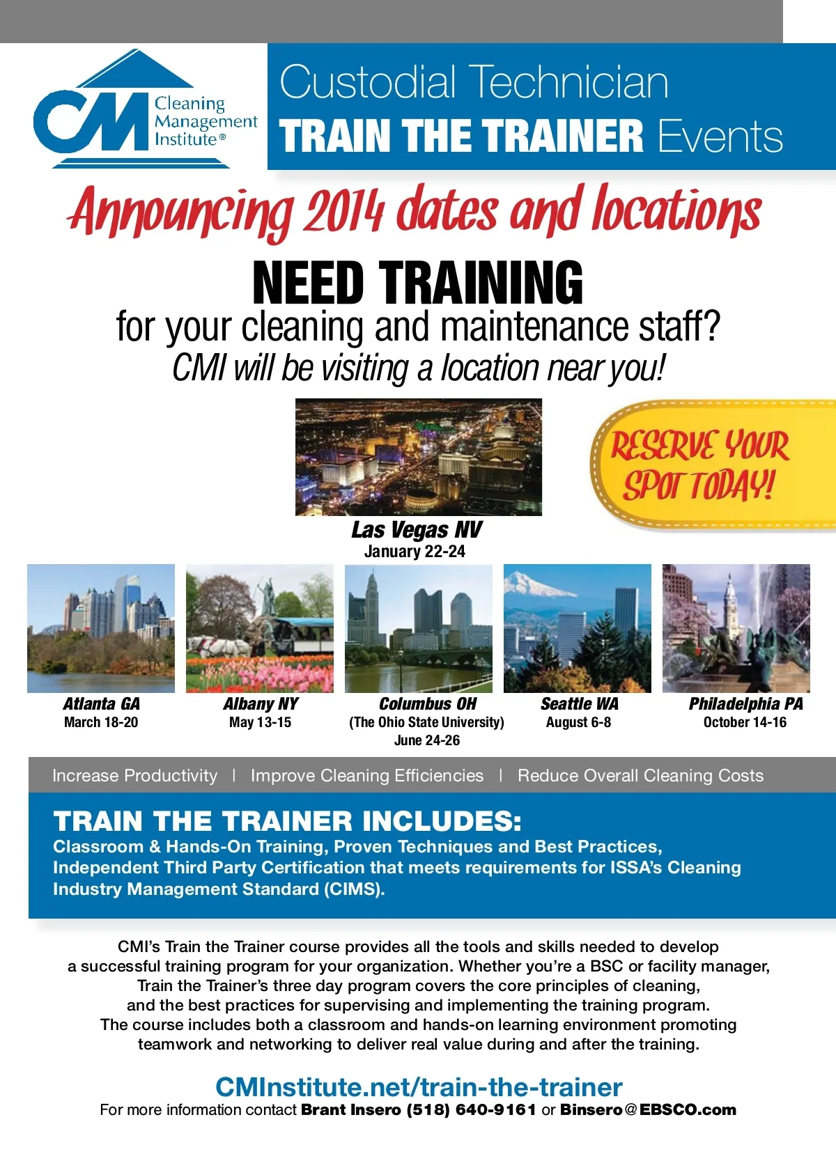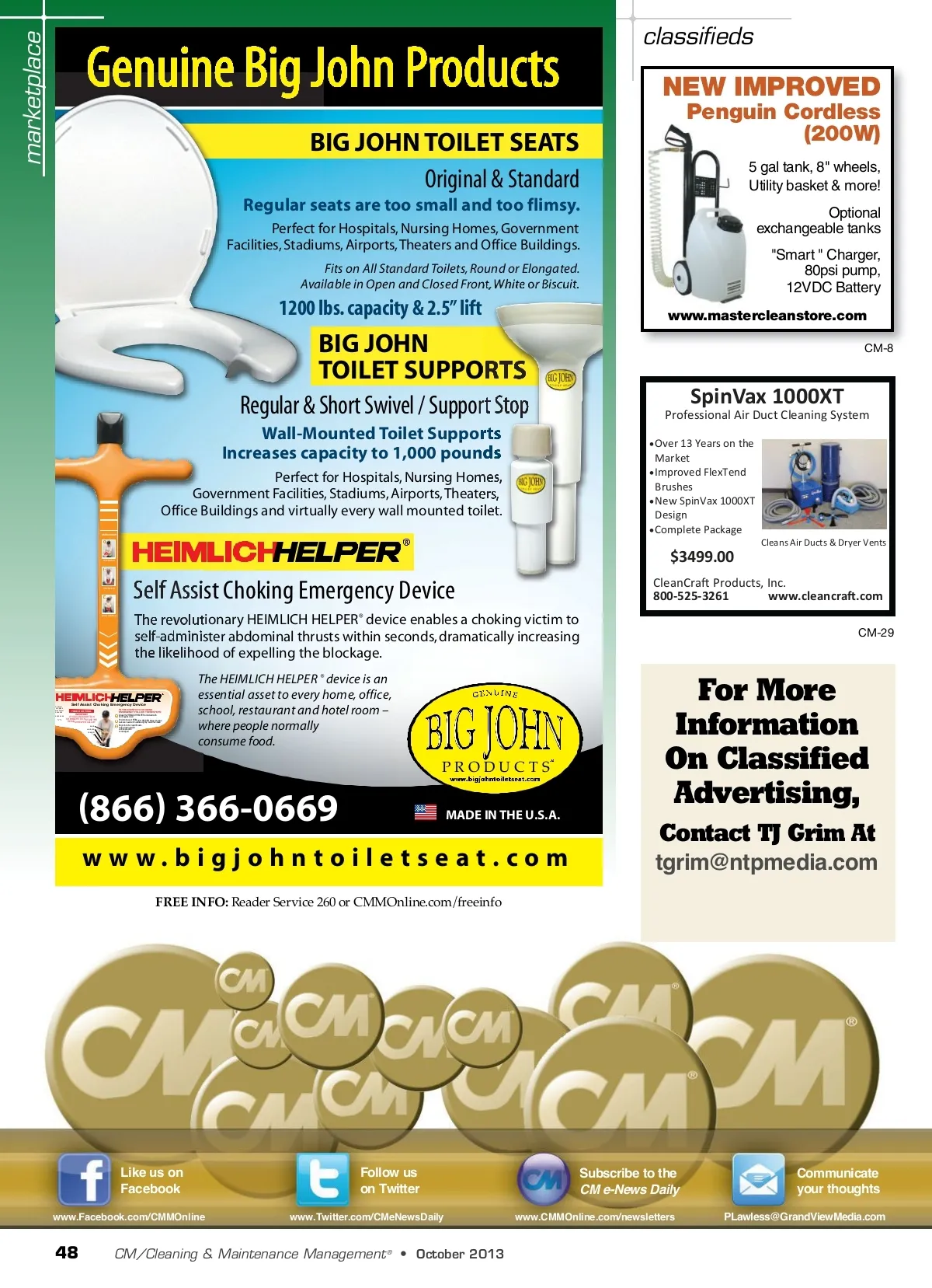marketplace Genuine Big John Products BIG JOHN TOILET SEATS Original & Standard Regular seats are too small and too flimsy. Perfect for Hospitals, Nursing Homes, Government Facilities, Stadiums, Airports, Theaters and Office Buildings. Fits on All Standard Toilets, Round or Elongated. Available in Open and Closed Front, White or Biscuit. classifieds NEW IMPROVED Penguin Cordless (200W) 5 gal tank, 8" wheels, Utility basket & more! Optional exchangeable tanks "Smart " Charger, 80psi pump, 12VDC Battery www.mastercleanstore.com CM-8 1200 lbs. capacity & 2.5” lift BIG JOHN TOILET SUPPORTS Regular & Short Swivel / Support Stop Wall-Mounted Toilet Supports Increases capacity to 1,000 pounds Perfect for Hospitals, Nursing Homes, Government Facilities, Stadiums, Airports, Theaters, Office Buildings and virtually every wall mounted toilet. INSTRUCTIONS: Professional Air Duct Cleaning System Over 13 Years on the Improved FlexTend New SpinVax 1000XT Complete Package SpinVax 1000XT Market Brushes Design Wall Method $3499.00 Cleans Air Ducts & Dryer Vents Table Method Self Assist Choking Emergency Device The revolutionary HEIMLICH HELPER ® device enables a choking victim to self-administer abdominal thrusts within seconds, dramatically increasing the likelihood of expelling the blockage. The HEIMLICH HELPER ® device is an essential asset to every home, office, school, restaurant and hotel room – where people normally consume food. CleanCra � Products, Inc. 800‐525‐3261 www.cleancra�.com CM-29 Assisted Method U.S. Patent No. 6,725,863 Canadian Patent No. 2,444,589 Self Assist Choking Emergency Device TIME IS CRITICAL IMPORTANT: IF YOU CAN COUGH, TALK OR BREATHE, DO NOT USE THE HEIMLICH HELPER. CALL 911 BASE HANDLES RUBBER TIP 1.866.366.0669 MADE IN THE U.S.A. Begin forceful, rapid thrusts inward and upward until obstruction is dislodged Position base of HEIMLICH HELPER below rib cage & above navel with handles slightly lower than base IN THE EVENT OF A CHOKING EMERGENCY FOLLOW THESE STEPS: Grasp the HEIMLICH HELPER and stand with back against wall PRODUCTS (866) 366-0669 For More Information On Classified Advertising, Contact TJ Grim At [email protected] MADE IN THE U.S.A. www.bigjohntoiletseat.com FREE INFO: Reader Service 260 or CMMOnline.com/freeinfo Like us on Facebook www.Facebook.com/CMMOnline Follow us on Twitter www.Twitter.com/CMeNewsDaily Subscribe to the CM e-News Daily www.CMMOnline.com/newsletters Communicate your thoughts [email protected] 48 CM/Cleaning & Maintenance Management ® • October 2013