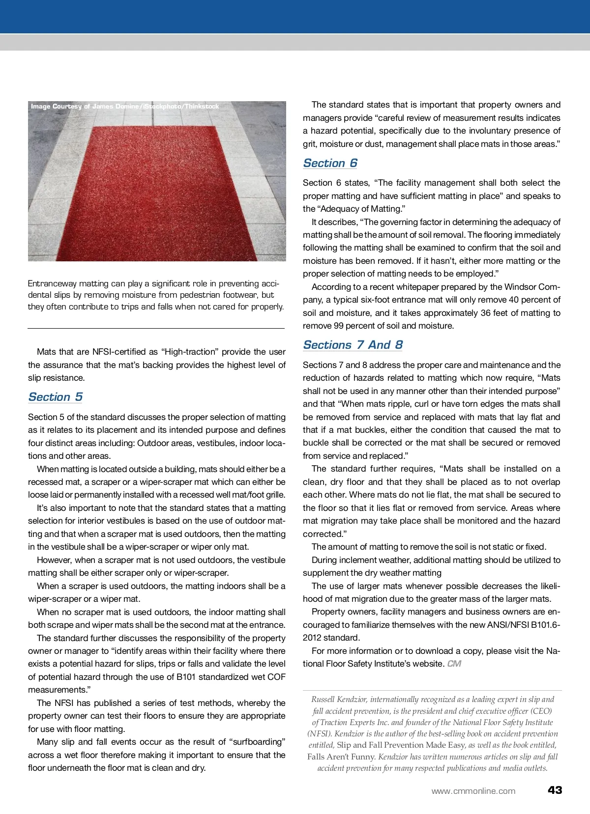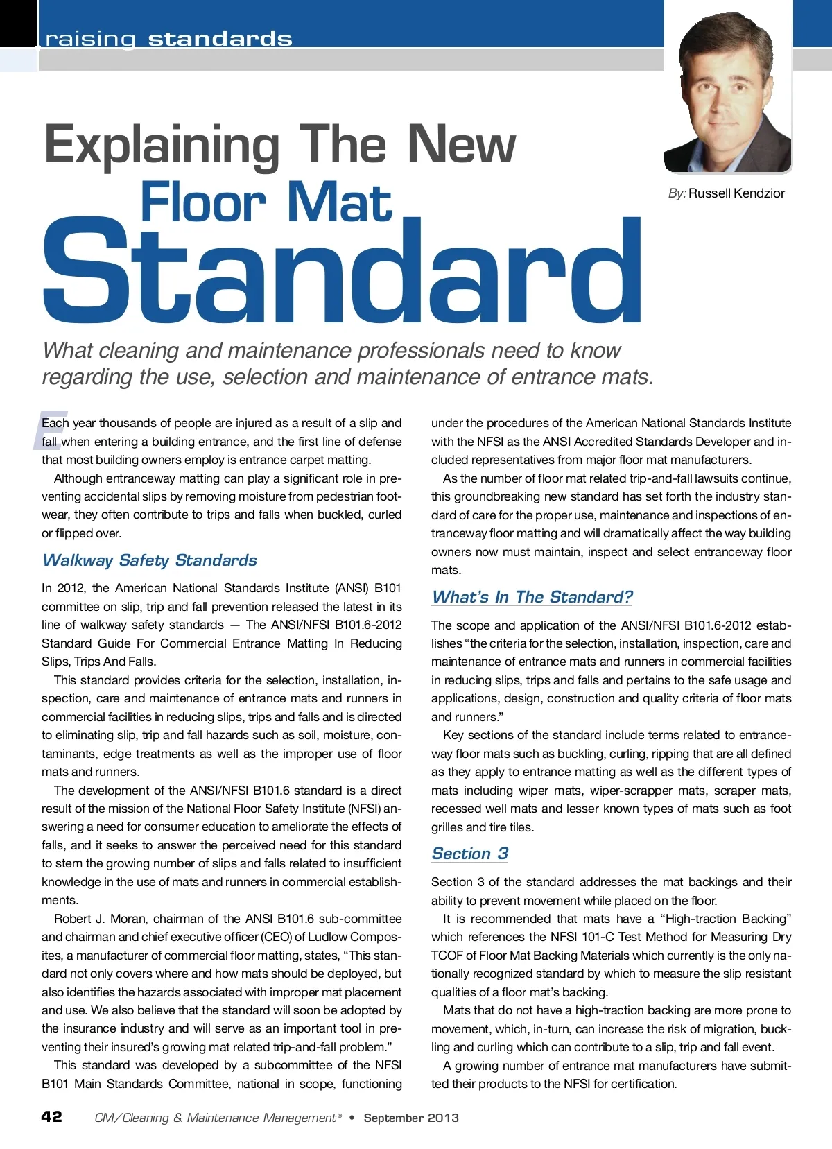 raising standards Explaining The New Standard E Each year thousands of people are injured as a result of a slip and fall when entering a building entrance, and the first line of defense that most building owners employ is entrance carpet matting. Although entranceway matting can play a significant role in pre-venting accidental slips by removing moisture from pedestrian foot-wear, they often contribute to trips and falls when buckled, curled or flipped over. Floor Mat By: Russell Kendzior What cleaning and maintenance professionals need to know regarding the use, selection and maintenance of entrance mats. under the procedures of the American National Standards Institute with the NFSI as the ANSI Accredited Standards Developer and in-cluded representatives from major floor mat manufacturers. As the number of floor mat related trip-and-fall lawsuits continue, this groundbreaking new standard has set forth the industry stan-dard of care for the proper use, maintenance and inspections of en-tranceway floor matting and will dramatically affect the way building owners now must maintain, inspect and select entranceway floor mats. Walkway Safety Standards In 2012, the American National Standards Institute (ANSI) B101 committee on slip, trip and fall prevention released the latest in its line of walkway safety standards — The ANSI/NFSI B101.6-2012 Standard Guide For Commercial Entrance Matting In Reducing Slips, Trips And Falls. This standard provides criteria for the selection, installation, in-spection, care and maintenance of entrance mats and runners in commercial facilities in reducing slips, trips and falls and is directed to eliminating slip, trip and fall hazards such as soil, moisture, con-taminants, edge treatments as well as the improper use of floor mats and runners. The development of the ANSI/NFSI B101.6 standard is a direct result of the mission of the National Floor Safety Institute (NFSI) an-swering a need for consumer education to ameliorate the effects of falls, and it seeks to answer the perceived need for this standard to stem the growing number of slips and falls related to insufficient knowledge in the use of mats and runners in commercial establish-ments. Robert J. Moran, chairman of the ANSI B101.6 sub-committee and chairman and chief executive officer (CEO) of Ludlow Compos-ites, a manufacturer of commercial floor matting, states, “This stan-dard not only covers where and how mats should be deployed, but also identifies the hazards associated with improper mat placement and use. We also believe that the standard will soon be adopted by the insurance industry and will serve as an important tool in pre-venting their insured’s growing mat related trip-and-fall problem.” This standard was developed by a subcommittee of the NFSI B101 Main Standards Committee, national in scope, functioning What’s In The Standard? The scope and application of the ANSI/NFSI B101.6-2012 estab-lishes “the criteria for the selection, installation, inspection, care and maintenance of entrance mats and runners in commercial facilities in reducing slips, trips and falls and pertains to the safe usage and applications, design, construction and quality criteria of floor mats and runners.” Key sections of the standard include terms related to entrance-way floor mats such as buckling, curling, ripping that are all defined as they apply to entrance matting as well as the different types of mats including wiper mats, wiper-scrapper mats, scraper mats, recessed well mats and lesser known types of mats such as foot grilles and tire tiles. Section 3 Section 3 of the standard addresses the mat backings and their ability to prevent movement while placed on the floor. It is recommended that mats have a “High-traction Backing” which references the NFSI 101-C Test Method for Measuring Dry TCOF of Floor Mat Backing Materials which currently is the only na-tionally recognized standard by which to measure the slip resistant qualities of a floor mat’s backing. Mats that do not have a high-traction backing are more prone to movement, which, in-turn, can increase the risk of migration, buck-ling and curling which can contribute to a slip, trip and fall event. A growing number of entrance mat manufacturers have submit-ted their products to the NFSI for certification. 42 CM/Cleaning & Maintenance Management ® • September 2013