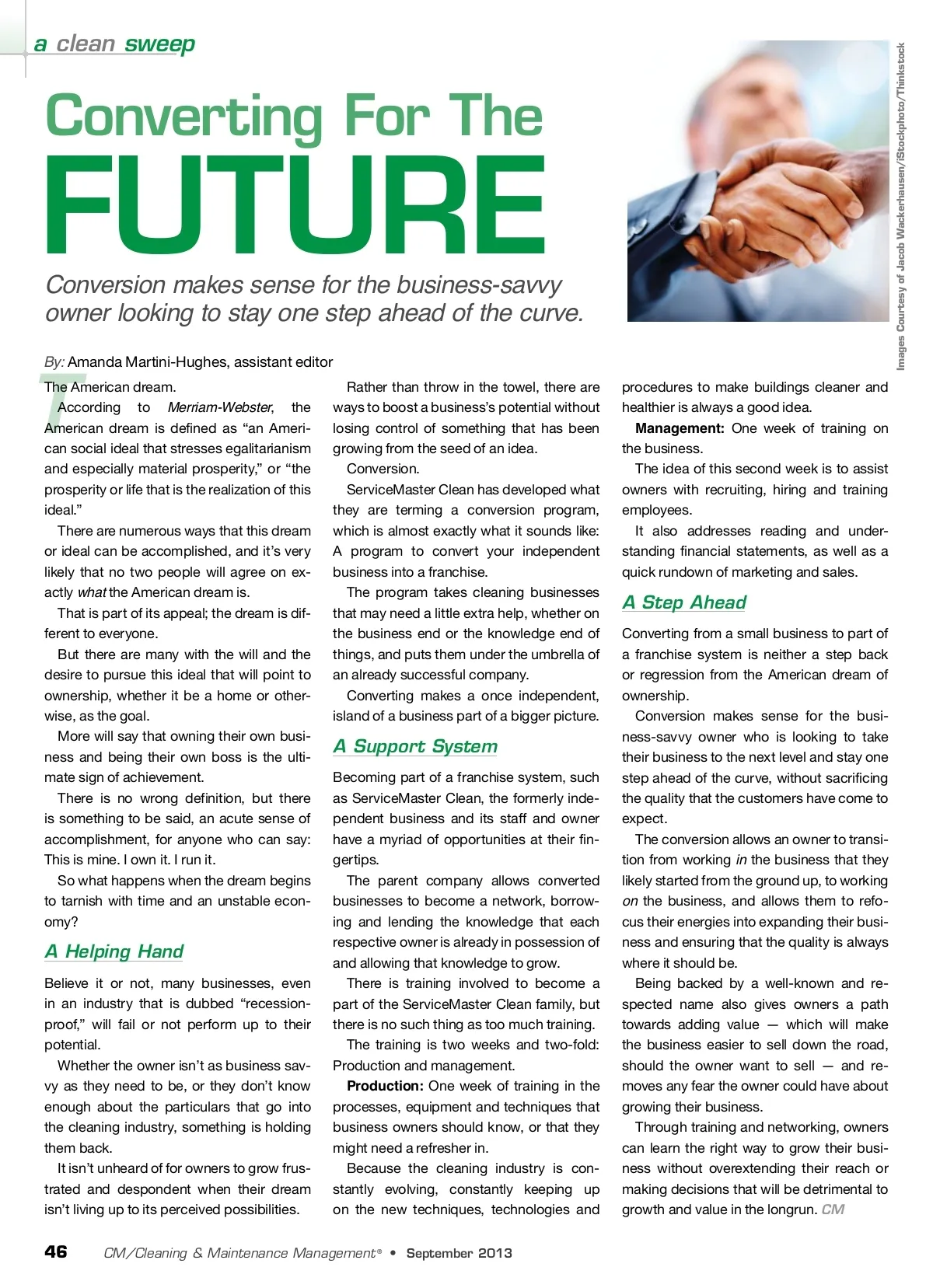 Converting For The FUTURE By: Amanda Martini-Hughes, assistant editor Conversion makes sense for the business-savvy owner looking to stay one step ahead of the curve. The American dream. According to Merriam-Webster , the American dream is defined as “an Ameri-can social ideal that stresses egalitarianism and especially material prosperity,” or “the prosperity or life that is the realization of this ideal.” There are numerous ways that this dream or ideal can be accomplished, and it’s very likely that no two people will agree on ex-actly what the American dream is. That is part of its appeal; the dream is dif-ferent to everyone. But there are many with the will and the desire to pursue this ideal that will point to ownership, whether it be a home or other-wise, as the goal. More will say that owning their own busi-ness and being their own boss is the ulti-mate sign of achievement. There is no wrong definition, but there is something to be said, an acute sense of accomplishment, for anyone who can say: This is mine. I own it. I run it. So what happens when the dream begins to tarnish with time and an unstable econ-omy? Rather than throw in the towel, there are ways to boost a business’s potential without losing control of something that has been growing from the seed of an idea. Conversion. ServiceMaster Clean has developed what they are terming a conversion program, which is almost exactly what it sounds like: A program to convert your independent business into a franchise. The program takes cleaning businesses that may need a little extra help, whether on the business end or the knowledge end of things, and puts them under the umbrella of an already successful company. Converting makes a once independent, island of a business part of a bigger picture. procedures to make buildings cleaner and healthier is always a good idea. Management: One week of training on the business. The idea of this second week is to assist owners with recruiting, hiring and training employees. It also addresses reading and under-standing financial statements, as well as a quick rundown of marketing and sales. T A Step Ahead Converting from a small business to part of a franchise system is neither a step back or regression from the American dream of ownership. Conversion makes sense for the busi-ness-savvy owner who is looking to take their business to the next level and stay one step ahead of the curve, without sacrificing the quality that the customers have come to expect. The conversion allows an owner to transi-tion from working in the business that they likely started from the ground up, to working on the business, and allows them to refo-cus their energies into expanding their busi-ness and ensuring that the quality is always where it should be. Being backed by a well-known and re-spected name also gives owners a path towards adding value — which will make the business easier to sell down the road, should the owner want to sell — and re-moves any fear the owner could have about growing their business. Through training and networking, owners can learn the right way to grow their busi-ness without overextending their reach or making decisions that will be detrimental to growth and value in the longrun. CM A Support System Becoming part of a franchise system, such as ServiceMaster Clean, the formerly inde-pendent business and its staff and owner have a myriad of opportunities at their fin-gertips. The parent company allows converted businesses to become a network, borrow-ing and lending the knowledge that each respective owner is already in possession of and allowing that knowledge to grow. There is training involved to become a part of the ServiceMaster Clean family, but there is no such thing as too much training. The training is two weeks and two-fold: Production and management. Production: One week of training in the processes, equipment and techniques that business owners should know, or that they might need a refresher in. Because the cleaning industry is con-stantly evolving, constantly keeping up on the new techniques, technologies and A Helping Hand Believe it or not, many businesses, even in an industry that is dubbed “recession-proof,” will fail or not perform up to their potential. Whether the owner isn’t as business sav-vy as they need to be, or they don’t know enough about the particulars that go into the cleaning industry, something is holding them back. It isn’t unheard of for owners to grow frus-trated and despondent when their dream isn’t living up to its perceived possibilities. 46 CM/Cleaning & Maintenance Management ® • September 2013 Images Courtesy of Jacob Wackerhausen/iStockphoto/Thinkstock a clean sweep